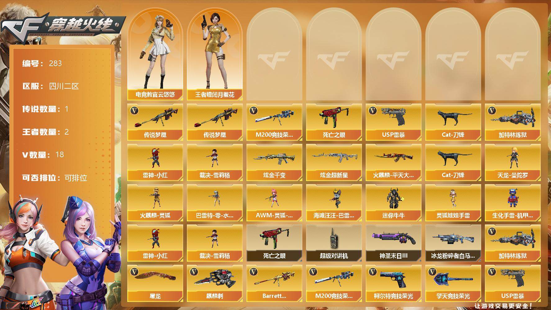 [13035368]【283】17V/88级/将帅/1传说/2王者/2炫金/1英雄/传说梦魇/M200-竞技荣光/死亡之眼/Cat-刀锋/加特林-炼狱/雷神-小红/裁决-雪莉杨/USP雷暴/炫金千变/炫金超新星/火麒麟-平天大圣/王者-瞳-闭月羞花/电竞教官-云悠悠/天龙-曼陀罗/火麒麟-灵狐/巴雷特-零-水下丽影/AWM-灵狐-15周年嘉年华/海滩汪汪-巴雷特/迷你牛牛/灵狐娃娃手雷/生化手雷-机甲核心/超级对讲机/神圣爆裂者-末日/冰龙粉碎者-白马银枪/柯尔特-竞技荣光/擎天-竞技荣光/高爆手雷-竞技荣光/烟雾弹-竞技荣光/闪光弹-竞技荣光/手雷-动感闪耀/Barrett-朱雀/AK47-黑武士-锦绣游龙/黑骑士-海王/M4A1-赤狱骑士/麒麟刺/屠龙
