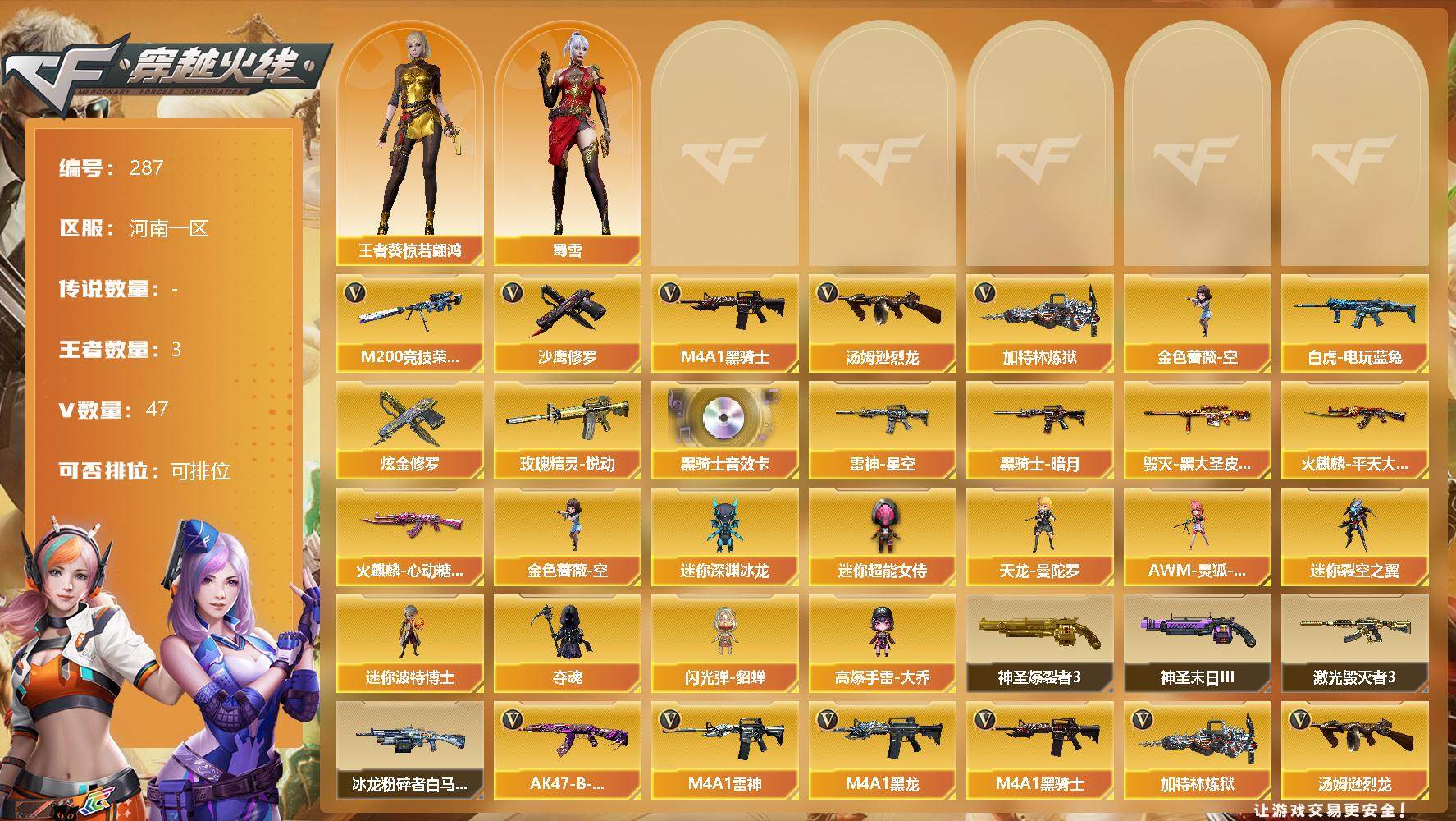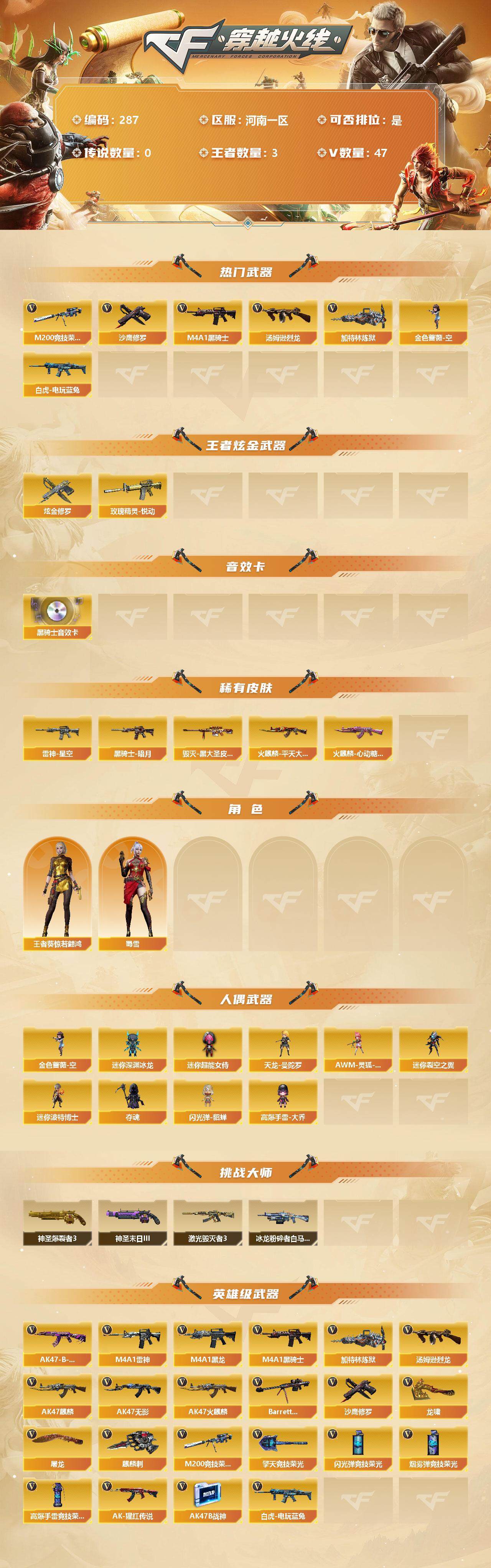 [13035383]【287】47V/100级/元帅/3王者/1炫金/M200-竞技荣光/白虎-电玩蓝兔/M4A1-黑骑士/汤姆逊-烈龙/加特林-炼狱/金色蔷薇-空/沙鹰-修罗/炫金修罗/玫瑰精灵-悦动/M4A1-黑骑士音效卡/雷神-星空/火麒麟-平天大圣/火麒麟-心动糖果/黑骑士-暗月/毁灭-黑大圣皮肤/王者葵-惊若翩鸿/蜀雪/天龙-曼陀罗/AWM-灵狐-15周年嘉年华/迷你深渊冰龙/迷你超能女侍/迷你裂空之翼/迷你波特博士/夺魂/闪光弹-貂蝉/高爆手雷-大乔/神圣爆裂者/神圣爆裂者-末日/激光毁灭者/冰龙粉碎者-白马银枪/擎天-竞技荣光/高爆手雷-竞技荣光/烟雾弹-竞技荣光/闪光弹-竞技荣光/M4A1-雷神/M4A1-黑龙/AK47-麒麟/AK47-无影/AK47-火麒麟/Barrett-毁灭/AK-47-猩红传说/AK47-B-战神/AK47-B-常胜将军/麒麟刺/龙啸/屠龙