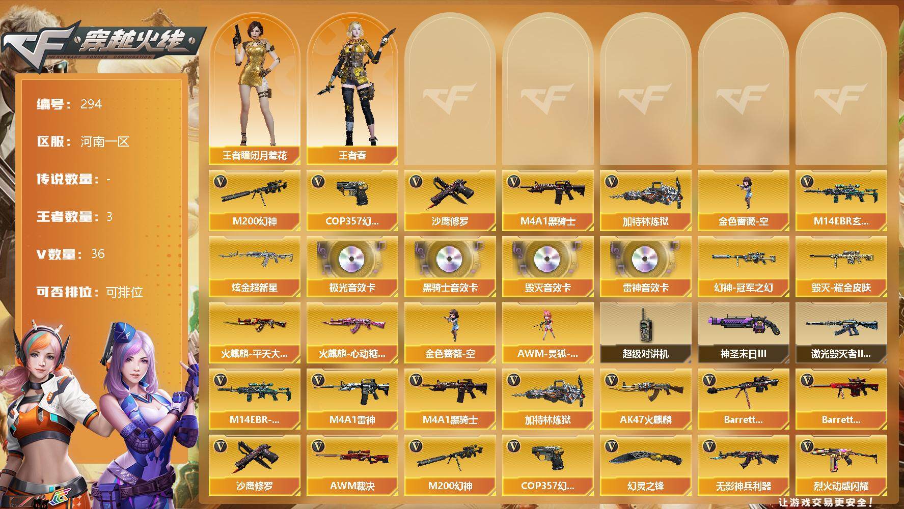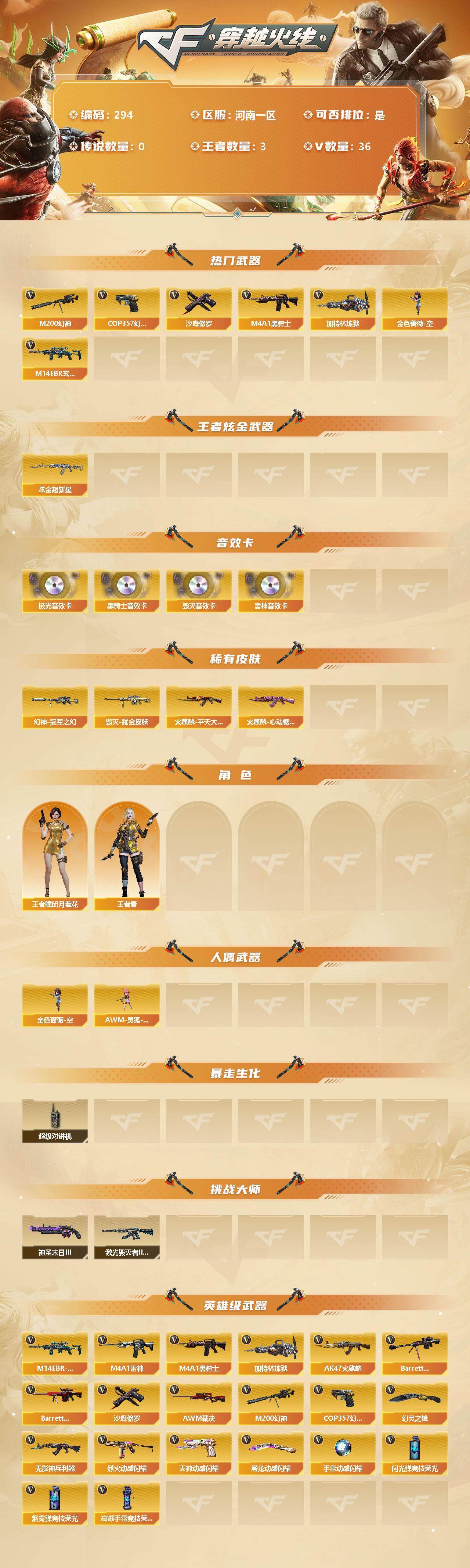 [13035410]【294】36V/100级/元帅/3王者/1炫金/M14EBR-玄武/M200-幻神/M4A1-黑骑士/加特林-炼狱/金色蔷薇-空/COP 357-幻灵/沙鹰-修罗/炫金超新星/M4A1-雷神音效卡/M4A1-黑骑士音效卡/Barrett-毁灭音效卡/Barrett-极光音效卡/幻神冠军之幻/火麒麟-平天大圣/火麒麟-心动糖果/毁灭耀金皮肤/王者-瞳-闭月羞花/王者春/AWM-灵狐-15周年嘉年华/超级对讲机/神圣爆裂者-末日/激光毁灭者III-白马银枪/高爆手雷-竞技荣光/烟雾弹-竞技荣光/闪光弹-竞技荣光/幻灵之锋/烈火-动感闪耀/天神-动感闪耀/屠龙-动感闪耀/手雷-动感闪耀/无影-神兵利器/M4A1-雷神/AK47-火麒麟/Barrett-毁灭/Barrett-极光/AWM-裁决