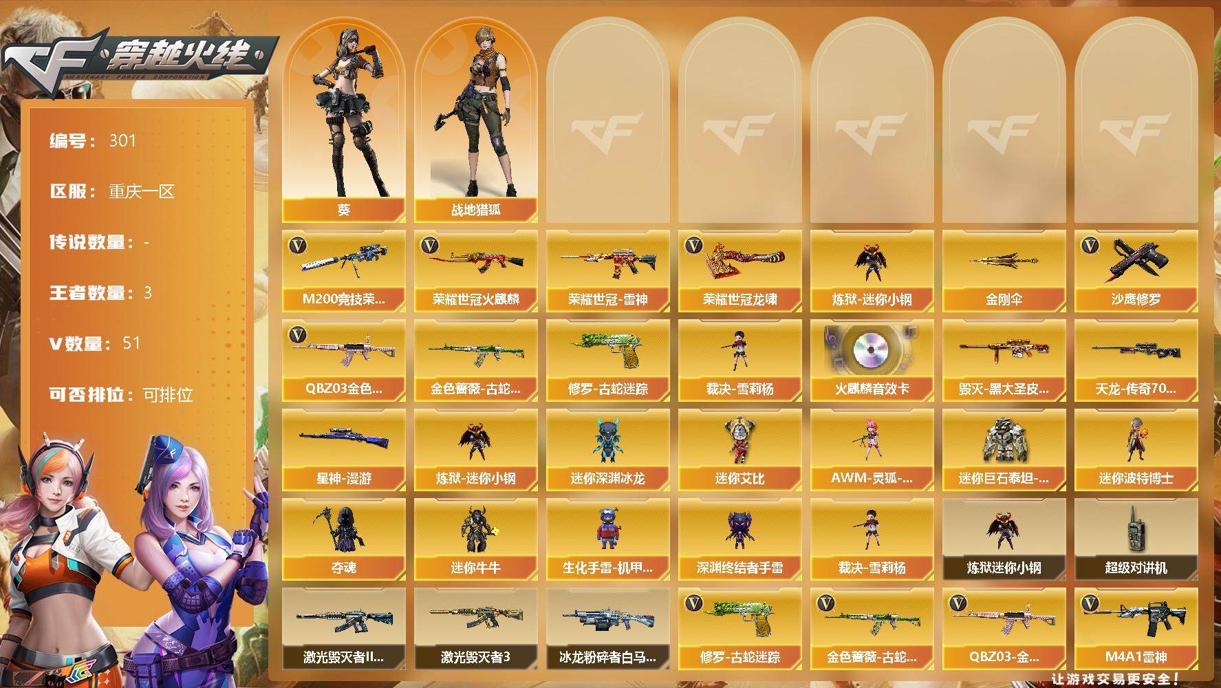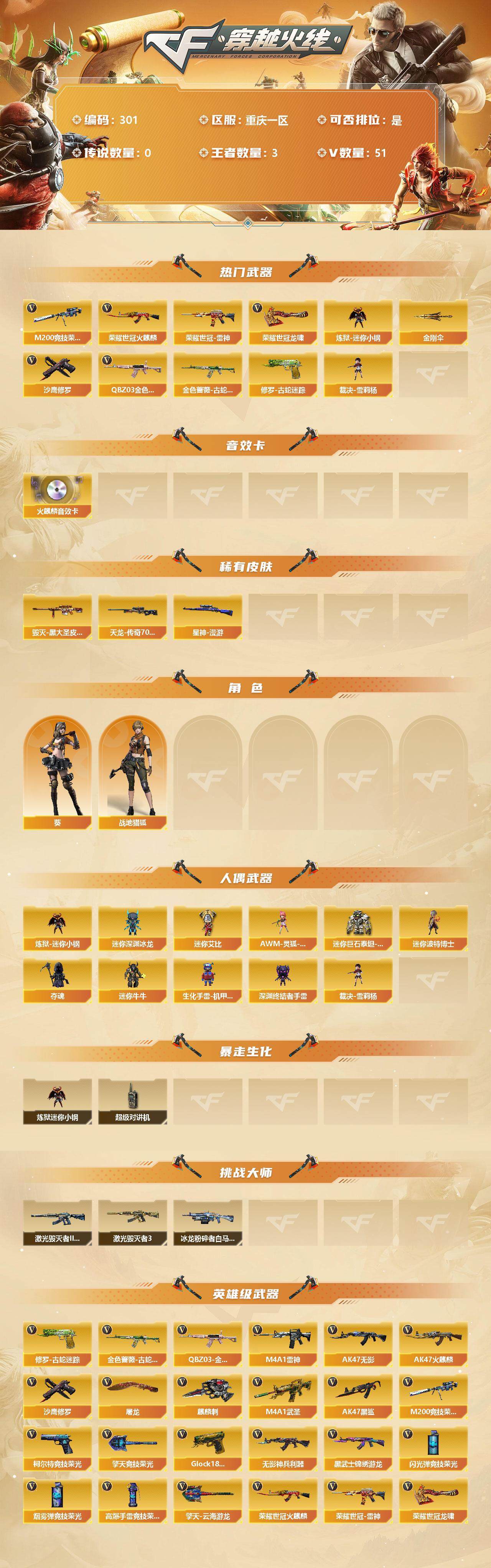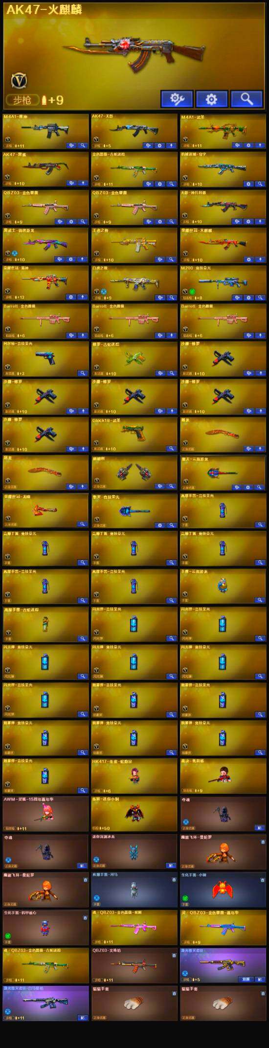 [13035452]【301】49V/101级/大元首/3王者/2英雄/QBZ03-金色蔷薇/金色蔷薇-古蛇迷踪/修罗-古蛇迷踪/M200-竞技荣光/火麒麟-荣耀世冠/雷神-荣耀世冠/炼狱-迷你小钢/裁决-雪莉杨/沙鹰-修罗/龙啸-荣耀世冠/金刚伞/AK47-火麒麟音效卡/星神-漫游/毁灭-黑大圣皮肤/AWM-天龙-传奇70KG/葵/战地猎狐/AWM-灵狐-15周年嘉年华/迷你深渊冰龙/迷你艾比/迷你巨石泰坦-魔花研究所/迷你波特博士/夺魂/迷你牛牛/生化手雷-机甲核心/深渊终结者手雷/超级对讲机/激光毁灭者/激光毁灭者III-白马银枪/冰龙粉碎者-白马银枪/柯尔特-竞技荣光/擎天-竞技荣光/高爆手雷-竞技荣光/烟雾弹-竞技荣光/闪光弹-竞技荣光/M4A1-武圣/Glock18-武圣/荣耀世冠-火麒麟/荣耀世冠-龙啸/无影-神兵利器/M4A1-雷神/AK47-无影/AK47-火麒麟/AK47-黑鲨/AK47-黑武士-锦绣游龙/麒麟刺/屠龙/擎天-云海游龙