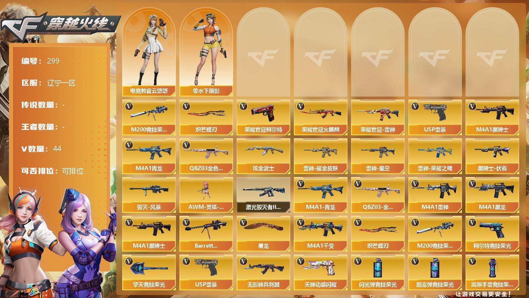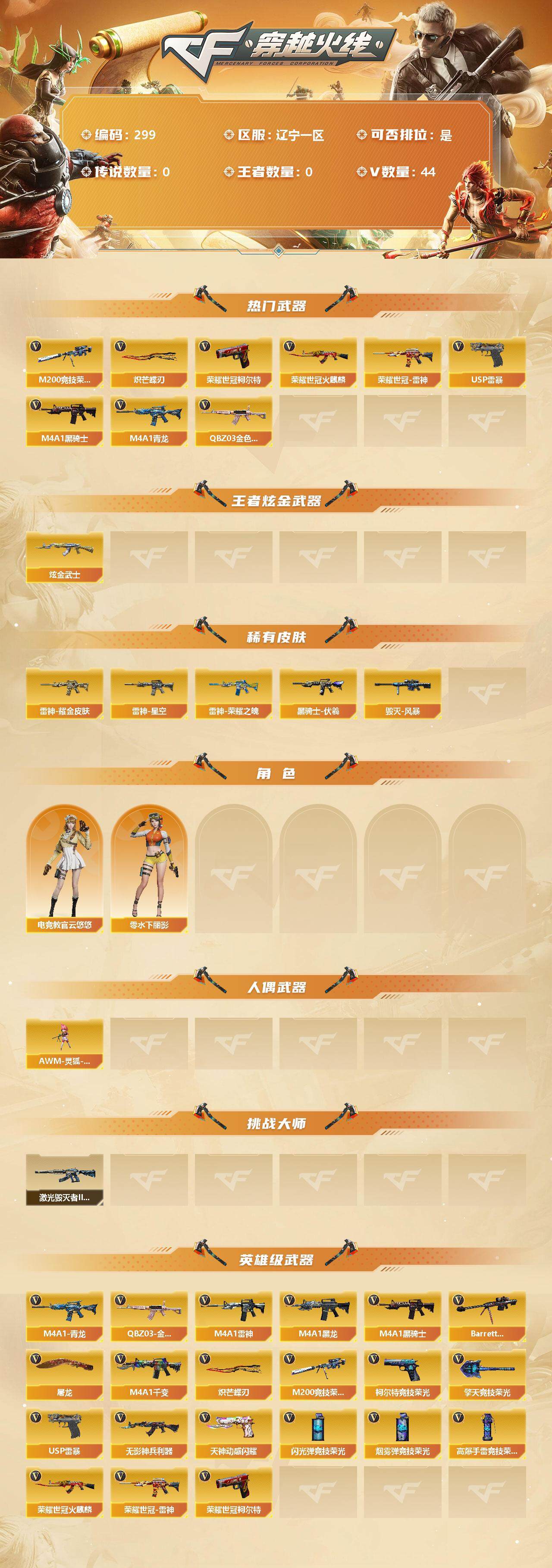 [13035433]【299】42V/100级/元帅/1炫金/2英雄/QBZ03-金色蔷薇/M4A1青龙/M200-竞技荣光/火麒麟-荣耀世冠/雷神-荣耀世冠/柯尔特-荣耀世冠/M4A1-黑骑士/USP雷暴/炽芒蝶刃/炫金黑武士/雷神荣耀之魄/雷神-星空/雷神-耀金皮肤/黑骑士-伏羲/毁灭-风暴/零-水下丽影/电竞教官-云悠悠/AWM-灵狐-15周年嘉年华/激光毁灭者III-白马银枪/柯尔特-竞技荣光/擎天-竞技荣光/高爆手雷-竞技荣光/烟雾弹-竞技荣光/闪光弹-竞技荣光/荣耀世冠-火麒麟/荣耀世冠-柯尔特/天神-动感闪耀/无影-神兵利器/M4A1-雷神/M4A1-黑龙/Barrett-毁灭/M4A1-千变/屠龙