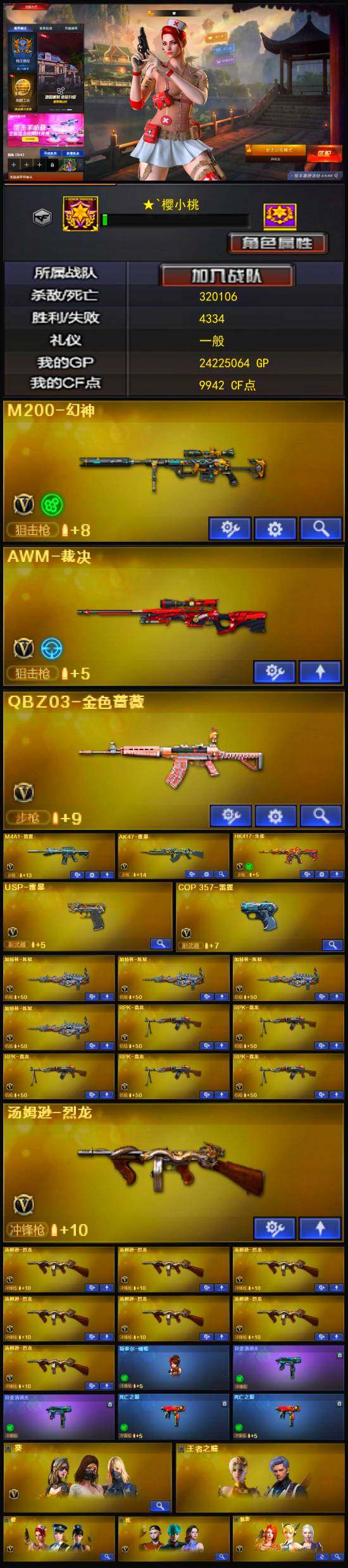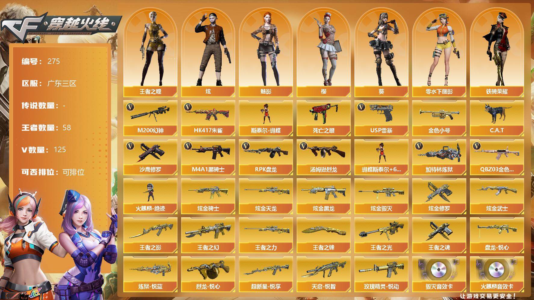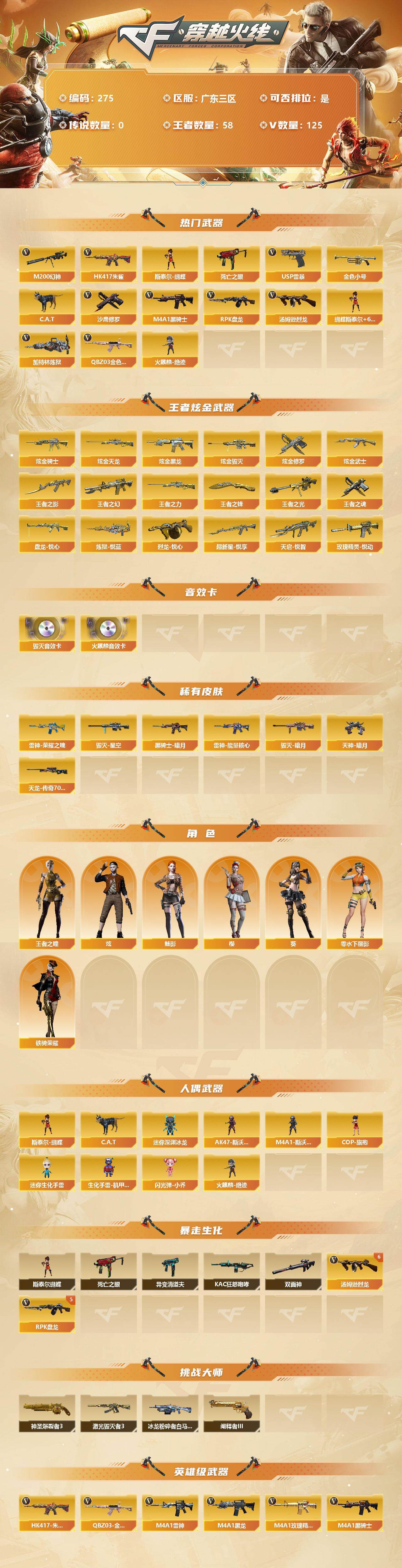 [13035470]【275】120V/102级/荣耀元首/58王者/9炫金/5英雄/QBZ03-金色蔷薇/HK417-朱雀/M200-幻神/死亡之眼/金色小号/C.A.T/M4A1-黑骑士/汤姆逊-烈龙/RPK-盘龙/加特林-炼狱/斯泰尔蝴蝶/火麒麟-绝迹/USP雷暴/沙鹰-修罗/蝴蝶斯泰尔+6烈龙/炫金黑骑士/炫金天龙/炫金黑龙/炫金毁灭/炫金修罗/炫金黑武士/盘龙-悦心/炼狱-悦蓝/烈龙-悦心/超新星-悦享/天启-悦智/王者之幻/玫瑰精灵-悦动/王者之光/王者之影/王者之力/王者之魂/王者之锋/AK47-火麒麟音效卡/Barrett-毁灭音效卡/雷神-能量核心/雷神荣耀之魄/黑骑士-暗月/毁灭-暗月/毁灭-星空/AWM-天龙-传奇70KG/天神-暗月/王者之瞳/零-水下丽影/葵/樱/魅影/炫/铁骑荣耀/AK47-斯沃特/M4A1-斯沃特/COP-旗袍/迷你深渊冰龙/迷你生化手雷/生化手雷-机甲核心/闪光弹-小乔/异变清道夫/KAC-狂怒咆哮/双面神/6烈龙/5盘龙/神圣爆裂者/阐释者/激光毁灭者/冰龙粉碎者-白马银枪/AK47-雷暴/斩神刀-雷暴/M4A1-雷霆/M4A1-雷神/M4A1-黑龙/M4A1-玫瑰精灵/M4A1-死神/AK47-无影/AK47-火麒麟/AK47-黑武士/AN94-超新星/AWM-天龙/Barrett-毁灭/AWM-裁决/AK47-机械迷城/AA-12-雷霆/AK47-黑鲨/M4A1-猎神/M4A1-千变/AK-47-猩红传说/AK47-B-战神/沙鹰-天神/麒麟刺/擎天/龙啸/屠龙