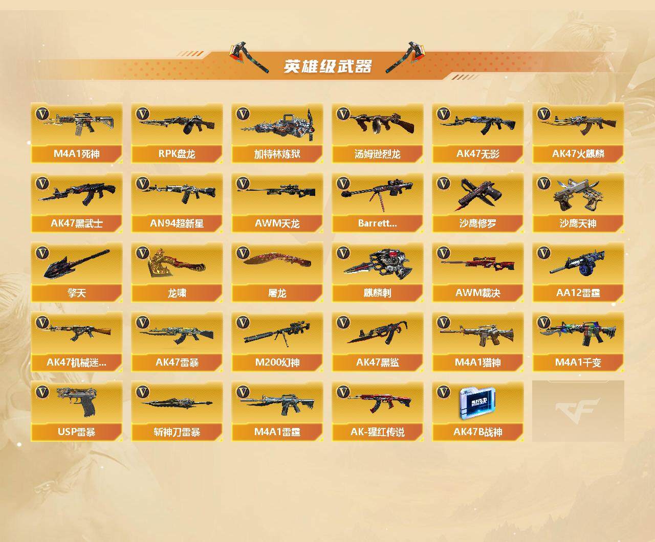 - PX_2108662-??裁决三件套)cf北部/河北一区/19V/裁决+运输船+音效卡/qbz金色蔷薇/火麒麟+cfstar/黑骑士/死神/玫瑰精灵/毁灭/芭蕾特金色蔷薇/修罗/龙啸/麒麟刺/王者冰锋/2音效卡/14皮