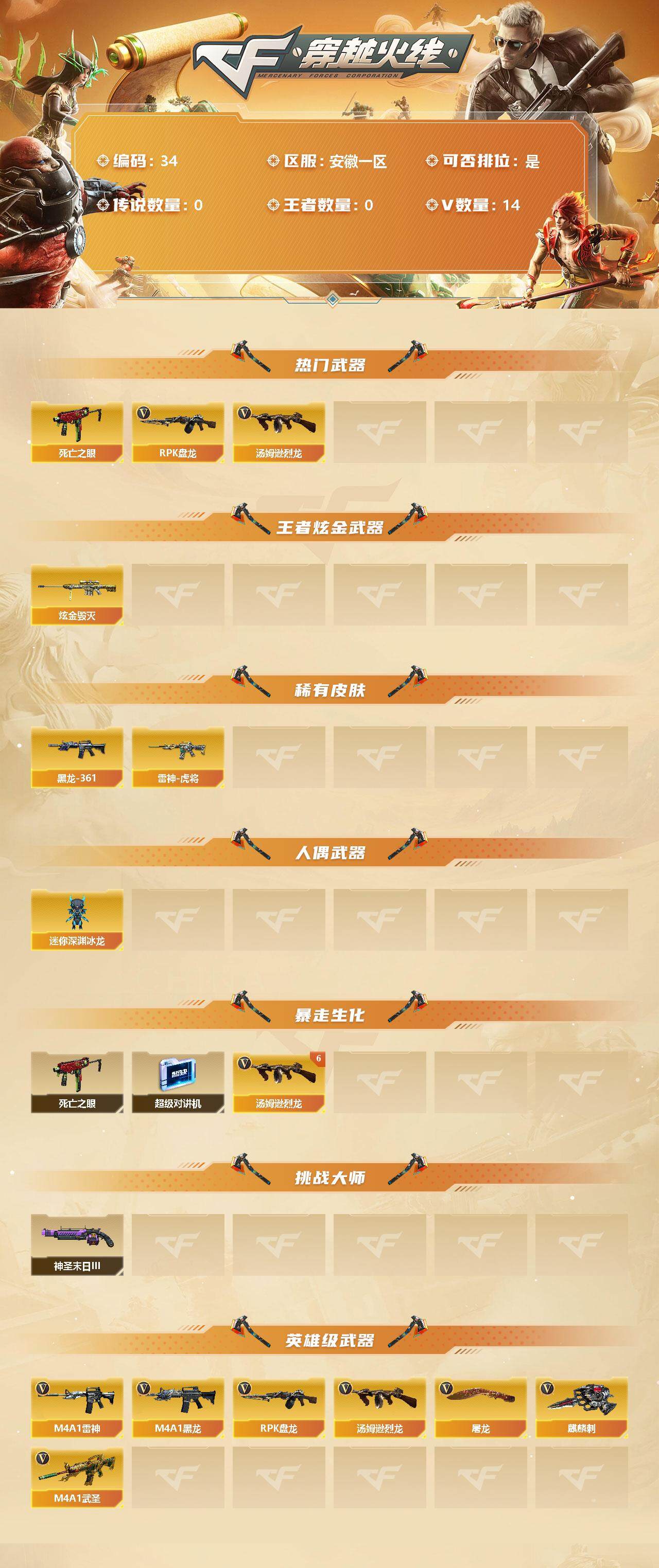 - [12014839]V3 1王者武器 140英雄武器 3英雄角色 可二次 可修改实名 优质装备:M200-幻神,CZ75-策 v武器:沙鹰-神兵修罗,迷你玉凝,M4A1-猎神,AN94-赳赳秦师,蝴蝶刀-天神,亡命之徒-鬼魅双生,VSK-94-九黎兵主觉醒,M4A1-铁胆虎魄,M16-恶魔,电锯-毒蜂,KSG-孟获,毛瑟-毒蜂,CBJ-MS-毒蜂,HK416-极光,太白诗仙扇,M4A1-太白诗仙,丛林匕首-庆龙觉醒,USP-机械迷城,柯尔特-仲达,唐刀-大唐荣耀,改装GLOCK-木兰,M1216-血月,手斧-机械迷城,QSZ92-冰魂觉醒,MAC-10-孟获,烈焰刀,烈焰弓,HK417-炎龙铠甲,猎弩-虫族女王,AWM-大湾溢彩,巴雷特-朱雀,双持沙鹰-元让,沙鹰-宇航兔兔,气勇胆烈戟,AWM-指南针觉醒,HK417-朱雀,USP-神工天巧,M4A1-神工天巧,AK47-木兰,左轮-卧龙觉醒,甩棍-卧龙觉醒,SCAR-心动PICK,破邪蛇棍觉醒,GLOCK18-猎神,马来剑-耀金伯爵,清刚-觉醒,女皇利刃-铁胆虎魄,龙鳞-觉醒,AK47-火麒麟,M4A1-雷神,M4A1-黑骑士,MR1-龙吟惊沧海,AK12-天启,暗杀神,AWM-天龙,巴雷特-毁灭,巴雷特-极光,巴雷特-雷神,AWM-裁决,AK47-血武士,QBZ19-天使,蝴蝶刀-极光,M4A1-心动次元,QBZ03-金色蔷薇,神罚战斧,马来剑-毁灭,AK47-华夏传说,屠龙,地狱火,嗜血金鲨,地狱烈炎,AA12-雷神,寒霜烈龙,双持斯泰尔-天使,沙鹰-修罗,USP-神罚,双持柯尔特-极光,蟒蛇-妙才