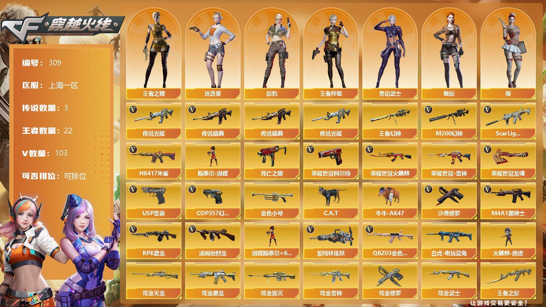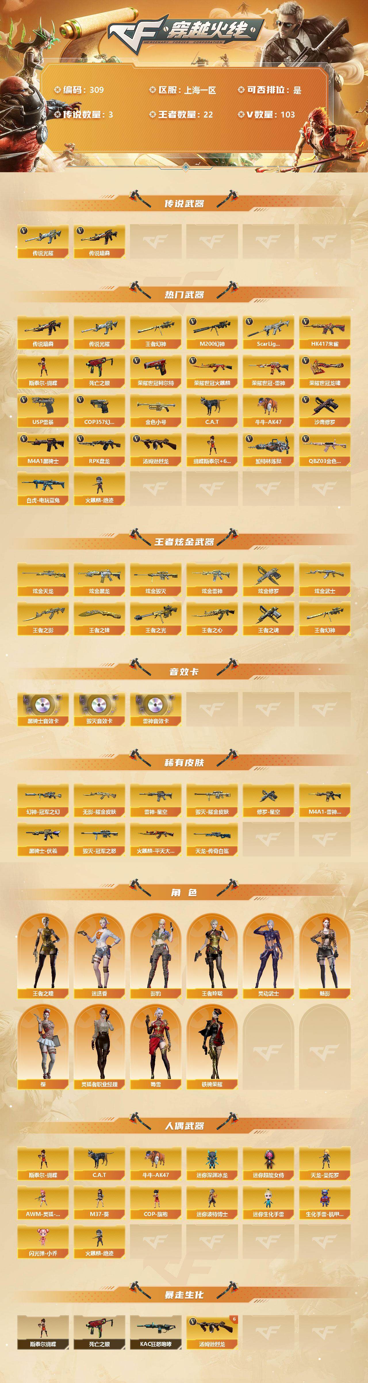 [13035486]【309】99V/102级/荣耀元首/3传说/22王者/7炫金/4英雄/传说光耀/传说暗裔/王者幻神/QBZ03-金色蔷薇/Scar Light-白虎/HK417-朱雀/M200-幻神/死亡之眼/火麒麟-荣耀世冠/雷神-荣耀世冠/白虎-电玩蓝兔/柯尔特-荣耀世冠/金色小号/C.A.T/牛牛-AK47/M4A1-黑骑士/汤姆逊-烈龙/RPK-盘龙/加特林-炼狱/斯泰尔蝴蝶/火麒麟-绝迹/USP雷暴/COP 357-幻灵/沙鹰-修罗/龙啸-荣耀世冠/蝴蝶斯泰尔+6烈龙/炫金天龙/炫金黑龙/炫金毁灭/炫金雷神/炫金修罗/炫金黑武士/王者之光/王者之影/王者之心/王者之魂/王者之锋/M4A1-雷神音效卡/M4A1-黑骑士音效卡/Barrett-毁灭音效卡/幻神冠军之幻/雷神-星空/M4A1-雷神CFS 2019/火麒麟-平天大圣/黑骑士-伏羲/毁灭耀金皮肤/毁灭-冠军之怒/AWM-天龙-传奇白鲨/无影耀金皮肤/修罗-星空/王者之瞳/王者玲珑/灵狐者-职业经理/樱/魅影/迷迭香/影豹/蜀雪/铁骑荣耀/灵动武士/天龙-曼陀罗/AWM-灵狐-15周年嘉年华/M37-葵/COP-旗袍/迷你深渊冰龙/迷你超能女侍/迷你波特博士/迷你生化手雷/生化手雷-机甲核心/闪光弹-小乔/KAC-狂怒咆哮/6烈龙/神圣爆裂者/机甲撕裂者/激光毁灭者/AK47-冰龙粉碎者/冰龙粉碎者-白马银枪/M4A1-幻灵/幻灵之锋/斩神刀-雷暴/M4A1-武圣/Glock18-武圣/荣耀世冠-火麒麟/荣耀世冠-柯尔特/荣耀世冠-龙啸/M4A1-雷神/M4A1-玫瑰精灵/AK47-无影/AK47-火麒麟/AK47-黑武士/AK12-天启/AN94-超新星/AWM-天龙/Barrett-毁灭/Barrett-极光/AWM-裁决/AA-12-雷霆/Barrett-朱雀/M4A1-猎神/M4A1-千变/黑骑士-海王/AK-47-猩红传说/AK47-B-战神/M4A1-赤狱骑士/沙鹰-天神/麒麟刺/擎天/龙啸/屠龙