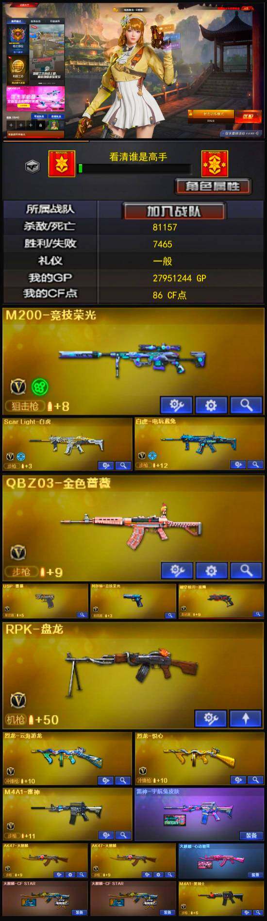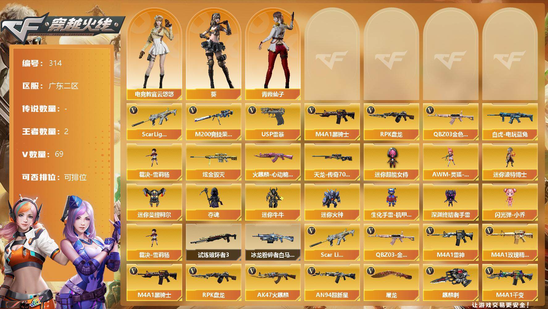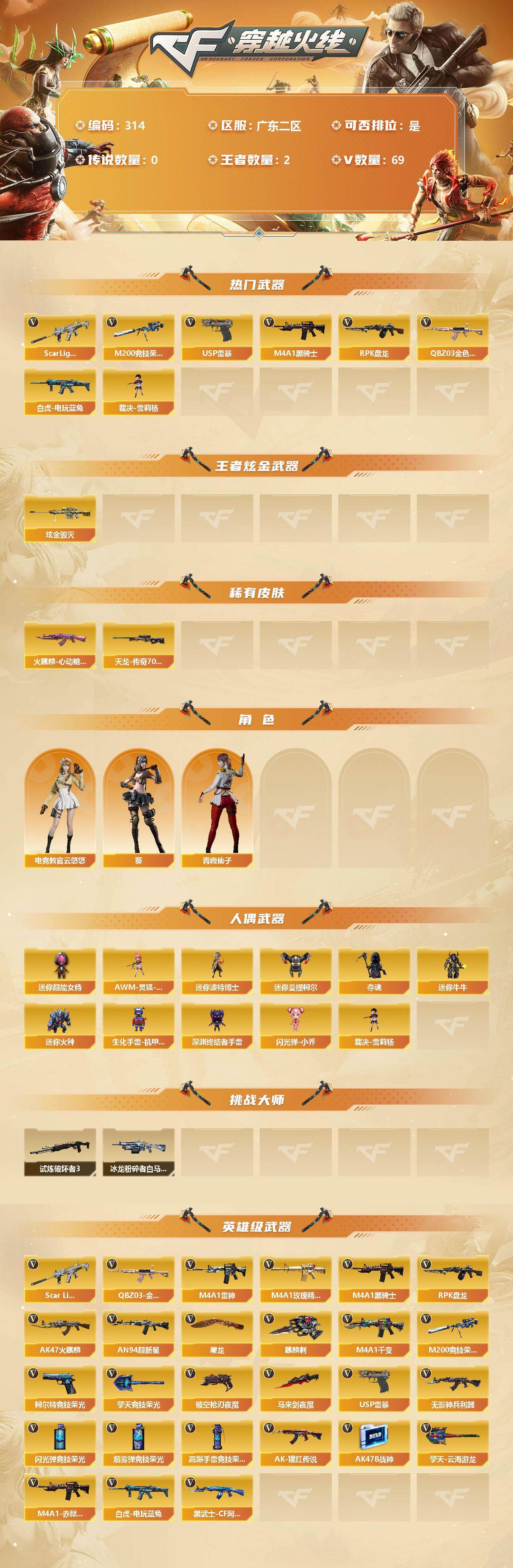[13035661]【314】67V/100级/元帅/2王者/1炫金/2英雄/QBZ03-金色蔷薇/Scar Light-白虎/M200-竞技荣光/白虎-电玩蓝兔/M4A1-黑骑士/RPK-盘龙/裁决-雪莉杨/USP雷暴/炫金毁灭/火麒麟-心动糖果/AWM-天龙-传奇70KG/葵/电竞教官-云悠悠/青霞仙子/AWM-灵狐-15周年嘉年华/迷你超能女侍/迷你波特博士/迷你曼提柯尔/夺魂/迷你牛牛/迷你火种/生化手雷-机甲核心/深渊终结者手雷/闪光弹-小乔/试炼破坏者/冰龙粉碎者-白马银枪/柯尔特-竞技荣光/擎天-竞技荣光/高爆手雷-竞技荣光/烟雾弹-竞技荣光/闪光弹-竞技荣光/破空枪刃-夜魔/马来剑夜魔/黑武士-CF网剧冠军/无影-神兵利器/M4A1-雷神/M4A1-玫瑰精灵/AK47-火麒麟/AN94-超新星/M4A1-千变/AK-47-猩红传说/AK47-B-战神/M4A1-赤狱骑士/麒麟刺/屠龙/擎天-云海游龙