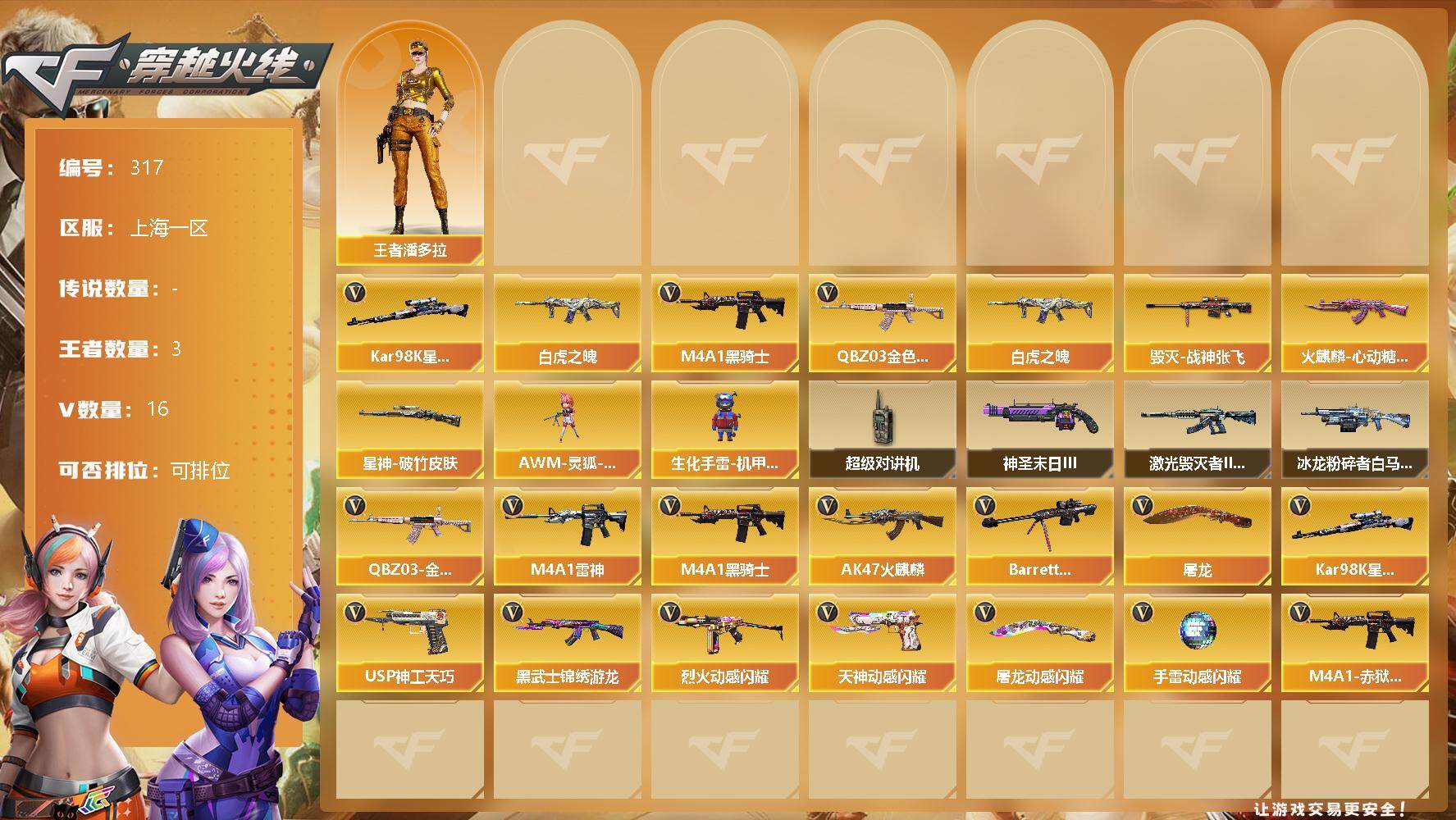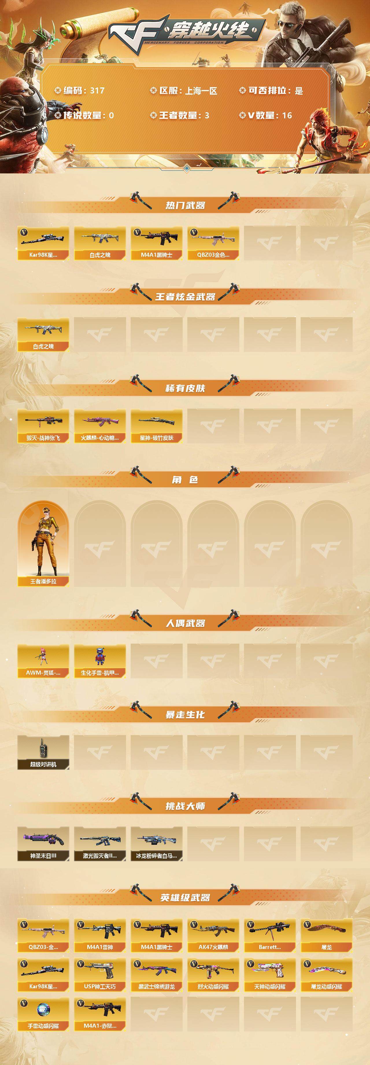 [13035694]【317】16V/100级/元帅/3王者/QBZ03-金色蔷薇/白虎之魄/Kar98k-星神/M4A1-黑骑士/星神-破竹皮肤/火麒麟-心动糖果/毁灭-战神张飞/王者潘多拉/AWM-灵狐-15周年嘉年华/生化手雷-机甲核心/超级对讲机/神圣爆裂者-末日/激光毁灭者III-白马银枪/冰龙粉碎者-白马银枪/USP神工天巧/烈火-动感闪耀/天神-动感闪耀/屠龙-动感闪耀/手雷-动感闪耀/M4A1-雷神/AK47-火麒麟/Barrett-毁灭/AK47-黑武士-锦绣游龙/M4A1-赤狱骑士/屠龙