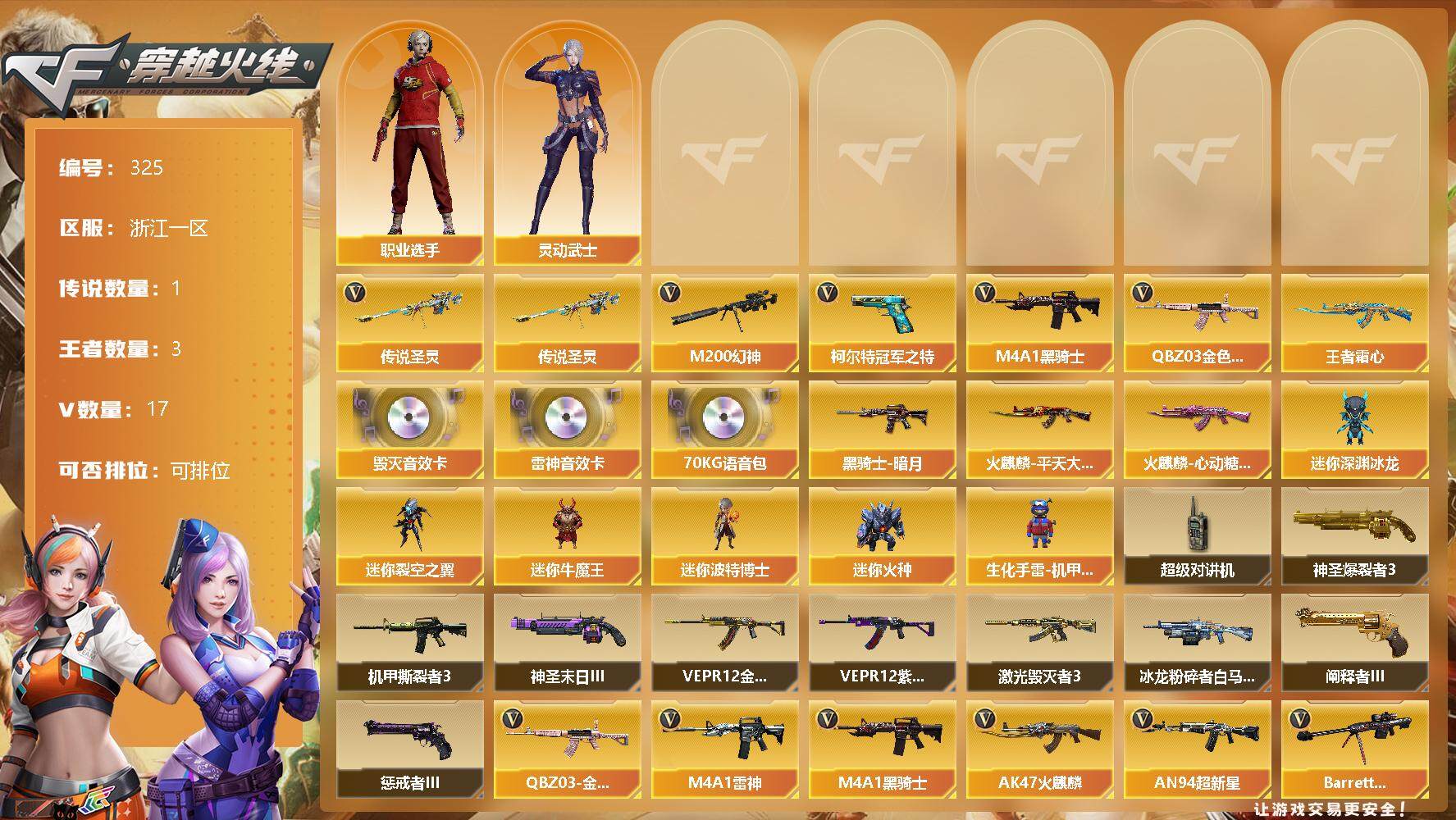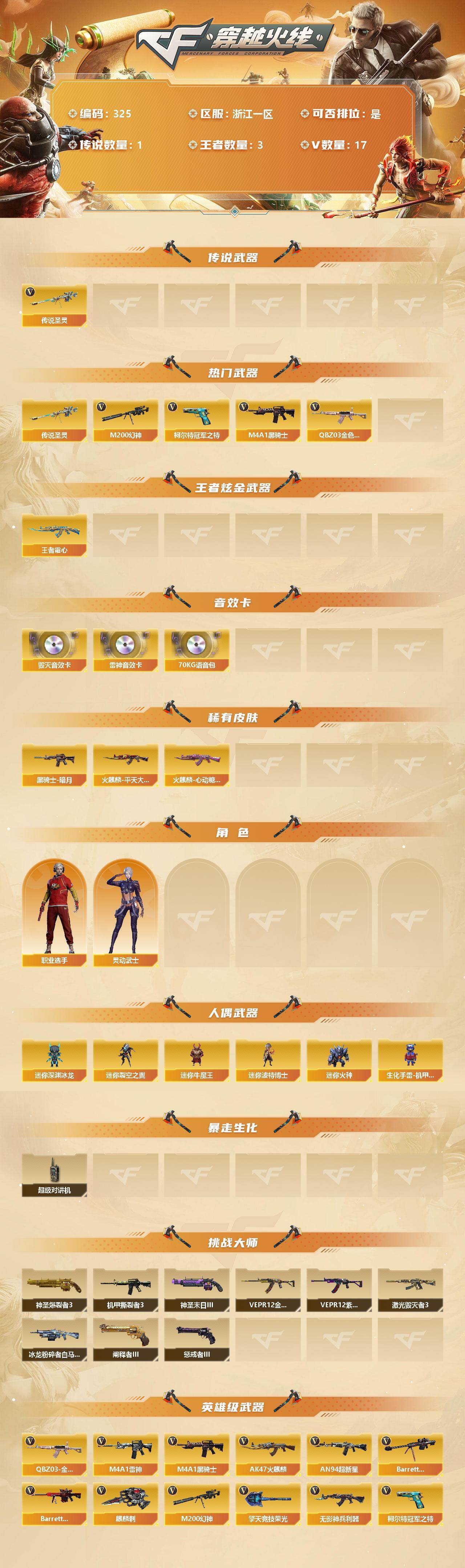 [13035828]【325】16V/100级/元帅/1传说/3王者/1英雄/传说圣灵/QBZ03-金色蔷薇/M200-幻神/柯尔特-冠军之特/M4A1-黑骑士/王者霜心/M4A1-雷神音效卡/Barrett-毁灭音效卡/70KG语音包/火麒麟-平天大圣/火麒麟-心动糖果/黑骑士-暗月/灵动武士/职业选手/迷你深渊冰龙/迷你裂空之翼/迷你牛魔王/迷你波特博士/迷你火种/生化手雷-机甲核心/超级对讲机/神圣爆裂者/机甲撕裂者/神圣爆裂者-末日/阐释者/惩戒者/激光毁灭者/VEPR-12-金魔/VEPR-12-紫魔/冰龙粉碎者-白马银枪/AK47-火麒麟/M4A1-雷神/AN94-超新星/无影-神兵利器/Barrett-毁灭/Barrett-极光/麒麟刺/擎天-竞技荣光