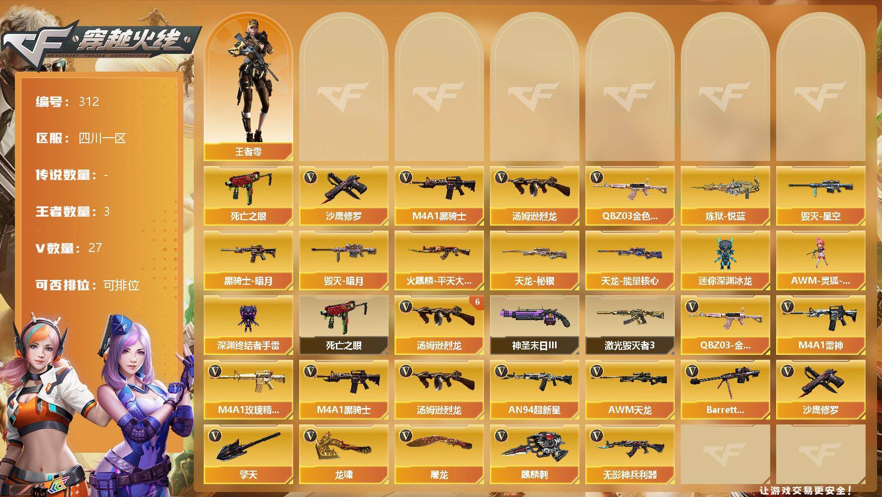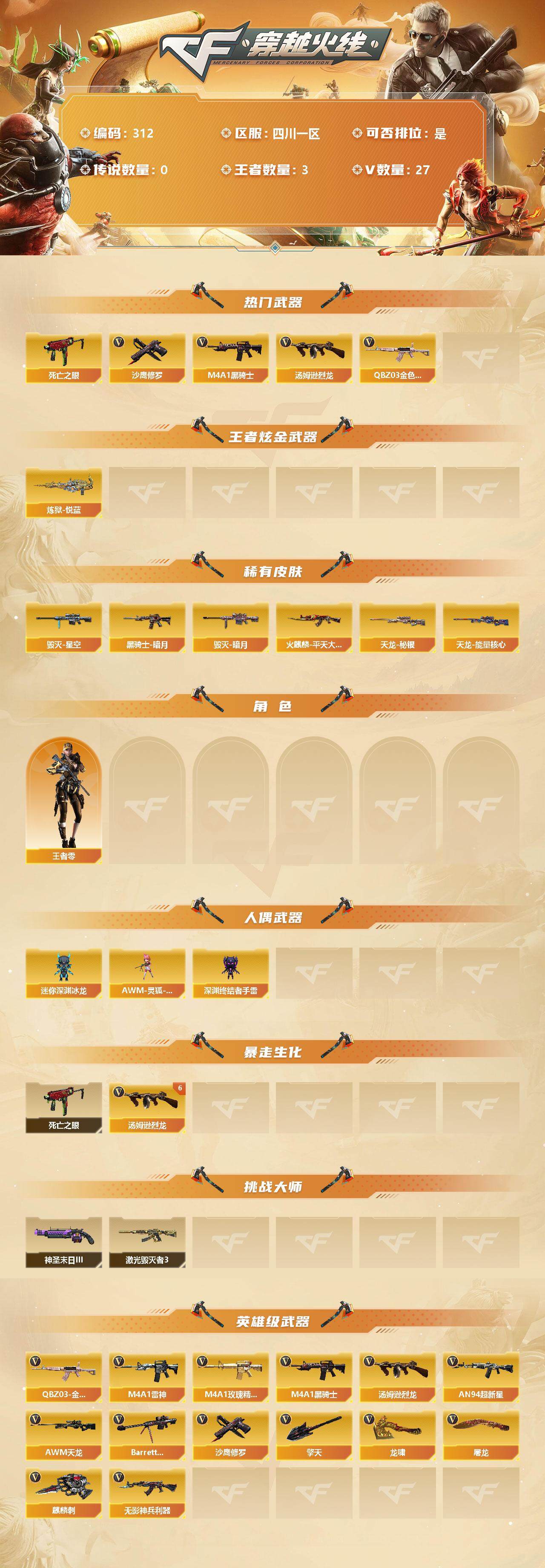 [13035894]【312】27V/100级/元帅/3王者/QBZ03-金色蔷薇/死亡之眼/M4A1-黑骑士/汤姆逊-烈龙/沙鹰-修罗/炼狱-悦蓝/火麒麟-平天大圣/黑骑士-暗月/毁灭-暗月/毁灭-星空/天龙-秘银/天龙-能量核心/王者-零/AWM-灵狐-15周年嘉年华/迷你深渊冰龙/深渊终结者手雷/6烈龙/神圣爆裂者-末日/激光毁灭者/无影-神兵利器/M4A1-雷神/M4A1-玫瑰精灵/AN94-超新星/AWM-天龙/Barrett-毁灭/麒麟刺/擎天/龙啸/屠龙