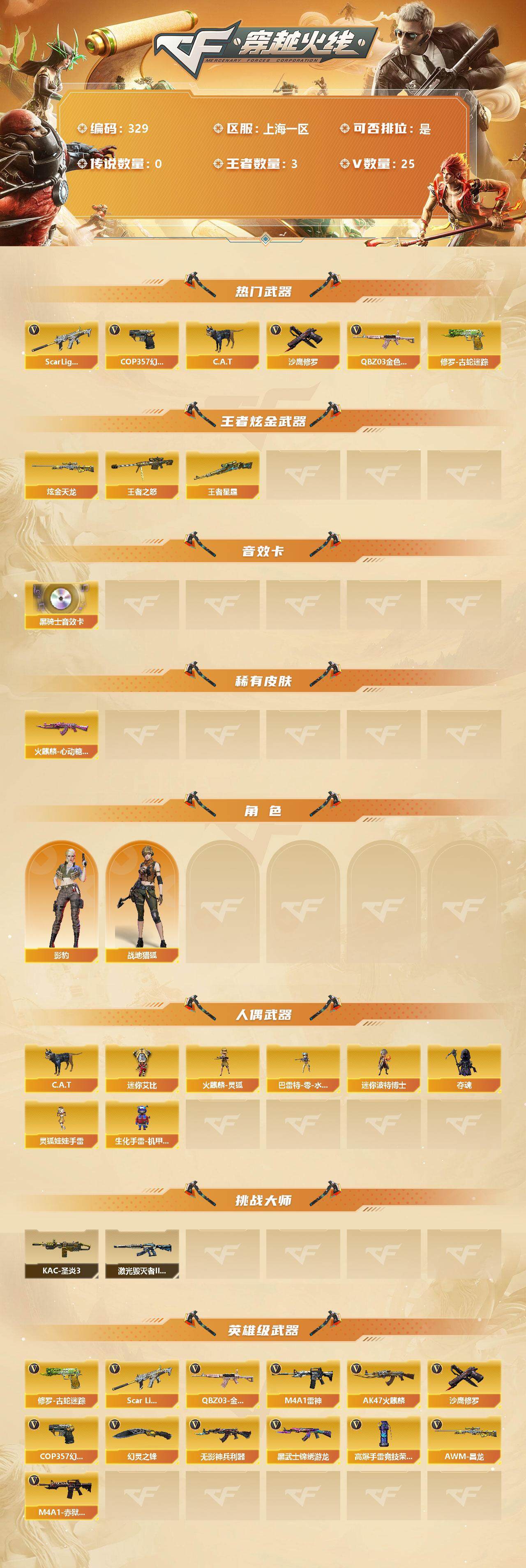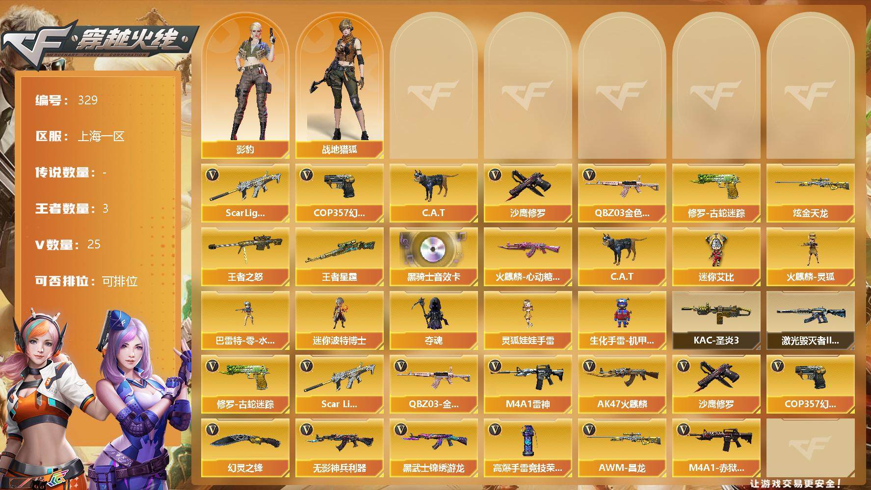 [13035916]【329】23V/90级/将帅/3王者/1炫金/2英雄/QBZ03-金色蔷薇/Scar Light-白虎/修罗-古蛇迷踪/C.A.T/COP 357-幻灵/沙鹰-修罗/王者之怒/王者星霆/炫金天龙/M4A1-黑骑士音效卡/火麒麟-心动糖果/影豹/战地猎狐/火麒麟-灵狐/巴雷特-零-水下丽影/迷你艾比/迷你波特博士/夺魂/灵狐娃娃手雷/生化手雷-机甲核心/KAC-圣炎切割者/激光毁灭者III-白马银枪/AK47-火麒麟/M4A1-雷神/无影-神兵利器/AK47-黑武士-锦绣游龙/幻灵之锋/高爆手雷-竞技荣光/M4A1-赤狱骑士/AWM-昌龙