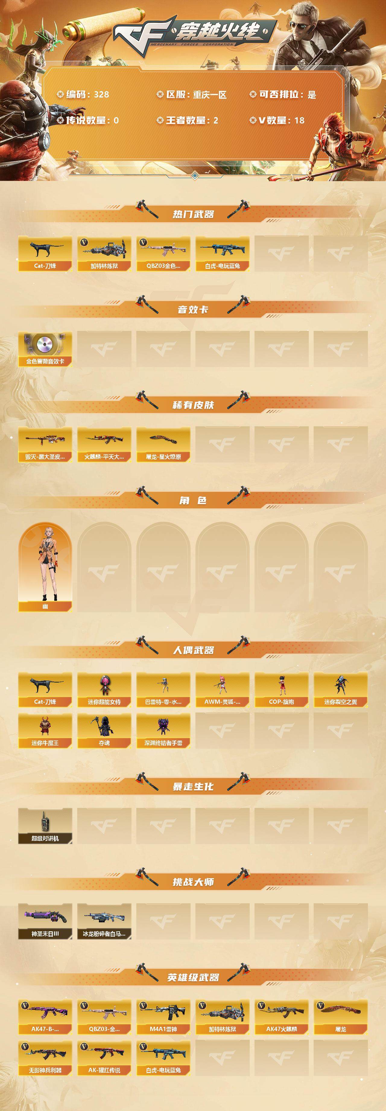- [13753572]广西一区-33V-7王者-1炫金 【热门武器】:QBZ03-金色蔷薇,M200-幻神,凤吟之魄 【王者炫金武器】:凤吟之魄,炫金毁灭 【音效卡】:Barrett-碧霄极光音效卡,白虎-盛典舞曲音效卡,炼狱-百战金芒-庆典舞曲音效卡 【皮肤】:幻神-宠儿-2021MVP,M200-幻神-N9-2022MVP,裁决-流光秘银,雷神-暗月,雷神-宠儿-2019MVP,雷神-R.LGD-CFPLS18冠军,M4A1-再燃火线,雷神-神秘按键 皮肤,火麒麟-雷神,火麒麟-百城,火麒麟-心动糖果,毁灭-黑大圣皮肤,毁灭-虹光风暴 皮肤,轻型军用手斧-再燃火线 【角色】:隼,王者涂鸦,云海玲珑,飞虎队-X,嘉年华灵狐,娟娟,猎狐者-追月,灵动武士,灵狐者-X,灵狐者-七夕宝贝,龙儿-小淘气,麻雀,曼陀罗-X,曼陀罗-礼服,潘多拉-X,潘多拉-甜心教官,斯沃特-X,蜀雪,影武者-X 【人偶武器】:星神-炽天使,AWM-灵狐-15周年嘉年华,迷你波特博士,夺魂,生化手雷-机甲核心,深渊终结者手雷,迷你巨石泰坦-魔花研究所 【暴走生化】:超级对讲机 【挑战大师】:激光毁灭者III-白马银枪*2 【英雄级武器】:AK47-火麒麟,M4A1-黑龙,M4A1-雷神,无影-神兵利器,黑武士-锦绣游龙,QBZ03-金色蔷薇,Barrett-毁灭,M200-幻神,王者风神-觉醒版,炼狱-百战金芒,幻灵之锋,擎天-云海游龙,斩神刀-雷暴,麒麟刺-百战金芒,丛林匕首-玄豹,高爆手雷-雷暴,高爆手雷-幻灵,高爆手雷-云龙,手雷-云海游龙,高爆手雷-玄豹,闪光弹-雷暴,闪光弹-幻灵,闪光弹-云龙,闪光弹-雷霆王者-觉醒版,烟雾弹-雷暴*2,烟雾弹-幻灵,烟雾弹-云龙,烟雾弹-玄豹*2,烟雾弹-雷霆王者-觉醒版,M4A1-赤狱骑士 【道具】:BS战队炫彩背包,CFS限定背包,全能枪王背包,百战金芒炫彩背包,超级背包,女皇终结者-魔龙之吻,救世主-黑桃战神,绿色巨人,灵魂忍者*2,变异宝贝,迷雾幽灵*2,夺命之镰*2,防化服*3,金色流光-枪王排位*2,星辰流光-枪王排位,流光-鎏金之域,枪王排位28赛季金色流光,枪王排位29赛季金色流光,语音特效-盛典烟火,萌萌小葵表情,EP战队名片,EP战队喷图,EP战队击杀图标,C4-黑曜,C4-红龙,C4-沙漠,C4-再燃火线,防弹头盔*4,防弹衣*4,C4工具钳*