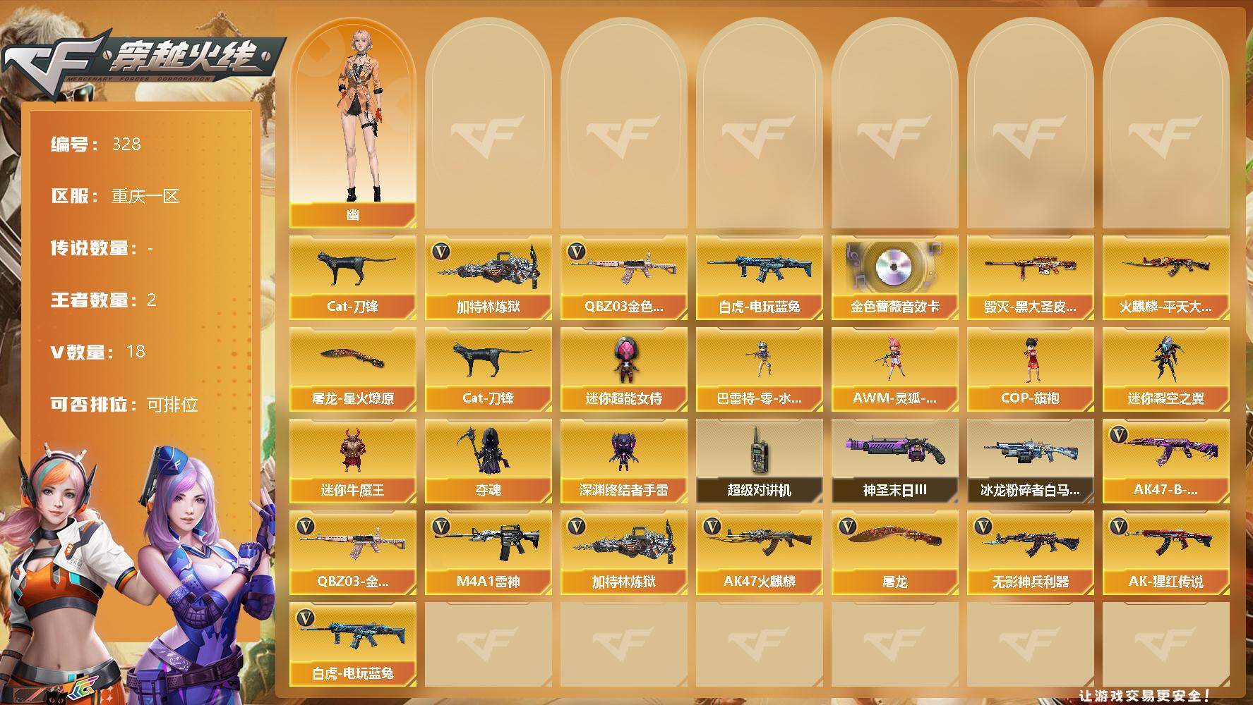 [13036171]【328】18V/73级/校官/2王者/QBZ03-金色蔷薇/白虎-电玩蓝兔/Cat-刀锋/加特林-炼狱/金色蔷薇音效卡/火麒麟-平天大圣/毁灭-黑大圣皮肤/屠龙-星火燎原/幽/巴雷特-零-水下丽影/AWM-灵狐-15周年嘉年华/COP-旗袍/迷你超能女侍/迷你裂空之翼/迷你牛魔王/夺魂/深渊终结者手雷/超级对讲机/神圣爆裂者-末日/冰龙粉碎者-白马银枪/无影-神兵利器/M4A1-雷神/AK47-火麒麟/AK-47-猩红传说/AK47-B-常胜将军/屠龙