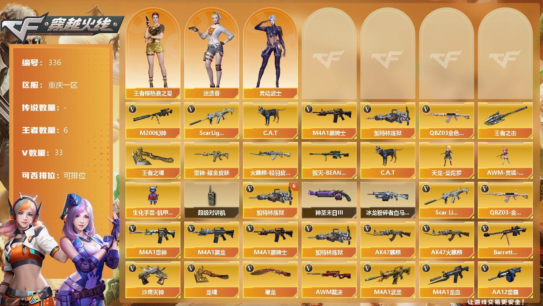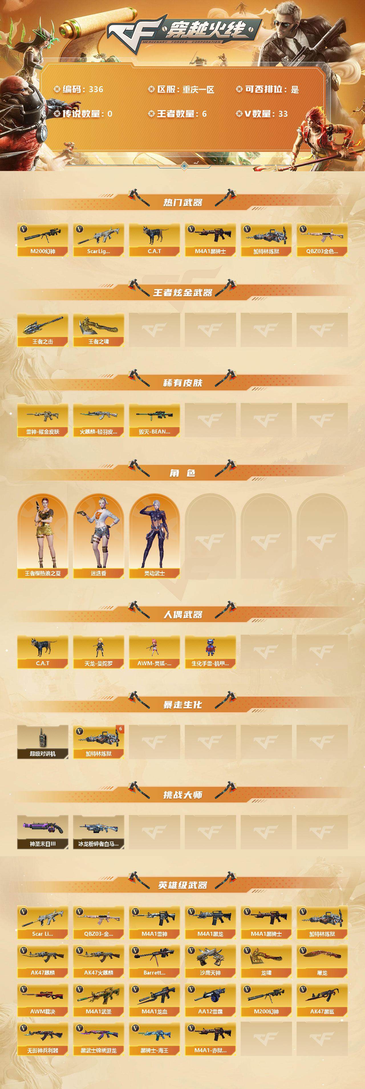 - [12175946]【商品标题】:重庆一区-41V-5王者-1炫金 【热门武器】:QBZ03-金色蔷薇,M200-竞技荣光,荣耀世冠-火麒麟,荣耀世冠-柯尔特,炼狱-迷你小钢,M4A1-黑骑士,汤姆逊-烈龙*2,沙鹰-修罗,荣耀世冠-龙啸,金刚伞 【王者炫金武器】:炫金修罗,王者风势,凰鸣之魄 【稀有皮肤】:Kar98K-星神-AG-CFPLS21冠军皮肤,雷神-炽焰魔龙,火麒麟-轻羽皮肤,火麒麟-心动糖果,黑龙-墨子皮肤,毁灭耀金皮肤,天龙-能量核心,AWM-天龙-传奇白鲨 【角色】:王者涂鸦,电竞教官-云悠悠,青霞仙子 【人偶武器】:AWM-灵狐-15周年嘉年华,炼狱-迷你小钢,黄金迷你深渊冰龙,迷你深渊冰龙,迷你巨石泰坦-魔花研究所,迷你牛魔王,迷你波特博士,夺魂*2,迷你生化手雷,生化手雷-机甲核心,深渊终结者手雷 【暴走生化】:炼狱-迷你小钢,超级对讲机 【挑战大师】:神圣爆裂者-末日III,激光毁灭者III,激光毁灭者III-白马银枪*3,冰龙粉碎者-白马银枪 【英雄级武器】:M200-竞技荣光,擎天-竞技荣光*2,高爆手雷-竞技荣光*2,烟雾弹-竞技荣光*3,闪光弹-竞技荣光*2,荣耀世冠-火麒麟,荣耀世冠-柯尔特,荣耀世冠-龙啸,天神-动感闪耀,手雷-动感闪耀,QBZ03-金色蔷薇,无影-神兵利器,M4A1-雷神,M4A1-黑龙,M4A1-黑骑士,M4A1-死神,汤姆逊-烈龙*2,AK47-火麒麟,AK47-黑武士,AWM-天龙,Barrett-毁灭,AWM-裁决,QBZ03-天罚,AK47-黑鲨*2,M4A1-猎神,黑武士-锦绣游龙,沙鹰-天神*3,沙鹰-修罗,擎天,龙啸,屠龙 【特殊枪械】:1黑骑士,2烈龙