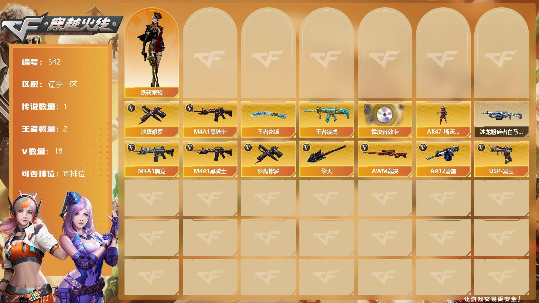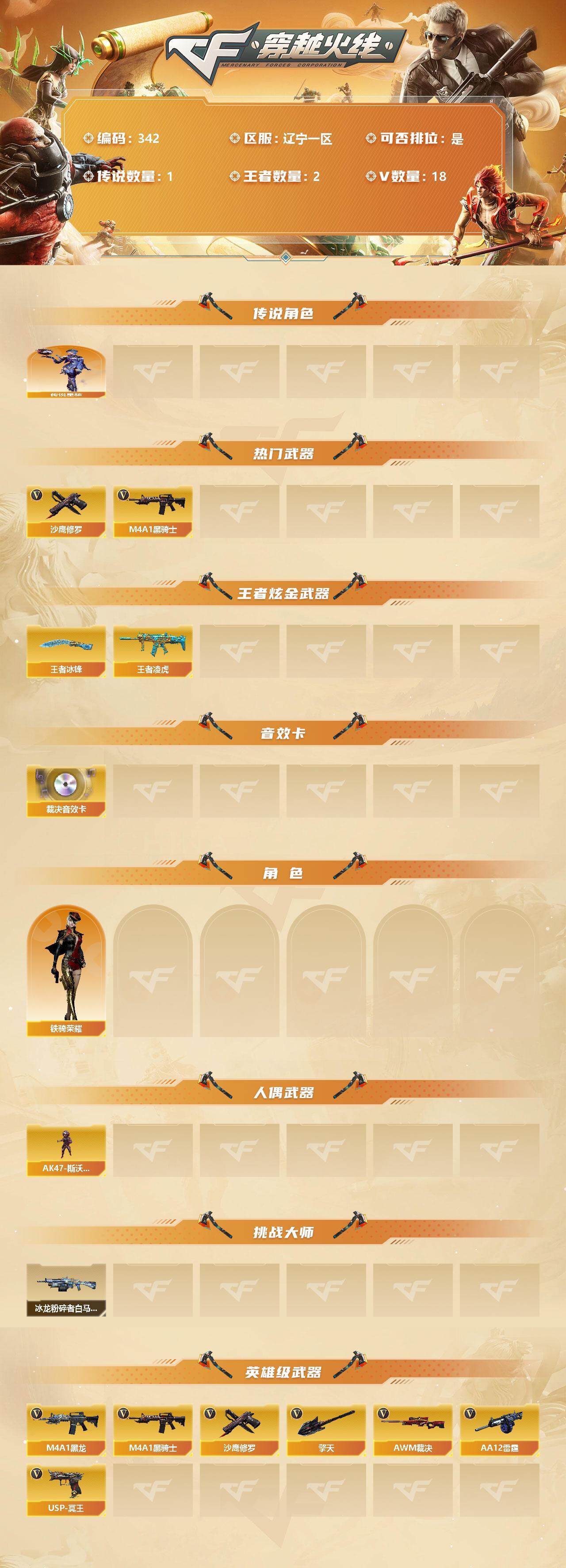 [13036170]【342】18V/102级/荣耀元首/1传说/2王者/传说星骇/M4A1-黑骑士/沙鹰-修罗/王者凌虎/王者冰锋/AWM-裁决音效卡/铁骑荣耀/AK47-斯沃特/冰龙粉碎者-白马银枪/M4A1-黑龙/AWM-裁决/AA-12-雷霆/USP-冥王/擎天