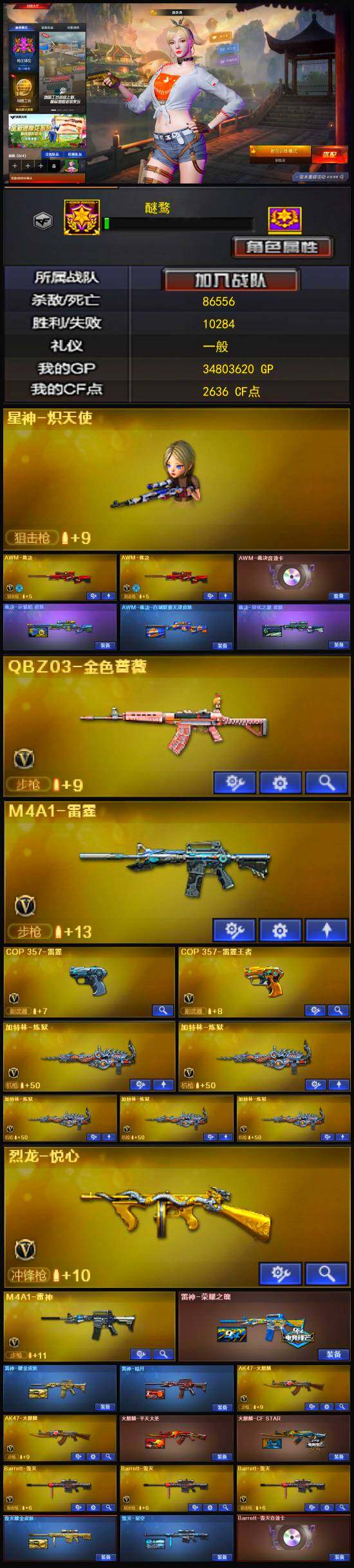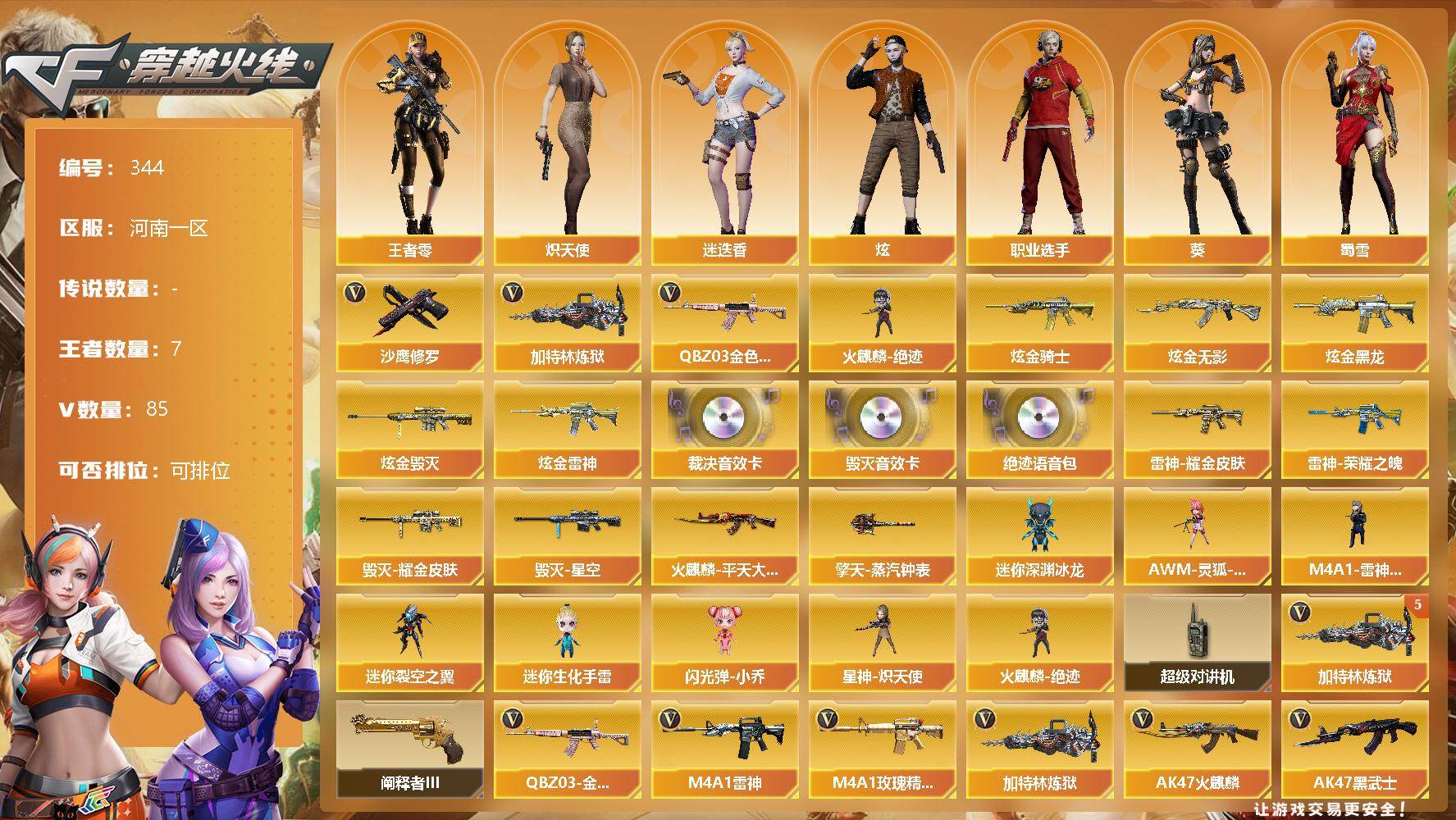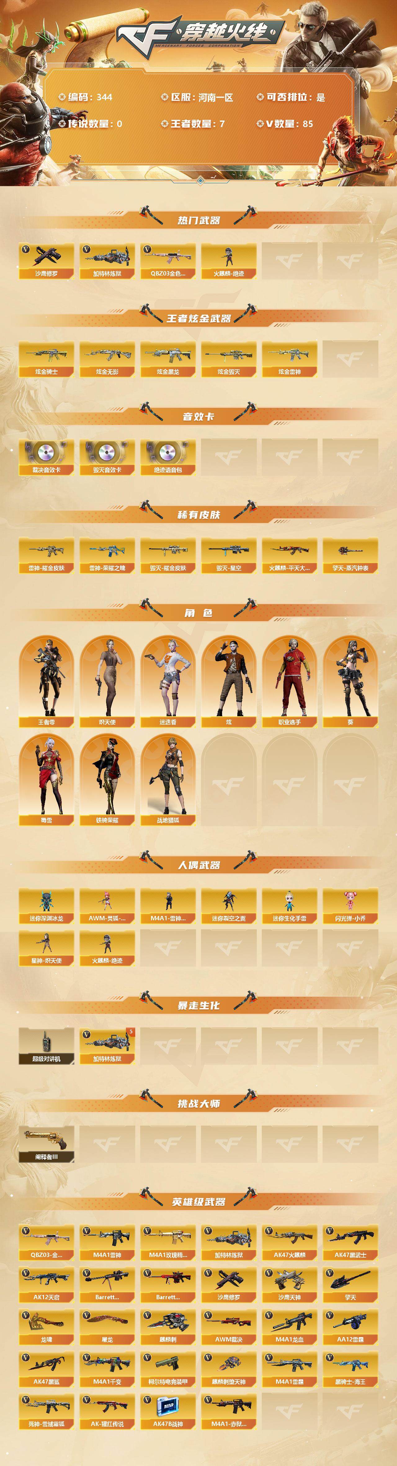 [13036244]【344】80V/102级/荣耀元首/7王者/6炫金/5英雄/QBZ03-金色蔷薇/加特林-炼狱/火麒麟-绝迹/沙鹰-修罗/炫金黑骑士/炫金无影/炫金黑龙/炫金毁灭/炫金雷神/Barrett-毁灭音效卡/AWM-裁决音效卡/绝迹语音包/雷神荣耀之魄/雷神-耀金皮肤/火麒麟-平天大圣/毁灭耀金皮肤/毁灭-星空/擎天-蒸汽钟表/葵/炫/迷迭香/战地猎狐/王者-零/蜀雪/炽天使/铁骑荣耀/职业选手/星神-炽天使/AWM-灵狐-15周年嘉年华/M4A1-雷神-精英刀锋/迷你深渊冰龙/迷你裂空之翼/迷你生化手雷/闪光弹-小乔/超级对讲机/5炼狱/阐释者/M4A1-千变/AK47-火麒麟/M4A1-雷神/AK47-黑武士/AK12-天启/AK47-黑鲨/M4A1-龙血/M4A1-雷霆/死神-雪域霜狐/M4A1-玫瑰精灵/AK-47-猩红传说/AK47-B-战神/黑骑士-海王/Barrett-毁灭/Barrett-极光/AWM-裁决/AA-12-雷霆/沙鹰-天神/柯尔特-电竞装甲/屠龙/龙啸/麒麟刺-堕天神/擎天/麒麟刺/M4A1-赤狱骑士