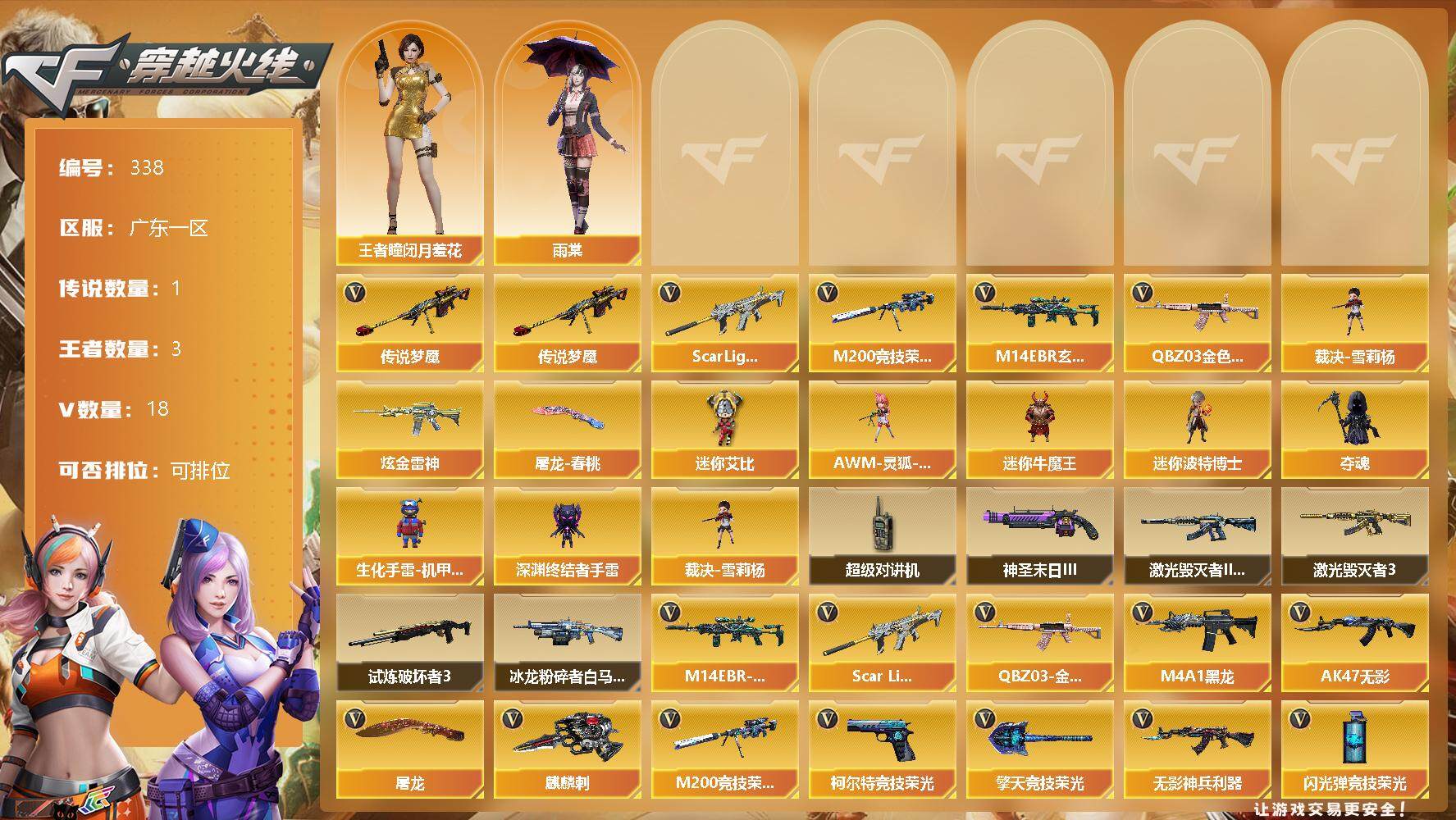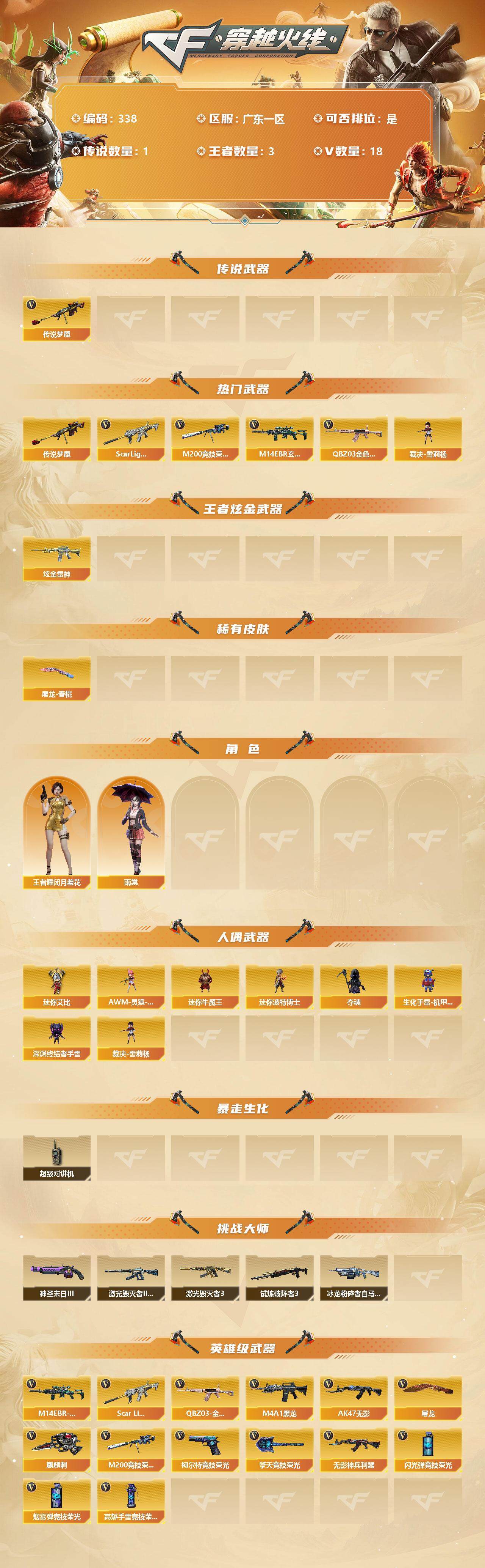 [13036307]【338】17V/100级/元帅/1传说/3王者/1炫金/1英雄/传说梦魇/QBZ03-金色蔷薇/M14EBR-玄武/Scar Light-白虎/M200-竞技荣光/裁决-雪莉杨/炫金雷神/屠龙-春桃/雨棠/王者-瞳-闭月羞花/AWM-灵狐-15周年嘉年华/迷你艾比/迷你牛魔王/迷你波特博士/夺魂/生化手雷-机甲核心/深渊终结者手雷/超级对讲机/神圣爆裂者-末日/试炼破坏者/激光毁灭者/激光毁灭者III-白马银枪/冰龙粉碎者-白马银枪/M4A1-黑龙/AK47-无影/无影-神兵利器/柯尔特-竞技荣光/屠龙/麒麟刺/擎天-竞技荣光/高爆手雷-竞技荣光/闪光弹-竞技荣光/烟雾弹-竞技荣光