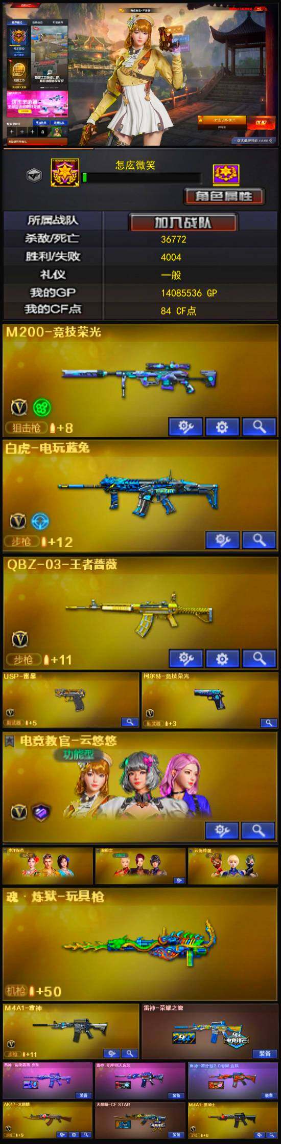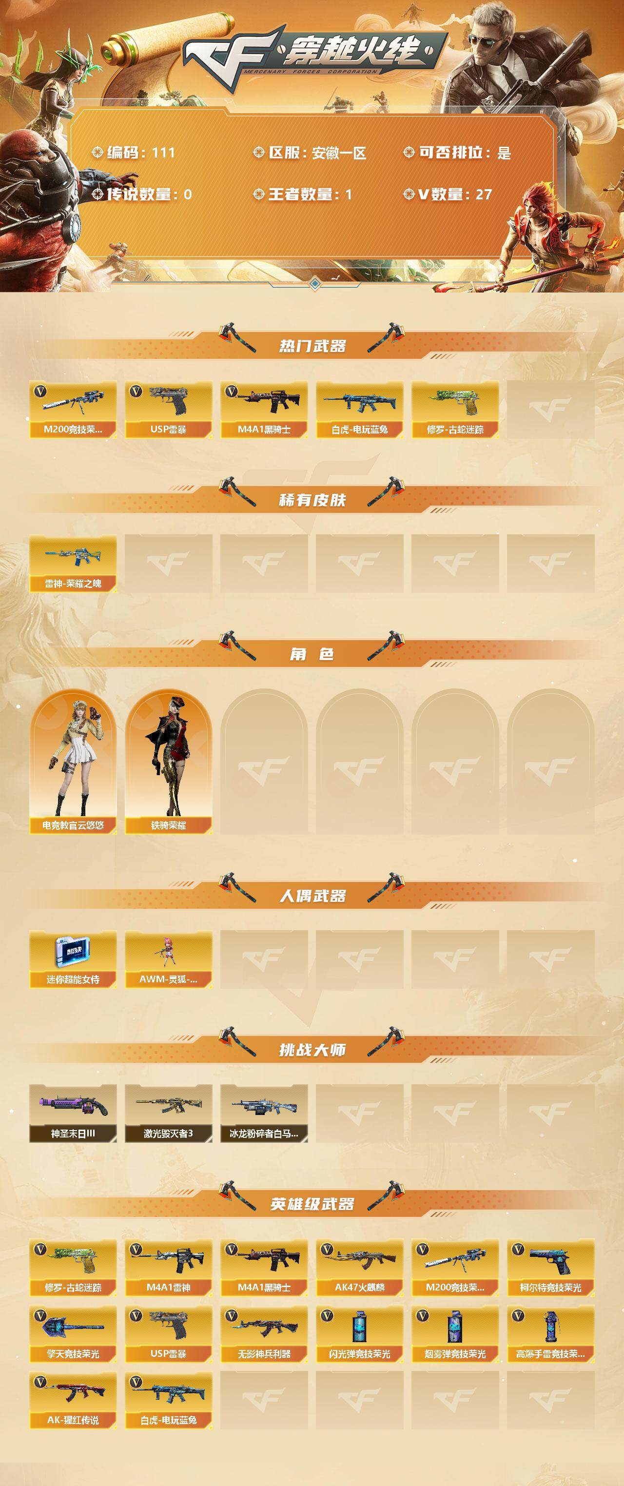 - [13719516]北京一区-71V-6王者-0炫金 【传说武器】:传说圣灵 【热门武器】:传说圣灵,QBZ03-金色蔷薇,M4A1-青龙,M200-幻神,M4A1-黑骑士,汤姆逊-烈龙*5,斯泰尔-蝴蝶,羊驼玩偶,雷神-小红,毁灭-孙三炮,COP-堕天神,COP 357-幻灵,沙鹰-修罗*3,Knife-冠军之刃*2,炽芒蝶刃,荣耀世冠-龙啸,金刚伞 【王者炫金武器】:王者星霆 【音效卡】:M4A1-雷神-云海游龙音效卡,M4A1-黑骑士音效卡 【皮肤】:幻神-冠军之幻,幻神-AG-CFPLS17冠军,幻神-宠儿-2021MVP,雷神-烈虎皮肤,雷神-维纳斯皮肤,雷神-源计划2.0专属 皮肤,火麒麟-轻羽皮肤,传奇石头-横秒之巅,火麒麟-平天大圣,火麒麟-QQ会员,毁灭-黑大圣皮肤,黑龙-冠军之武,黑骑士-AG-S4冠军典藏,AK47-B-常胜将军-曹操,AK47-B-常胜将军-刘备,AK47-B-常胜将军-孙权*2,屠龙-QQ会员,屠龙-春桃 皮肤 【角色】:魅影,影豹,晴雅,战地猎狐,王者-魅影,奇洋探员,乔伊教练,云海玲珑,暗夜-X,风暴女,虎妞,嘉年华灵狐,葵-赛博朋克,兰-新年限定,零-水下丽影,灵狐者-X,灵狐者-职业经理,曼陀罗-X,潘多拉-X,蜀雪,铁骑荣耀 【人偶武器】:雷神-小红,毁灭-孙三炮,迷你宝贝,斯泰尔-蝴蝶,AWM-灵狐-15周年嘉年华,迷你深渊冰龙,夺魂*3,迷你火种,迷你生化手雷,深渊终结者手雷,闪光弹-小乔,闪光弹-貂蝉,高爆手雷-大乔,迷你深渊冰龙-王绿豆,迷你艾比 【挑战大师】:冰龙粉碎者-白马银枪,激光毁灭者III-白马银枪*2,机甲撕裂者III 【英雄级武器】:AK47-火麒麟,M4A1-雷神,M4A1-黑骑士,AN94-超新星,M4A1-青龙,QBZ03-金色蔷薇,烈火-动感闪耀,王者之势-觉醒版,天启-悦智-觉醒版,AK47-B-战神,AK47-B-常胜将军,Barrett-毁灭,AWM-裁决,M200-幻神,王者之光-觉醒版,汤姆逊-烈龙*5,烈龙-云海游龙,沙鹰-修罗*3,COP-堕天神,COP 357-幻灵,USP-神工天巧,天神-动感闪耀,屠龙,麒麟刺-堕天神,幻灵之锋,擎天-竞技荣光,炽芒蝶刃,屠龙-动感闪耀,擎天-云海游龙,龙啸-热带奇洋,荣耀世冠-龙啸,龙啸-堕天神,屠龙-云海游龙,高爆手雷-堕天神*2,高爆手雷-幻灵*