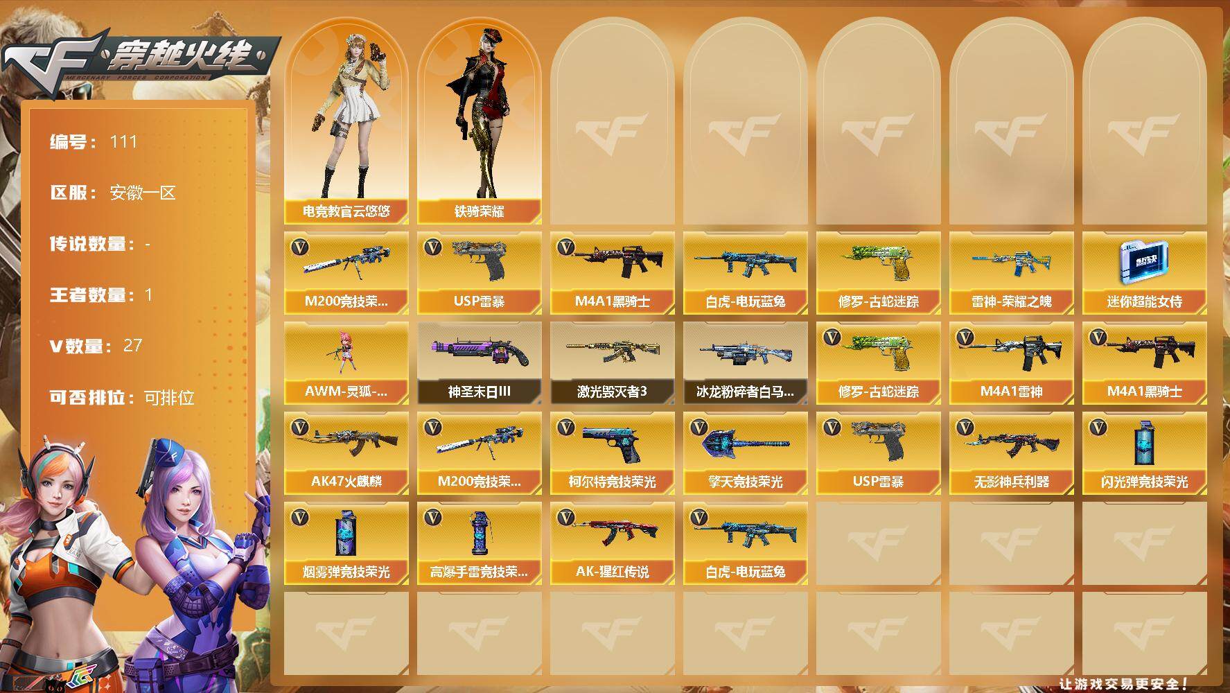 [13036259]【111】25V/102级/荣耀元首/1王者/2英雄/修罗-古蛇迷踪/M200-竞技荣光/白虎-电玩蓝兔/M4A1-黑骑士/USP雷暴/雷神荣耀之魄/电竞教官-云悠悠/铁骑荣耀/AWM-灵狐-15周年嘉年华/迷你超能女侍/神圣爆裂者-末日/激光毁灭者/冰龙粉碎者-白马银枪/柯尔特-竞技荣光/擎天-竞技荣光/高爆手雷-竞技荣光/烟雾弹-竞技荣光/闪光弹-竞技荣光/无影-神兵利器/M4A1-雷神/AK47-火麒麟/AK-47-猩红传说