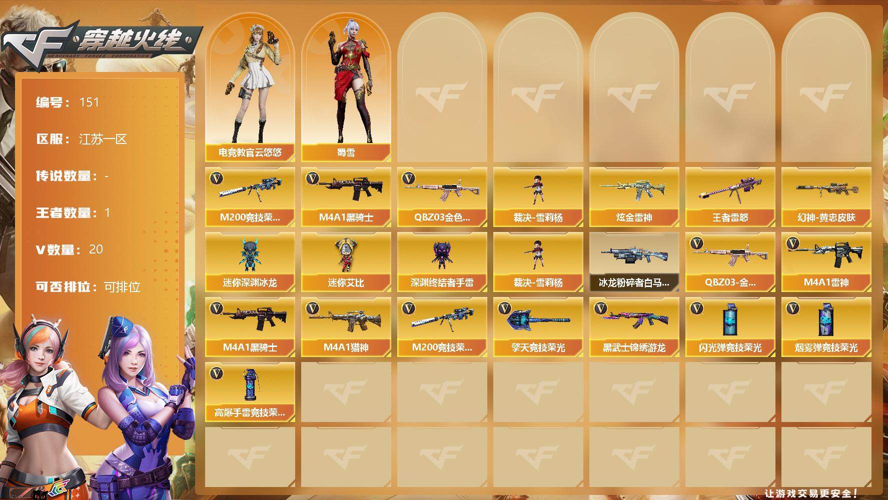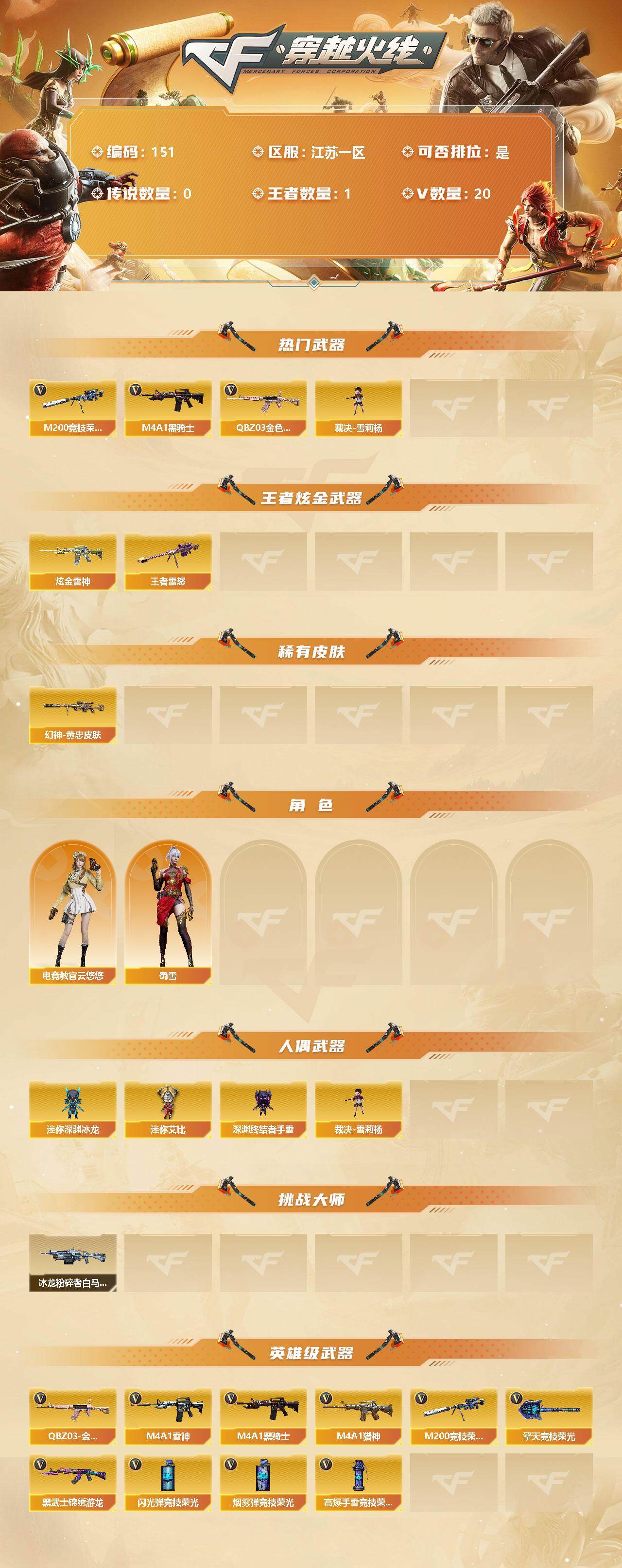 [13036304]【151】18V/79级/将帅/1王者/1炫金/2英雄/QBZ03-金色蔷薇/M200-竞技荣光/M4A1-黑骑士/裁决-雪莉杨/炫金雷神/王者雷怒/M200-幻神-黄忠/电竞教官-云悠悠/蜀雪/迷你深渊冰龙/迷你艾比/深渊终结者手雷/冰龙粉碎者-白马银枪/擎天-竞技荣光/高爆手雷-竞技荣光/烟雾弹-竞技荣光/闪光弹-竞技荣光/M4A1-雷神/M4A1-猎神/AK47-黑武士-锦绣游龙