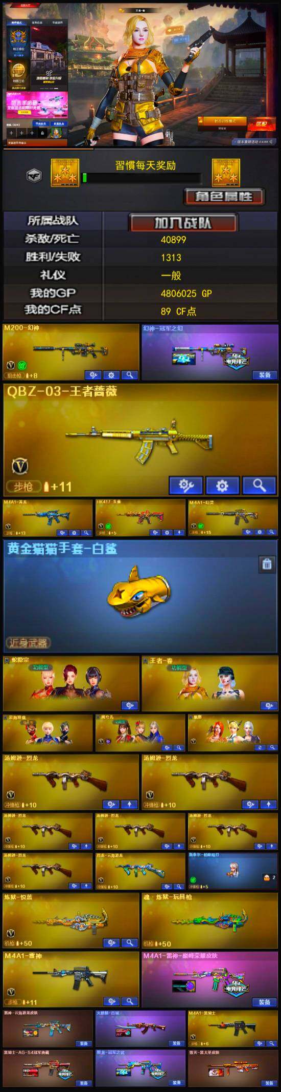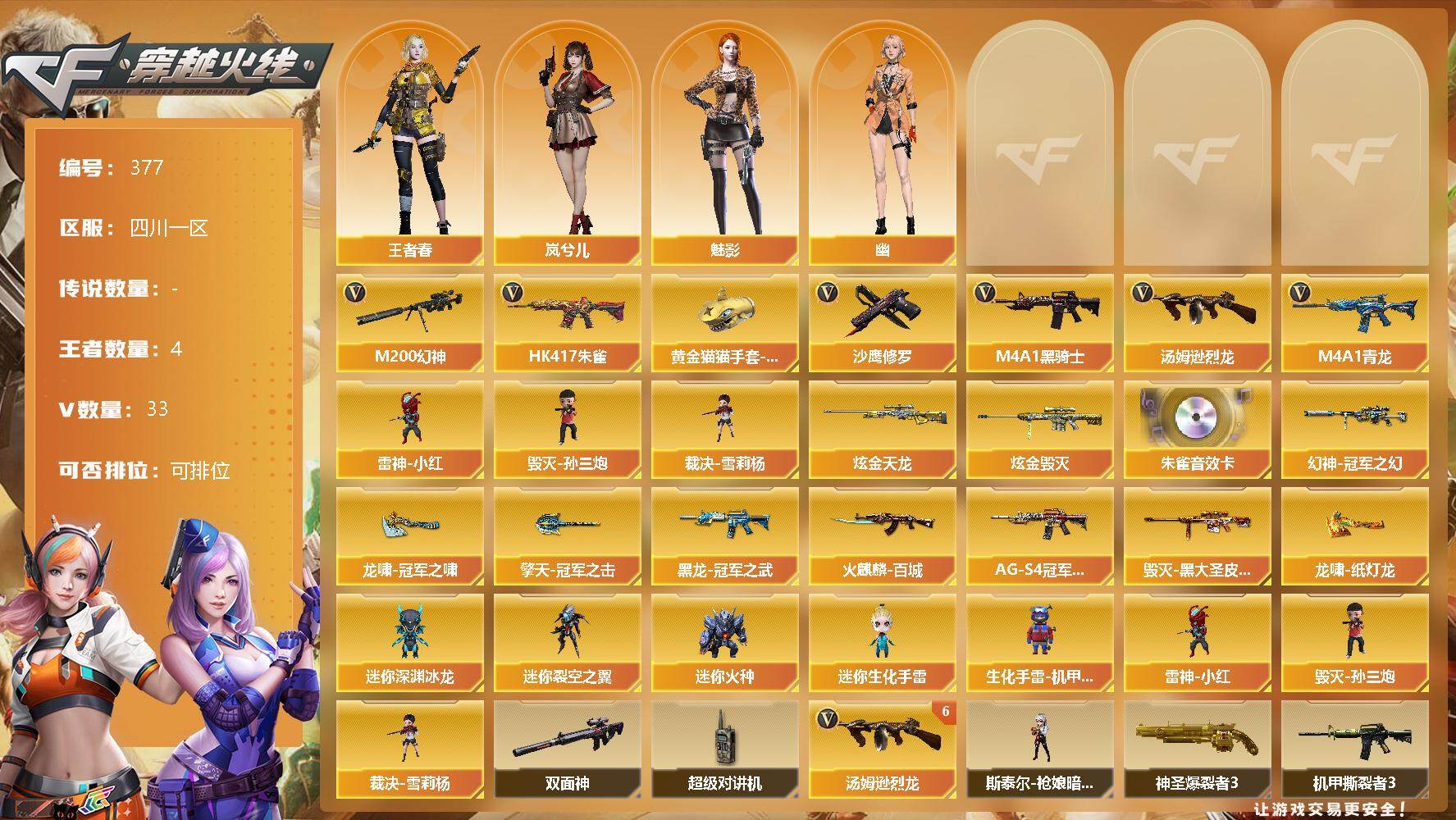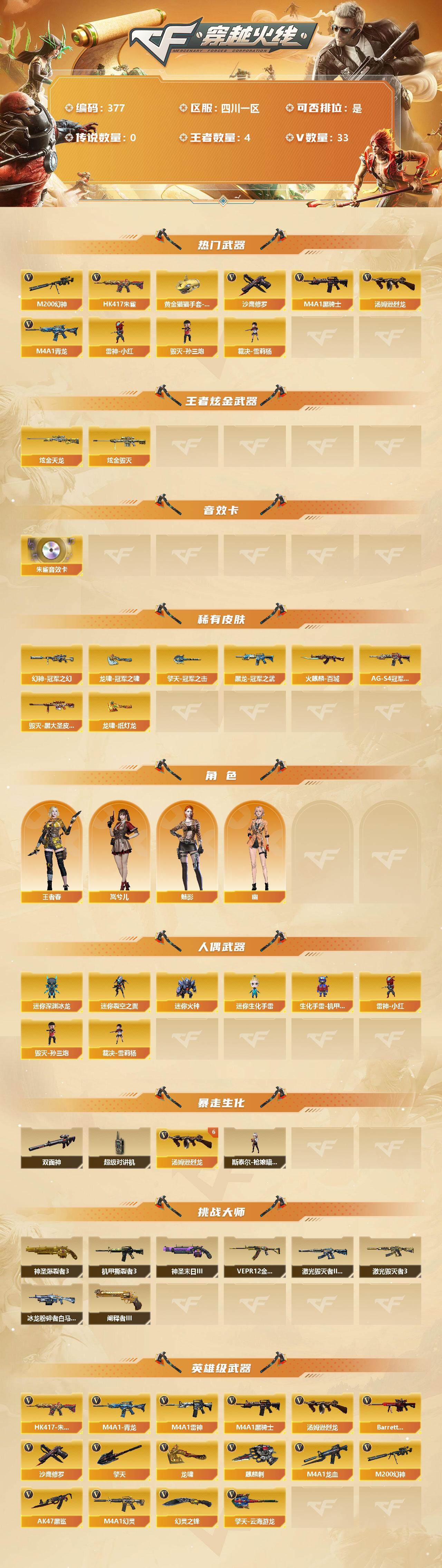 [13036408]【377】31V/89级/将帅/4王者/2炫金/2英雄/HK417-朱雀/M4A1青龙/M200-幻神/M4A1-黑骑士/汤姆逊-烈龙/雷神-小红/毁灭-孙三炮/裁决-雪莉杨/沙鹰-修罗/黄金猫猫手套-白鲨/炫金天龙/炫金毁灭/HK417-朱雀音效卡/死神-雪域霜狐-怀旧音效卡/幻神冠军之幻/M4A1-雷神-巅峰荣耀皮肤/雷神-云海游龙皮肤/火麒麟-百城/毁灭-黑大圣皮肤/黑龙-冠军之武/黑骑士-AG-S4冠军典藏/龙啸-冠军之啸/龙啸-纸灯龙皮肤/擎天-冠军之击/魅影/岚兮儿/王者春/幽/迷你深渊冰龙/迷你裂空之翼/迷你火种/迷你生化手雷/生化手雷-机甲核心/双面神/斯泰尔-枪娘暗刃/超级对讲机/6烈龙/神圣爆裂者/冰龙粉碎者-白马银枪/激光毁灭者III-白马银枪/VEPR-12-金魔/激光毁灭者/机甲撕裂者/神圣爆裂者-末日/阐释者/M4A1-雷神/AK47-黑鲨/M4A1-龙血/M4A1-幻灵/QBZ-03-王者蔷薇-觉醒版/Barrett-极光/炼狱-悦蓝-觉醒版/烈龙-云海游龙/龙啸/擎天/麒麟刺/幻灵之锋/擎天-云海游龙/高爆手雷-幻灵/手雷-云海游龙/闪光弹-幻灵/烟雾弹-幻灵/烟雾弹-古蛇迷踪
