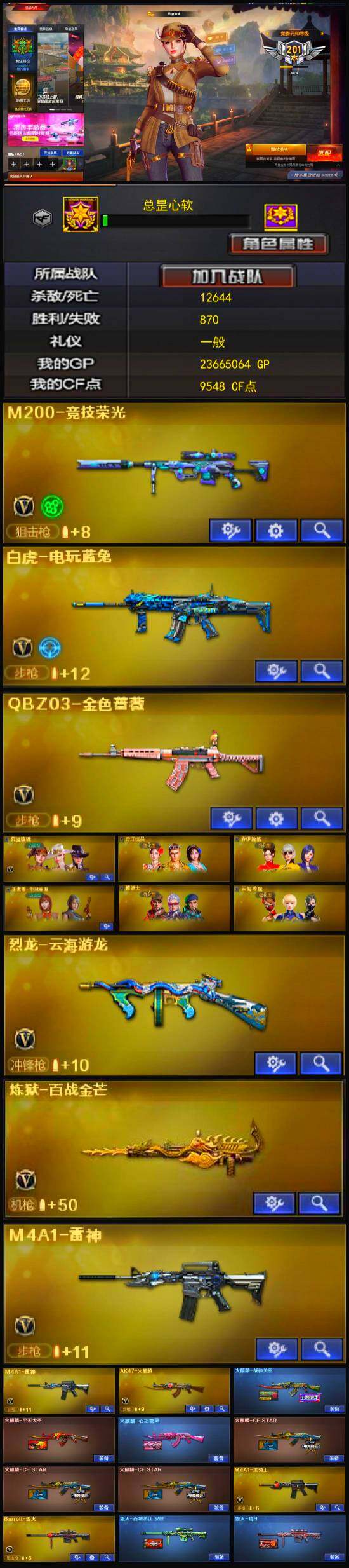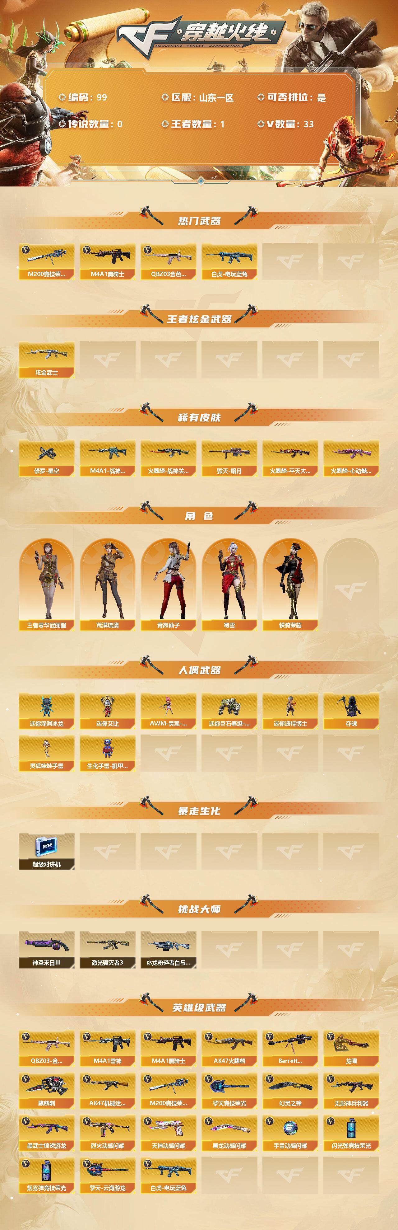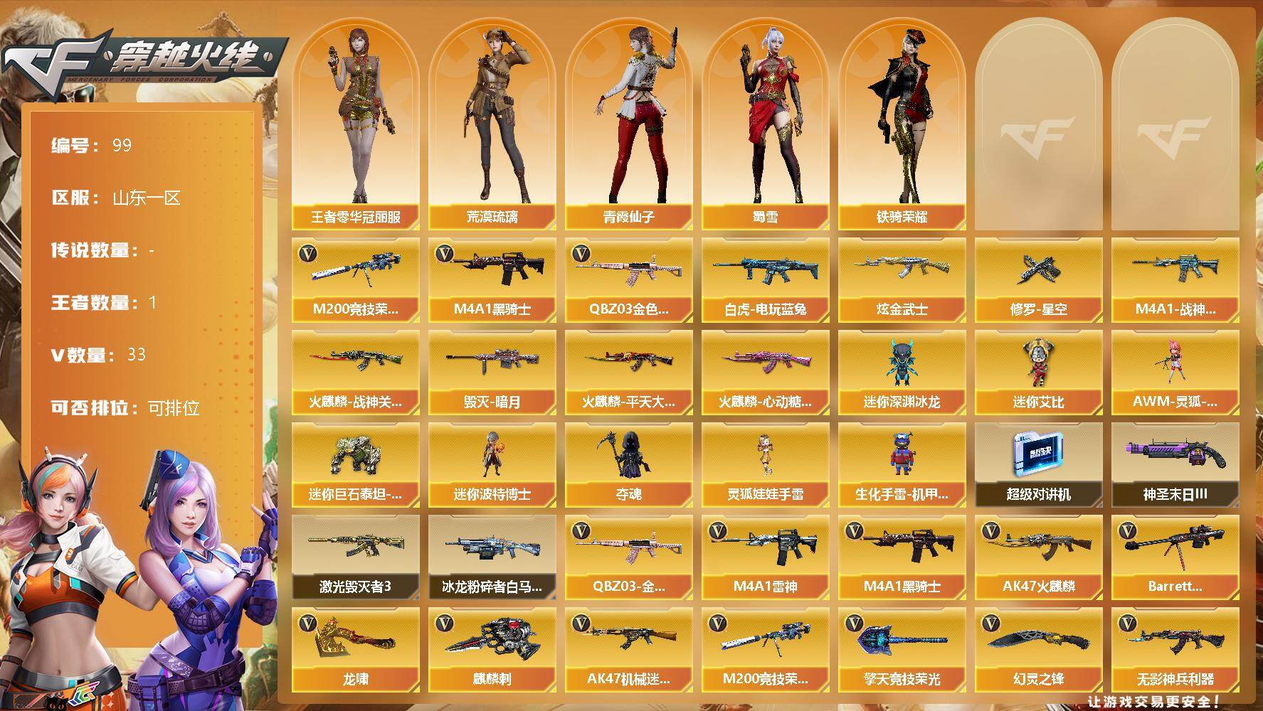 [13036232]【99】31V/102级/荣耀元首/1王者/1炫金/2英雄/QBZ03-金色蔷薇/M200-竞技荣光/白虎-电玩蓝兔/M4A1-黑骑士/炫金黑武士/M4A1-战神赵云/火麒麟-战神关羽/火麒麟-平天大圣/火麒麟-心动糖果/毁灭-暗月/修罗-星空/王者-零-华冠丽服/荒漠琉璃/蜀雪/铁骑荣耀/青霞仙子/AWM-灵狐-15周年嘉年华/迷你深渊冰龙/迷你艾比/迷你巨石泰坦-魔花研究所/迷你波特博士/夺魂/灵狐娃娃手雷/生化手雷-机甲核心/超级对讲机/神圣爆裂者-末日/激光毁灭者/冰龙粉碎者-白马银枪/擎天-竞技荣光/烟雾弹-竞技荣光/闪光弹-竞技荣光/幻灵之锋/烈火-动感闪耀/天神-动感闪耀/屠龙-动感闪耀/手雷-动感闪耀/无影-神兵利器/M4A1-雷神/AK47-火麒麟/Barrett-毁灭/AK47-机械迷城/AK47-黑武士-锦绣游龙/麒麟刺/龙啸/擎天-云海游龙