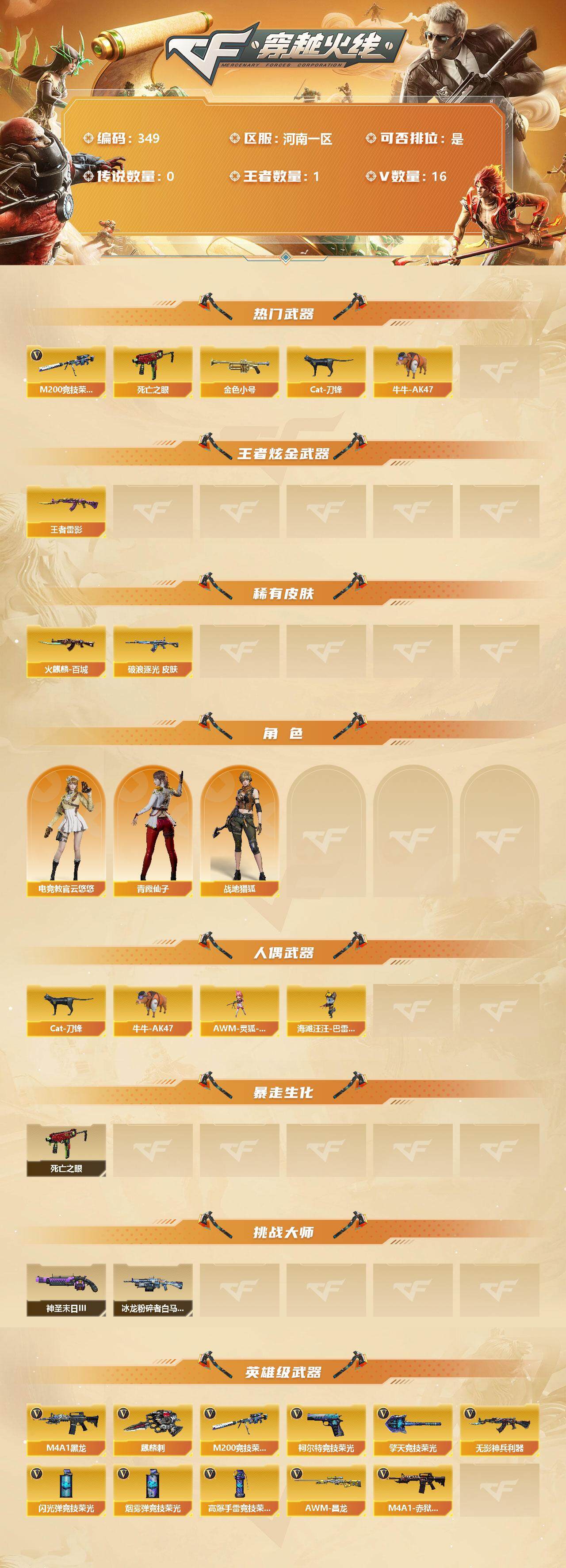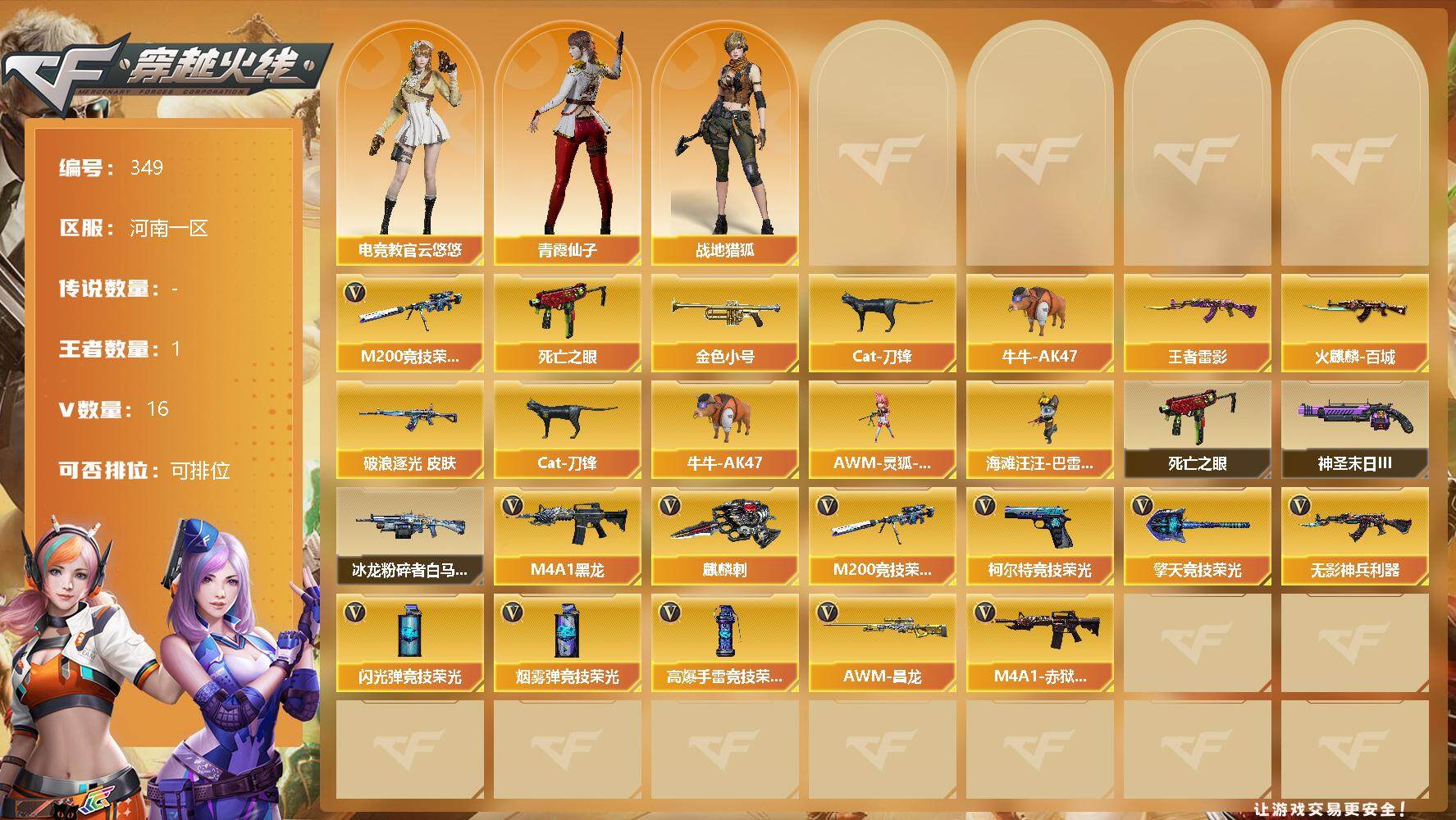 [13036276]【349】14V/93级/将帅/1王者/2英雄/M200-竞技荣光/死亡之眼/金色小号/Cat-刀锋/牛牛-AK47/王者雷影/金色蔷薇-破浪逐光/火麒麟-百城/电竞教官-云悠悠/战地猎狐/青霞仙子/AWM-灵狐-15周年嘉年华/海滩汪汪-巴雷特/神圣爆裂者-末日/冰龙粉碎者-白马银枪/M4A1-黑龙/无影-神兵利器/柯尔特-竞技荣光/麒麟刺/擎天-竞技荣光/高爆手雷-竞技荣光/闪光弹-竞技荣光/烟雾弹-竞技荣光/M4A1-赤狱骑士/AWM-昌龙