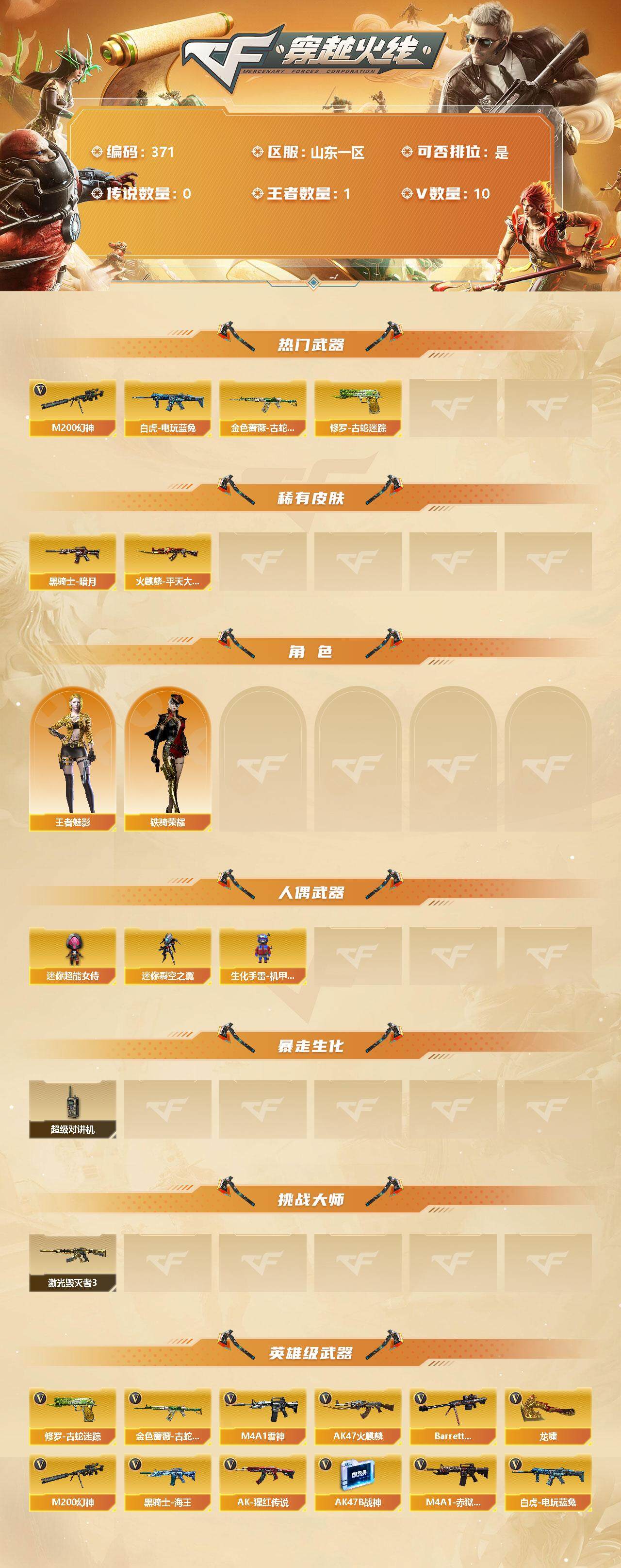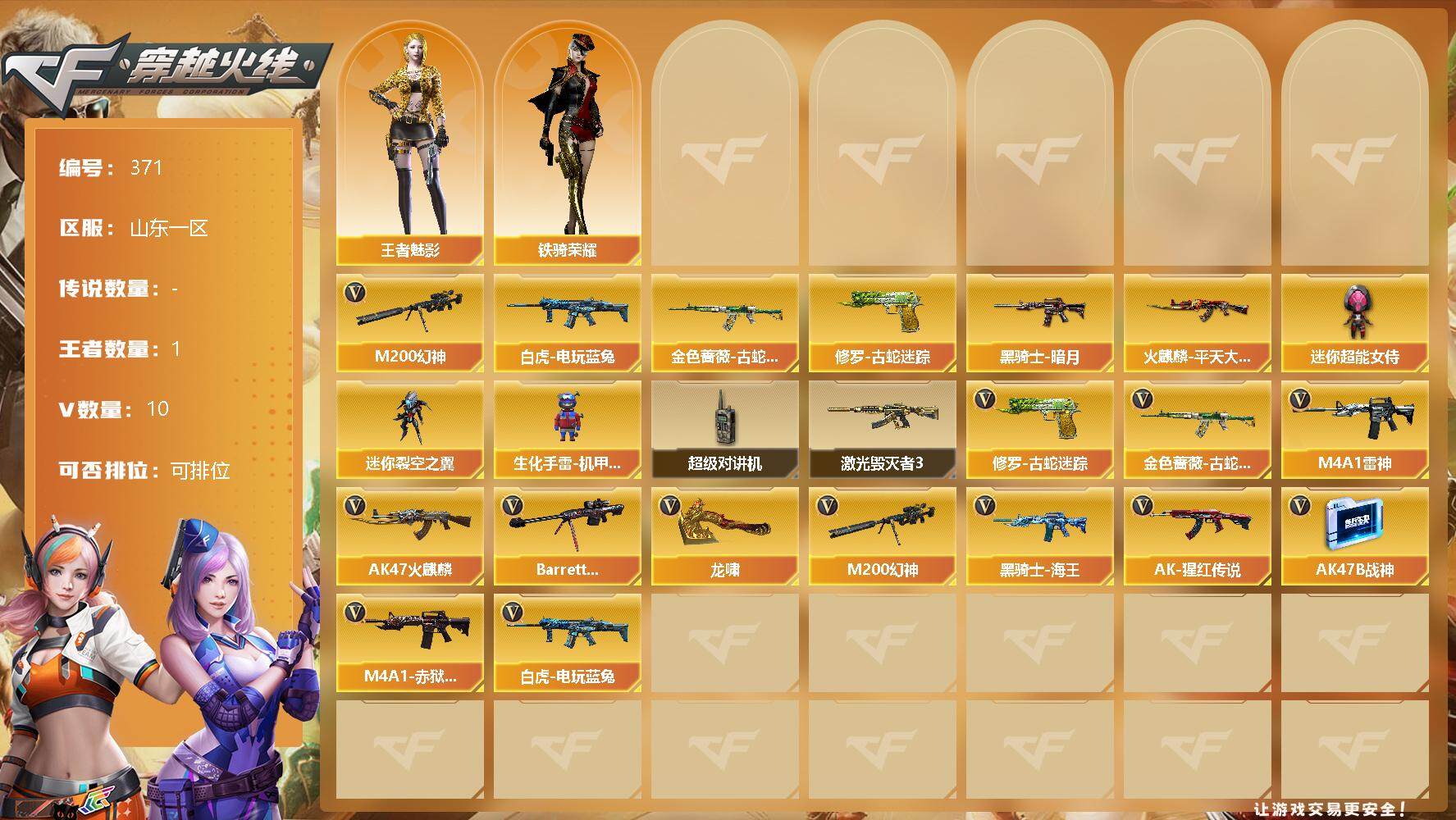 [13036720]【371】10V/102级/荣耀元首/1王者/M200-幻神/金色蔷薇-古蛇迷踪/修罗-古蛇迷踪/白虎-电玩蓝兔/火麒麟-平天大圣/黑骑士-暗月/王者-魅影/铁骑荣耀/迷你超能女侍/迷你裂空之翼/生化手雷-机甲核心/超级对讲机/激光毁灭者/AK47-火麒麟/M4A1-雷神/AK-47-猩红传说/黑骑士-海王/AK47-B-战神/Barrett-毁灭/龙啸/M4A1-赤狱骑士