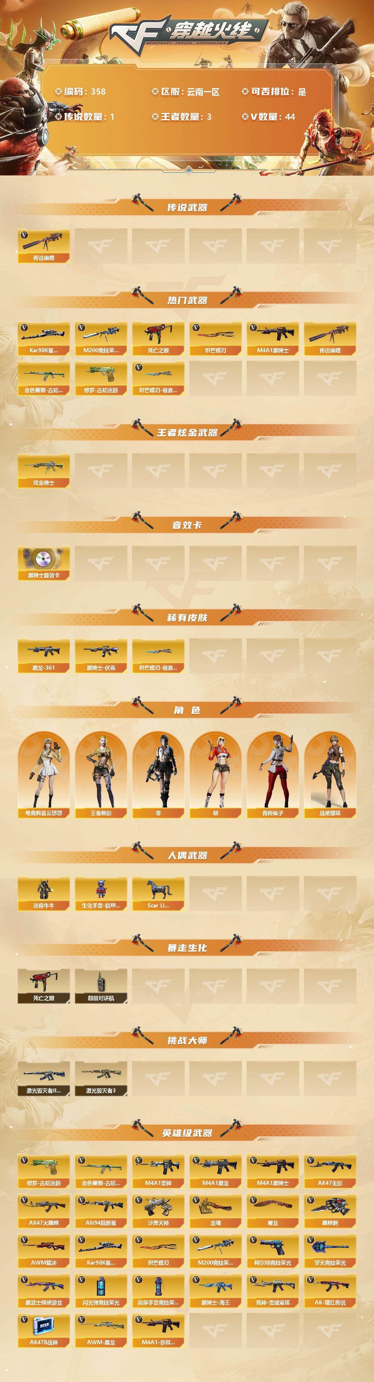 - [12835136]河南一区-54V-12王者-1炫金 【传说武器】:传说光耀 【热门武器】:传说光耀,死亡之眼,炼狱-迷你小钢,汤姆逊-烈龙*7,斯泰尔-蝴蝶,沙鹰-修罗*2 【王者炫金武器】:炫金毁灭,王者之城,王者玄武,王者冰锋 【音效卡】:M4A1-雷神音效卡,Barrett-毁灭音效卡 【稀有皮肤】:雷神-虎将,雷神-R.LGD-CFPLS18冠军,火麒麟-平天大圣,毁灭-暗月,屠龙-春桃 皮肤 【角色】:王者春,瞳,魅影,迷迭香,战地猎狐,青霞仙子 【人偶武器】:斯泰尔-蝴蝶,AWM-灵狐-15周年嘉年华*3,炼狱-迷你小钢,迷你深渊冰龙*5,迷你牛魔王,迷你波特博士,夺魂,迷你生化手雷*2,生化手雷-机甲核心*2,深渊终结者手雷*2 【暴走生化】:斯泰尔-蝴蝶,炼狱-迷你小钢,死亡之眼,超级对讲机 【挑战大师】:神圣爆裂者-末日III*2,激光毁灭者III,激光毁灭者III-白马银枪,冰龙粉碎者-白马银枪*2 【英雄级武器】:USP-神工天巧,唐刀-神工天巧,高爆手雷-竞技荣光,烟雾弹-竞技荣光,闪光弹-竞技荣光*2,黑武士-CF网剧冠军,天神-CF网剧冠军,擎天-CF网剧冠军,烈火-动感闪耀,天神-动感闪耀,屠龙-动感闪耀,手雷-动感闪耀,无影-神兵利器,M4A1-雷神,汤姆逊-烈龙*7,AK12-天启,Barrett-毁灭,AWM-裁决,AA-12-雷霆*2,M4A1-千变,黑骑士-海王,死神-雪域霜狐,M4A1-赤狱骑士,沙鹰-修罗*2,龙啸*3,屠龙*2 【特殊枪械】:蝴蝶斯泰尔+6烈龙,6烈龙,1蝴蝶斯泰尔