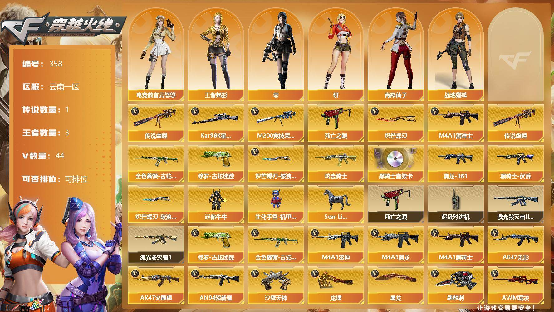 [13036496]【358】39V/100级/元帅/1传说/3王者/1炫金/5英雄/传说幽瞳/金色蔷薇-古蛇迷踪/修罗-古蛇迷踪/M200-竞技荣光/死亡之眼/Kar98k-星神/M4A1-黑骑士/炽芒蝶刃/炽芒蝶刃-破浪逐光/炫金黑骑士/M4A1-黑骑士音效卡/裁决-流光秘银/AWM-裁决-凤灵皮肤/黑骑士-伏羲/M4A1-黑龙-361/零/电竞教官-云悠悠/研/战地猎狐/王者-魅影/青霞仙子/Scar Light-马枪/迷你牛牛/生化手雷-机甲核心/超级对讲机/激光毁灭者III-白马银枪/激光毁灭者/AK47-火麒麟/M4A1-黑龙/M4A1-雷神/AK47-无影/AN94-超新星/AK47-黑武士-锦绣游龙/死神-雪域霜狐/AK-47-猩红传说/黑骑士-海王/AK47-B-战神/AWM-裁决/沙鹰-天神/柯尔特-竞技荣光/屠龙/龙啸/麒麟刺/擎天-竞技荣光/高爆手雷-竞技荣光/闪光弹-竞技荣光/M4A1-赤狱骑士/AWM-昌龙