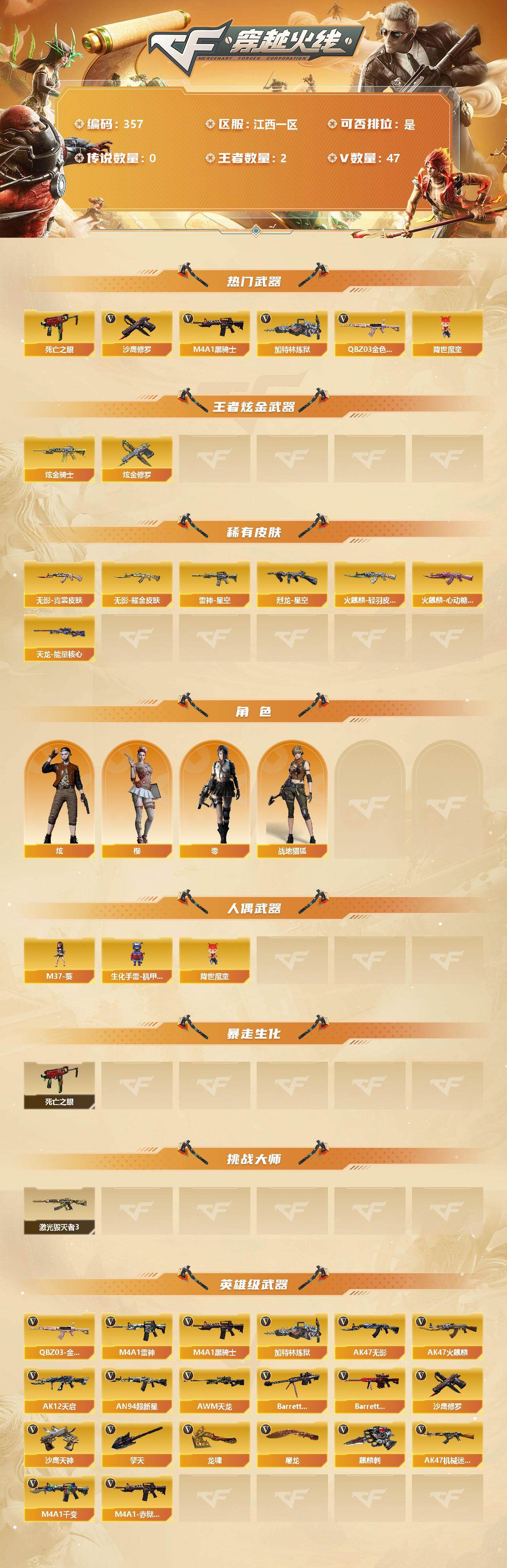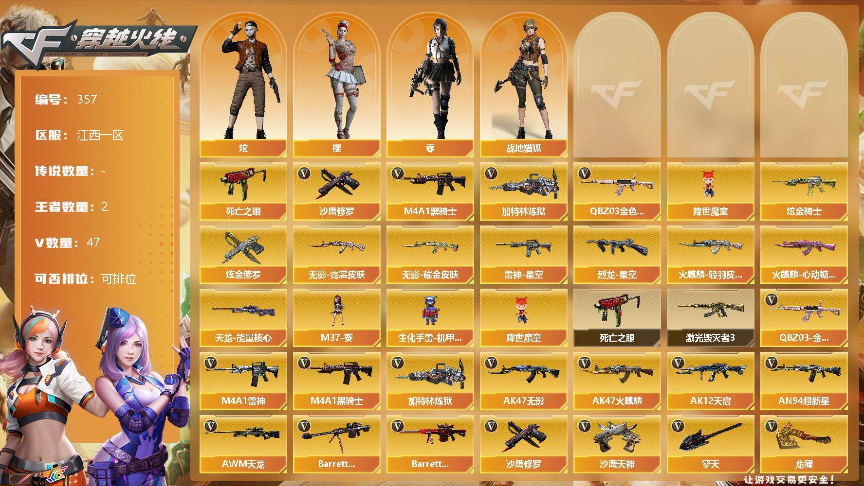 [13036482]【357】43V/95级/将帅/2王者/2炫金/4英雄/QBZ03-金色蔷薇/死亡之眼/M4A1-黑骑士/加特林-炼狱/降世魔童/沙鹰-修罗/炫金黑骑士/炫金修罗/烈龙-星空/雷神-星空/火麒麟-轻羽皮肤/火麒麟-心动糖果/天龙-能量核心/无影耀金皮肤/无影-霓裳皮肤/零/樱/炫/战地猎狐/M37-葵/生化手雷-机甲核心/激光毁灭者/M4A1-千变/AK47-火麒麟/M4A1-雷神/AK47-无影/AK12-天启/AN94-超新星/AK47-机械迷城/AWM-天龙/Barrett-毁灭/Barrett-极光/沙鹰-天神/屠龙/龙啸/擎天/麒麟刺/M4A1-赤狱骑士