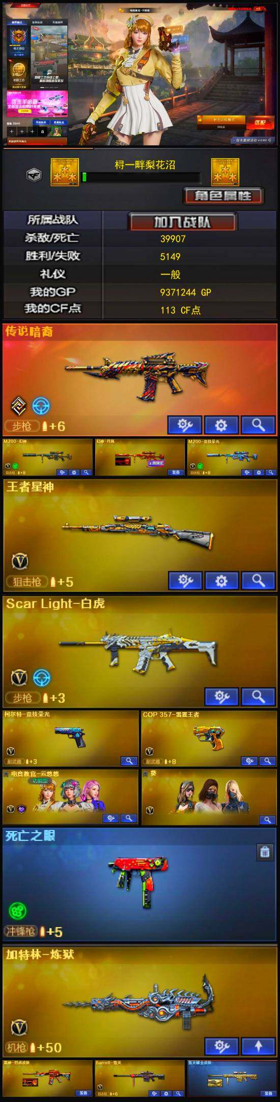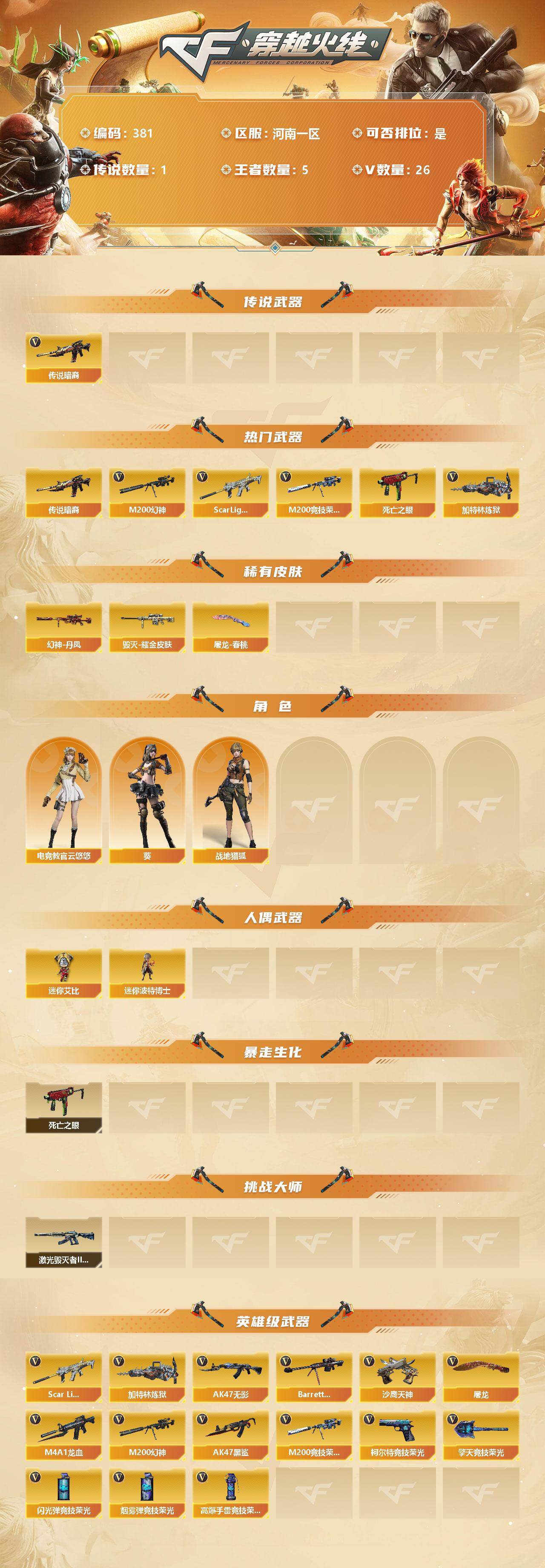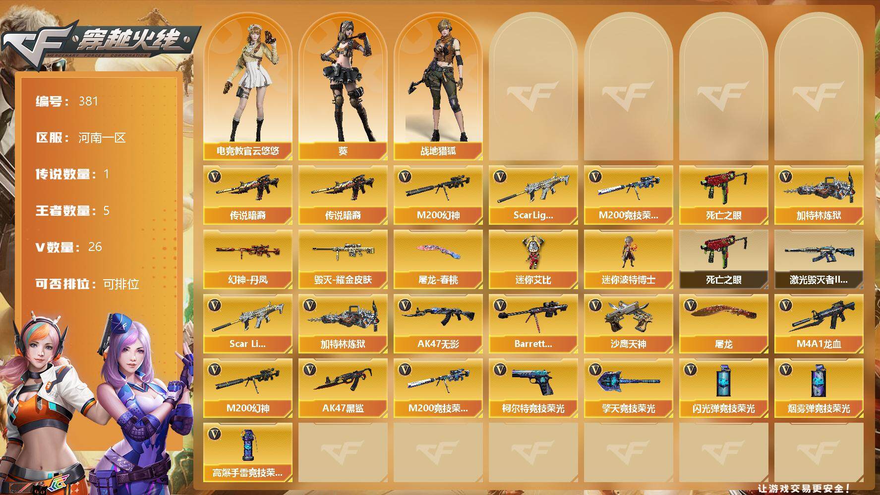 [13036808]【381】23V/91级/将帅/1传说/5王者/3英雄/传说暗裔/Scar Light-白虎/M200-幻神/M200-竞技荣光/死亡之眼/加特林-炼狱/幻神丹凤/雷神-烈虎皮肤/毁灭耀金皮肤/屠龙-春桃/葵/电竞教官-云悠悠/战地猎狐/迷你艾比/迷你波特博士/激光毁灭者III-白马银枪/AK47-无影/AK47-黑鲨/M4A1-龙血/Barrett-毁灭/沙鹰-天神/柯尔特-竞技荣光/屠龙/擎天-竞技荣光/高爆手雷-竞技荣光/闪光弹-竞技荣光/烟雾弹-竞技荣光