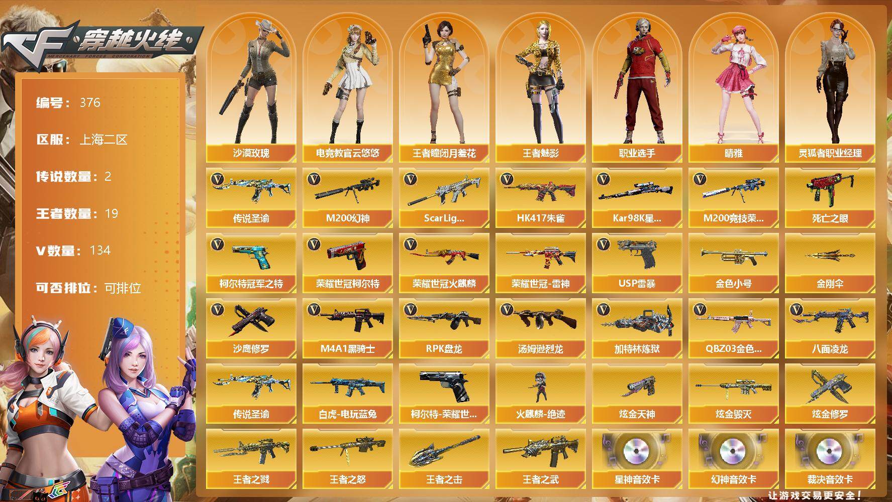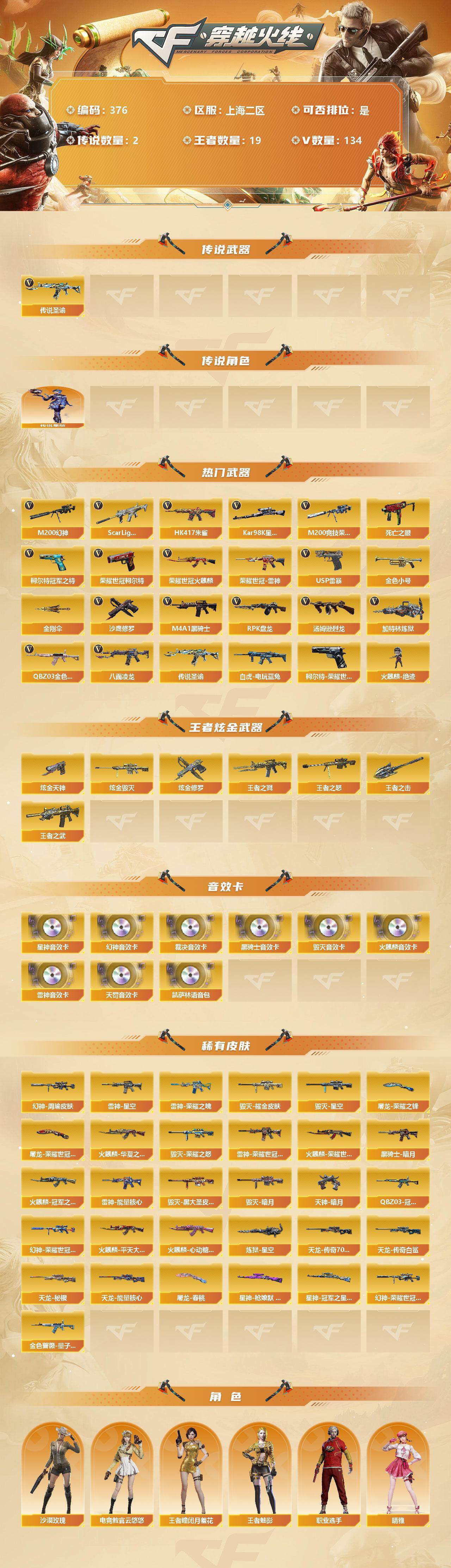 [13036756]【376】127V/102级/荣耀元首/2传说/19王者/5炫金/7英雄/传说圣谕/传说星骇/QBZ03-金色蔷薇/Scar Light-白虎/HK417-朱雀/M200-幻神/柯尔特-荣耀世冠白鲨2023/M200-竞技荣光/八面凌龙/死亡之眼/火麒麟-荣耀世冠/雷神-荣耀世冠/白虎-电玩蓝兔/柯尔特-冠军之特/柯尔特-荣耀世冠/Kar98k-星神/金色小号/M4A1-黑骑士/汤姆逊-烈龙/RPK-盘龙/加特林-炼狱/火麒麟-绝迹/USP雷暴/沙鹰-修罗/金刚伞/王者之戮/王者之武/王者之怒/王者之击/炫金天神/炫金毁灭/炫金修罗/M200-幻神音效卡/AK47-火麒麟音效卡/M4A1-雷神音效卡/M4A1-黑骑士音效卡/Barrett-毁灭音效卡/AWM-裁决音效卡/星神音效卡/枪娘语音包-凯萨林/QBZ03-天罚音效卡/幻神周瑜/M200-幻神-荣耀世冠白鲨/幻神-荣耀世冠白鲨 2023/QBZ03冠军之薇/金色蔷薇-量子蔷薇/裁决-流光秘银/裁决-羽掣 皮肤/裁决-典雅胡桃 皮肤/裁决-运输船 皮肤/星神-枪娘默/Kar98K-星神-冠军之星皮肤/雷神-能量核心/雷神荣耀之魄/雷神-星空/雷神-荣耀世冠AG/雷神-机甲刑天皮肤/M4A1-再燃火线/火麒麟-冠军之心/火麒麟-华夏之心/火麒麟-平天大圣/火麒麟-荣耀世冠AG/火麒麟-心动糖果/毁灭-暗月/毁灭-荣耀之怒/毁灭耀金皮肤/毁灭-星空/毁灭-黑大圣皮肤/黑骑士-暗月/炼狱-星空/天龙-秘银/天龙-能量核心/AWM-天龙-传奇70KG/AWM-天龙-传奇白鲨/天神-暗月/屠龙-荣耀之锋/屠龙-荣耀世冠AG/屠龙-春桃/沙漠玫瑰/电竞教官-云悠悠/晴雅/雨墨/战地猎狐/玄豹/王者-瞳-闭月羞花/王者-魅影/灵狐者-职业经理/职业经理/铁骑荣耀/职业选手/M4A1-雷神-精英刀锋/AK47-斯沃特/AWM-灵狐-15周年嘉年华/迷你超能女侍/迷你深渊冰龙/迷你裂空之翼/闪光弹-貂蝉/斯泰尔-枪娘暗刃/超级对讲机/6烈龙/KAC-圣炎切割者/阐释者/M4A1-千变/AK47-火麒麟/M4A1-黑龙/M4A1-雷神/AK47-黑武士/AN94-超新星/M4A1-武圣/AK47-黑鲨/AK47-雷暴/M4A1-夜魔/QBZ03-天罚/无影-神兵利器/死神-雪域霜狐/M4A1-玫瑰精灵/AK-47-猩红传说/黑骑