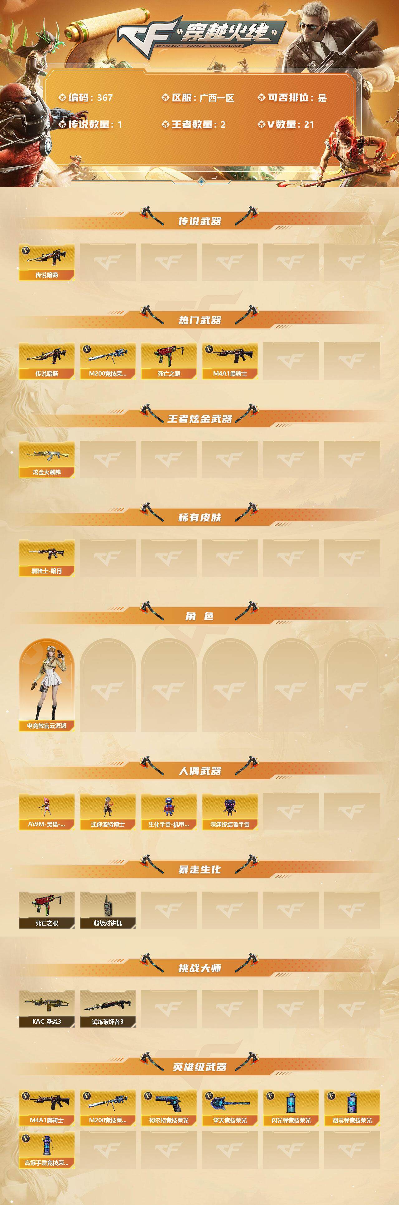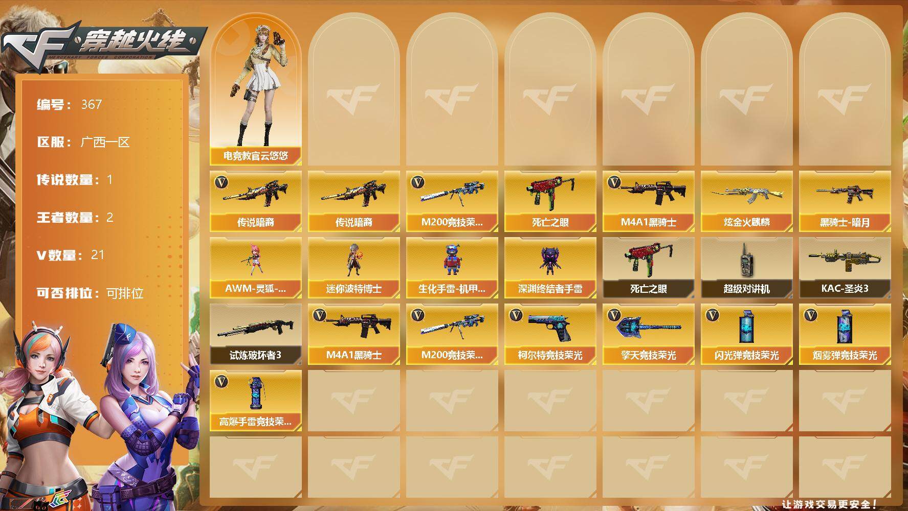 [13036622]【367】19V/90级/将帅/1传说/2王者/1炫金/2英雄/传说暗裔/M200-竞技荣光/死亡之眼/M4A1-黑骑士/炫金火麒麟/黑骑士-暗月/电竞教官-云悠悠/AWM-灵狐-15周年嘉年华/迷你波特博士/生化手雷-机甲核心/深渊终结者手雷/超级对讲机/试炼破坏者/KAC-圣炎切割者/柯尔特-竞技荣光/擎天-竞技荣光/高爆手雷-竞技荣光/闪光弹-竞技荣光/烟雾弹-竞技荣光