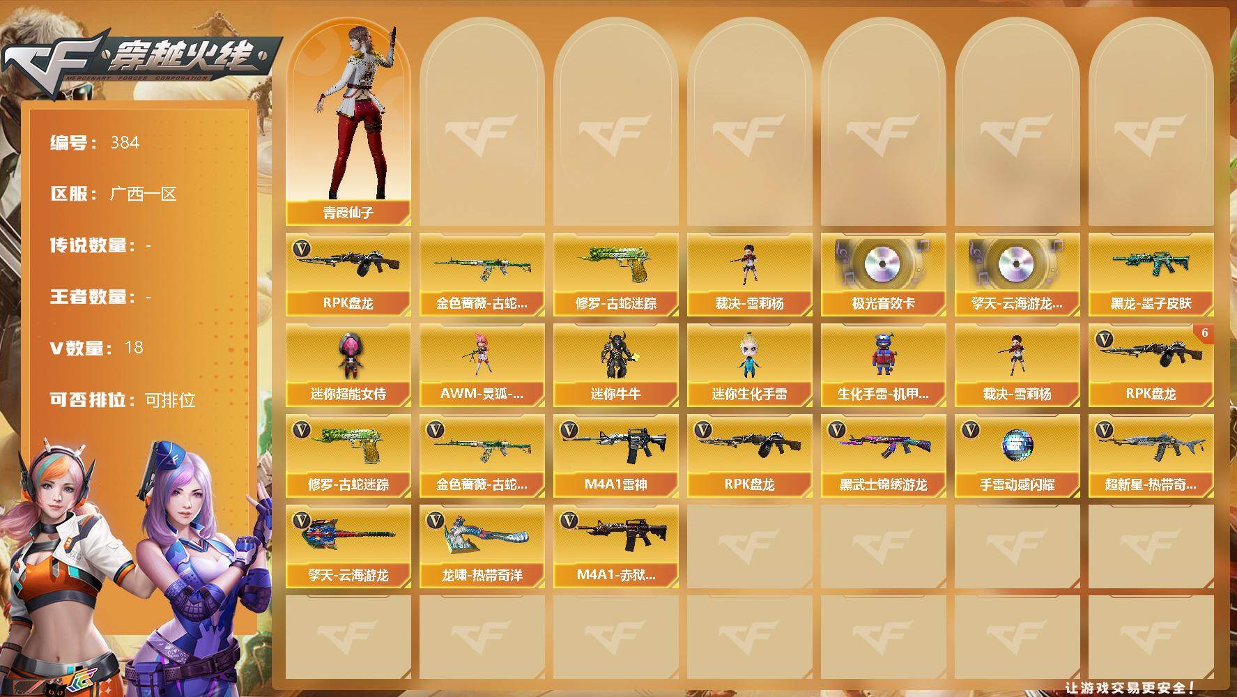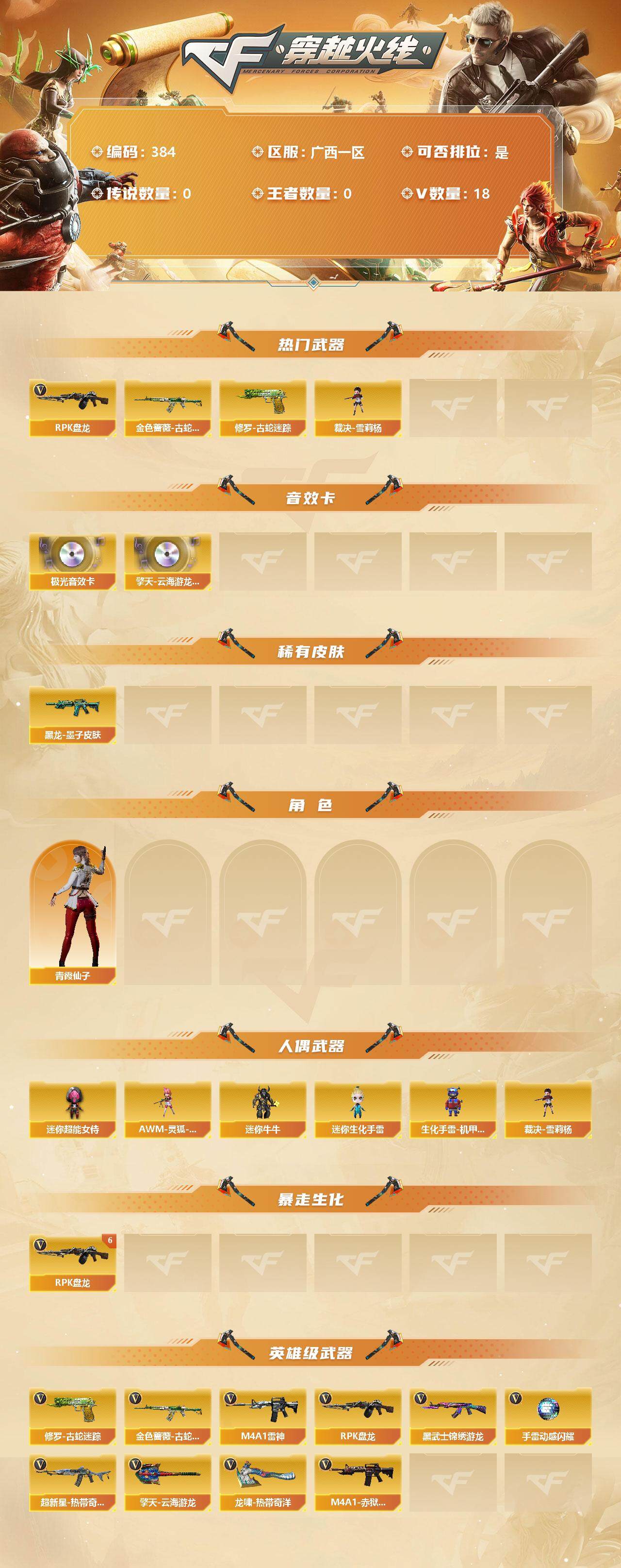 [13036915]【384】17V/96级/将帅/1英雄/金色蔷薇-古蛇迷踪/修罗-古蛇迷踪/RPK-盘龙/裁决-雪莉杨/擎天-云海游龙音效卡/Barrett-极光音效卡/M4A1-再燃火线/毁灭-百城浙江 皮肤/黑龙-墨子皮肤/青霞仙子/AWM-灵狐-15周年嘉年华/迷你超能女侍/迷你牛牛/迷你生化手雷/生化手雷-机甲核心/6盘龙/M4A1-雷神/AK47-黑武士-锦绣游龙/超新星-热带奇洋/擎天-云海游龙/龙啸-热带奇洋/手雷-动感闪耀/M4A1-赤狱骑士