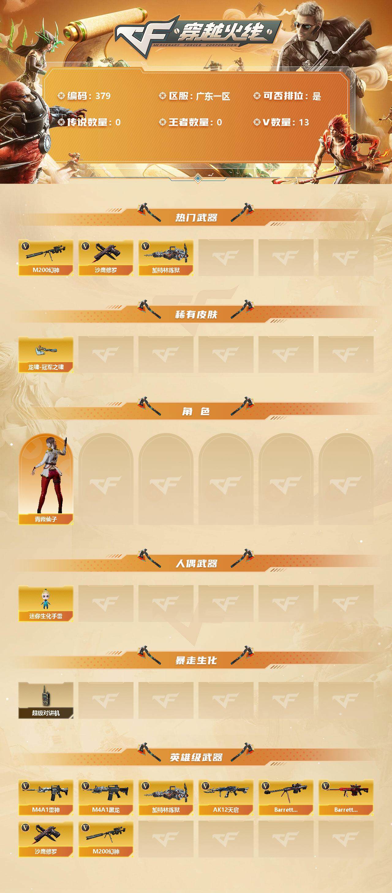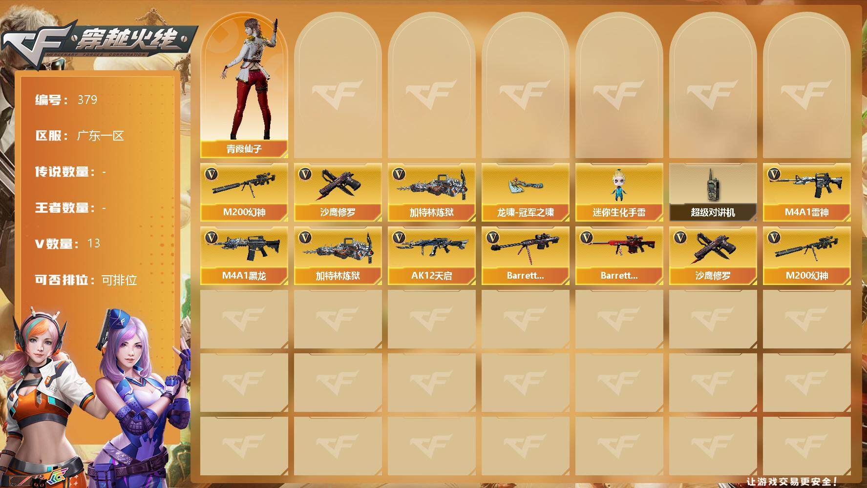 [13036935]【379】13V/87级/将帅/M200-幻神/加特林-炼狱/沙鹰-修罗/毁灭-航天科技皮肤/龙啸-冠军之啸/青霞仙子/迷你生化手雷/超级对讲机/M4A1-黑龙/M4A1-雷神/AK12-天启/Barrett-毁灭/Barrett-极光