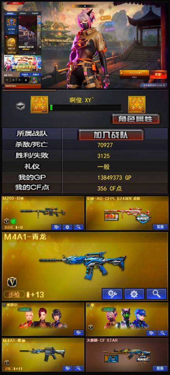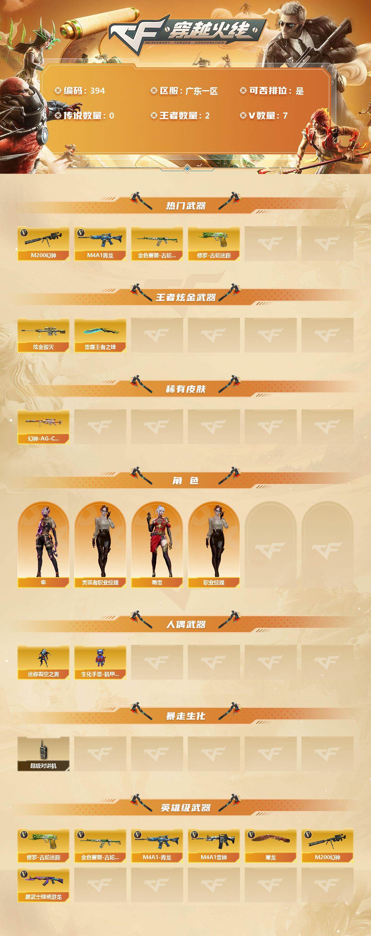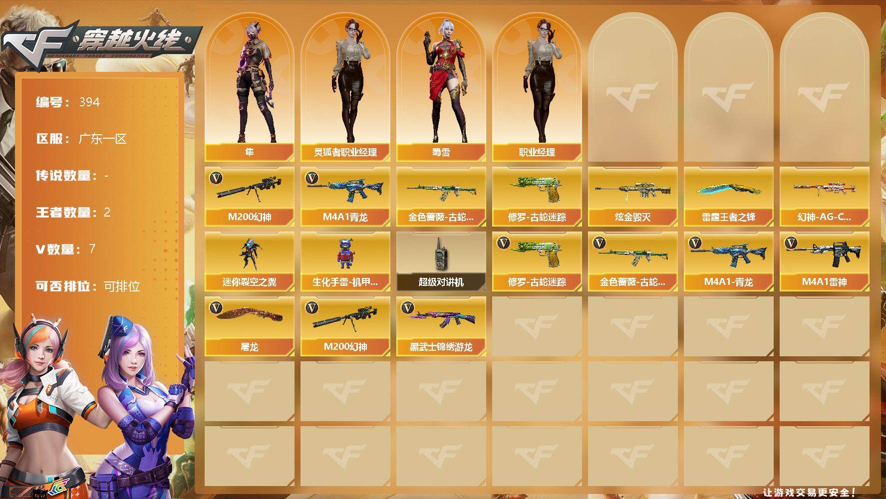 [13037033]【394】6V/97级/将帅/2王者/1炫金/1英雄/M4A1青龙/M200-幻神/金色蔷薇-古蛇迷踪/修罗-古蛇迷踪/雷霆王者之锋/炫金毁灭/幻神-AG-CFPL S24冠军/隼/灵狐者-职业经理/蜀雪/职业经理/迷你裂空之翼/生化手雷-机甲核心/超级对讲机/M4A1-雷神/AK47-黑武士-锦绣游龙/屠龙/高爆手雷-古蛇迷踪/高爆手雷-雷霆王者/烟雾弹-古蛇迷踪