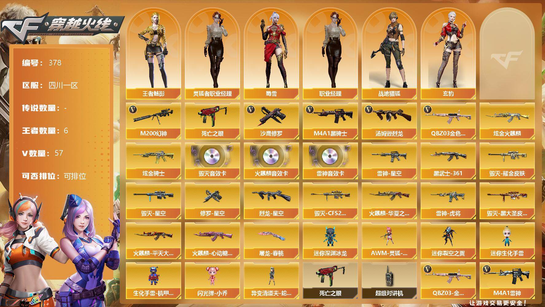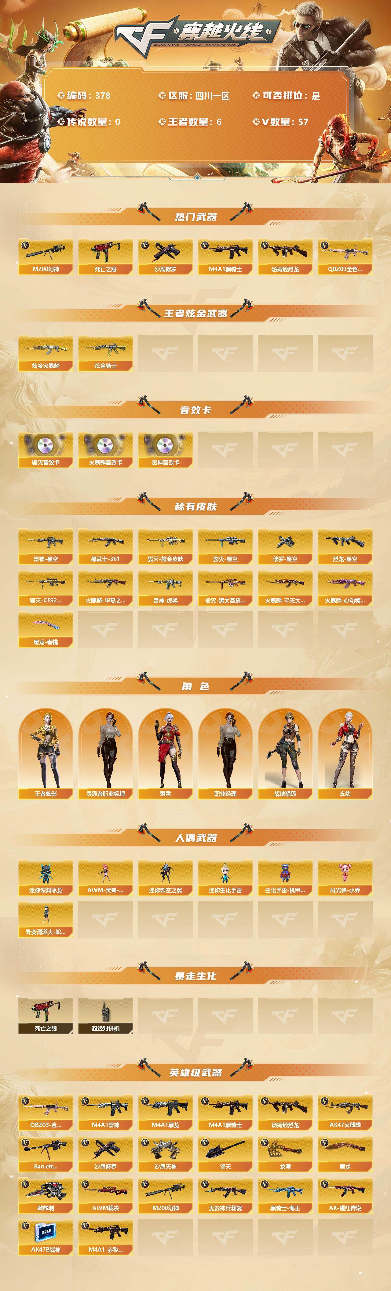 [13036792]【378】54V/100级/元帅/6王者/2炫金/3英雄/QBZ03-金色蔷薇/M200-幻神/死亡之眼/M4A1-黑骑士/汤姆逊-烈龙/沙鹰-修罗/炫金火麒麟/炫金黑骑士/AK47-火麒麟音效卡/M4A1-雷神音效卡/Barrett-毁灭音效卡/裁决-运输船 皮肤/烈龙-星空/雷神-星空/雷神-虎将/雷神-维纳斯皮肤/M4A1-再燃火线/火麒麟-华夏之心/火麒麟-平天大圣/火麒麟-心动糖果/毁灭耀金皮肤/毁灭-星空/毁灭-CFS2020/毁灭-黑大圣皮肤/AK47-黑武士-361/修罗-星空/屠龙-春桃/战地猎狐/玄豹/王者-魅影/灵狐者-职业经理/蜀雪/职业经理/异变清道夫-蛇影双骄/AWM-灵狐-15周年嘉年华/迷你深渊冰龙/迷你裂空之翼/迷你生化手雷/生化手雷-机甲核心/闪光弹-小乔/超级对讲机/AK47-火麒麟/M4A1-黑龙/M4A1-雷神/无影-神兵利器/SCAR Light-玄豹/AK-47-猩红传说/黑骑士-海王/AK47-B-战神/Barrett-毁灭/AWM-裁决/沙鹰-天神/屠龙/龙啸/擎天/麒麟刺/M4A1-赤狱骑士