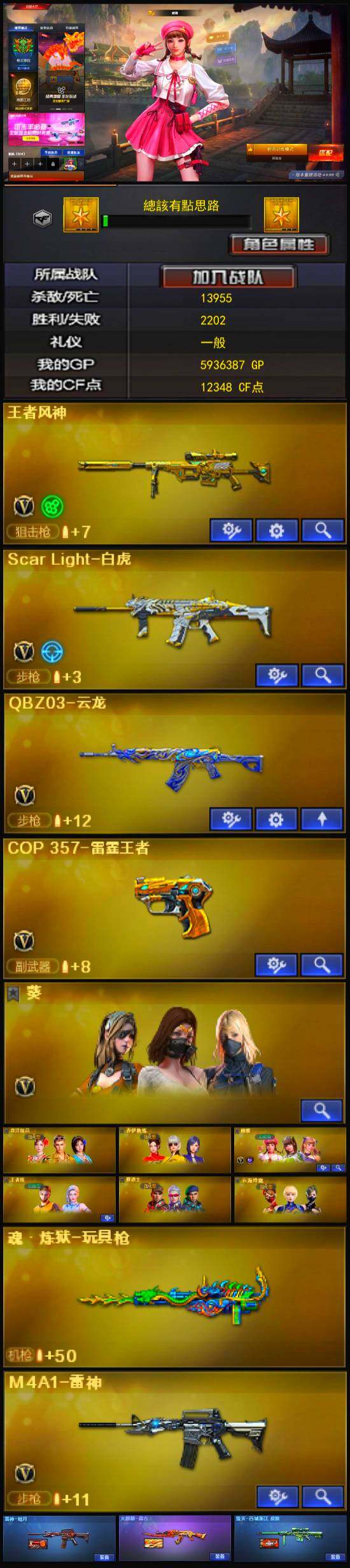 - [12617451]四川一区-68V-7王者-3炫金 【热门武器】:QBZ03-金色蔷薇,HK417-朱雀,M200-幻神,死亡之眼,M4A1-黑骑士,汤姆逊-烈龙*7,RPK-盘龙*3,沙鹰-修罗*6 【王者炫金武器】:炫金火麒麟,炫金毁灭,炫金修罗,王者之幻,王者之魂 【音效卡】:M200-幻神音效卡,AK47-火麒麟音效卡,M4A1-黑骑士音效卡,Barrett-毁灭音效卡 【稀有皮肤】:幻神-周瑜皮肤,雷神-能量核心*2,雷神-星空,火麒麟-AG战队皮肤,火麒麟-百城,毁灭-暗月,毁灭-黑大圣皮肤,天龙-秘银,天龙-能量核心,AWM-天龙-传奇白鲨,天神-暗月,屠龙-荣耀之锋 【角色】:王者-葵-貂蝉,王者之瞳,王者春,零-水下丽影,零,葵,蜀雪,青霞仙子 【人偶武器】:闪光弹-貂蝉,高爆手雷-大乔 【暴走生化】:死亡之眼,超级对讲机 【英雄级武器】:马来剑-夜魔,斩神刀-雷暴,M4A1-武圣,QBZ03-金色蔷薇,HK417-朱雀,M4A1-雷神*3,M4A1-黑龙,M4A1-玫瑰精灵,M4A1-黑骑士,M4A1-死神,RPK-盘龙*3,汤姆逊-烈龙*7,AK47-无影*2,AK47-火麒麟*2,AK47-黑武士,AK12-天启,AWM-天龙,Barrett-毁灭*3,Barrett-极光,AK47-机械迷城,AA-12-雷霆,M200-幻神,AK47-黑鲨,AK-47-猩红传说,AK47-B-战神,AK47-B-常胜将军,沙鹰-天神*2,沙鹰-修罗*6,麒麟刺,擎天*3,龙啸,屠龙*3 【特殊枪械】:1黑骑士,6烈龙,3盘龙