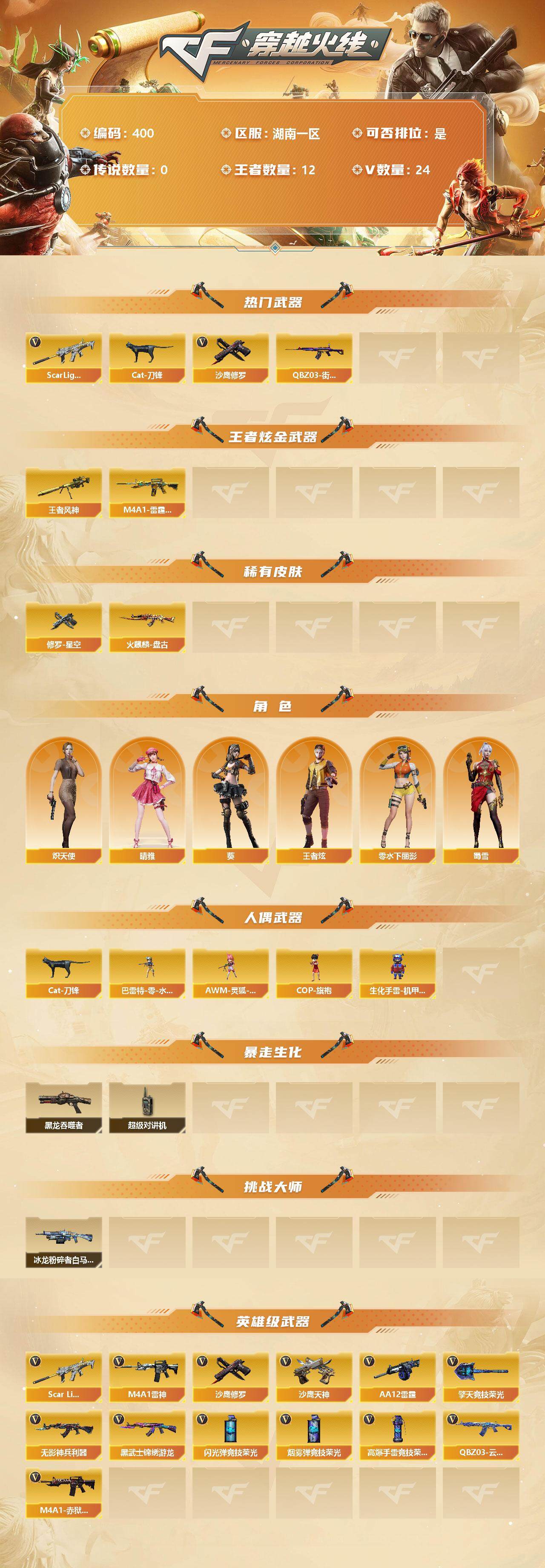 [13037151]【400】22V/77级/将帅/12王者/2英雄/Scar Light-白虎/QBZ03-街机/Cat-刀锋/沙鹰-修罗/M4A1-雷霆王者/王者风神/雷神-暗月/火麒麟-雷神/火麒麟-盘古/毁灭-百城浙江 皮肤/修罗-星空/葵/晴雅/王者炫/零-水下丽影/蜀雪/炽天使/巴雷特-零-水下丽影/AWM-灵狐-15周年嘉年华/COP-旗袍/生化手雷-机甲核心/黑龙吞噬者/超级对讲机/冰龙粉碎者-白马银枪/M4A1-雷神/无影-神兵利器/QBZ03-云龙/AK47-黑武士-锦绣游龙/王者之势-觉醒版/王者火魄-觉醒版/王者龙血-觉醒版/王者之决-觉醒版/AA-12-雷霆/沙鹰-天神/COP 357-雷霆王者-觉醒版/擎天-竞技荣光/高爆手雷-竞技荣光/高爆手雷-云龙/高爆手雷-雷霆王者/闪光弹-竞技荣光/闪光弹-云龙/烟雾弹-竞技荣光/烟雾弹-云龙/M4A1-赤狱骑士