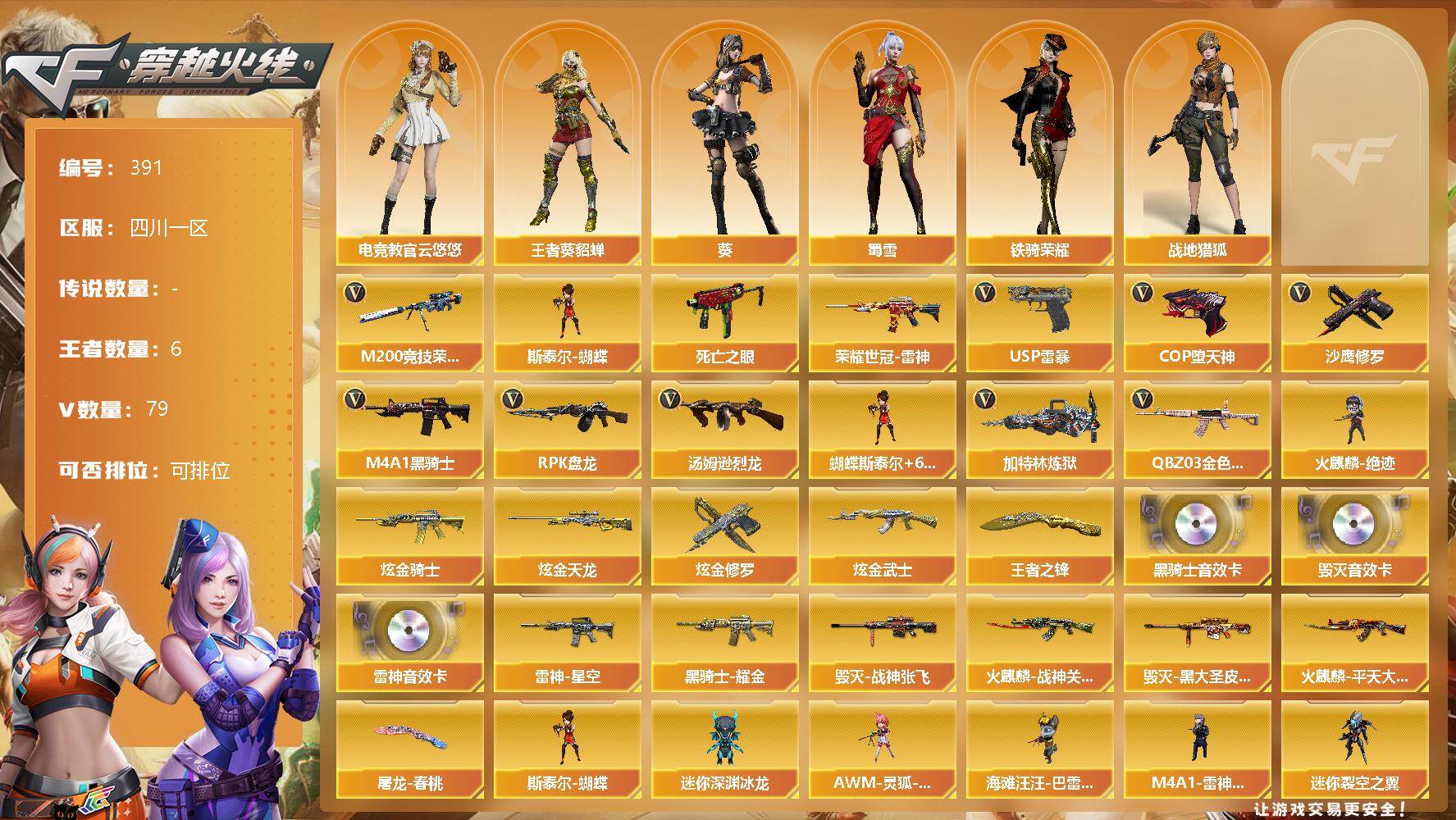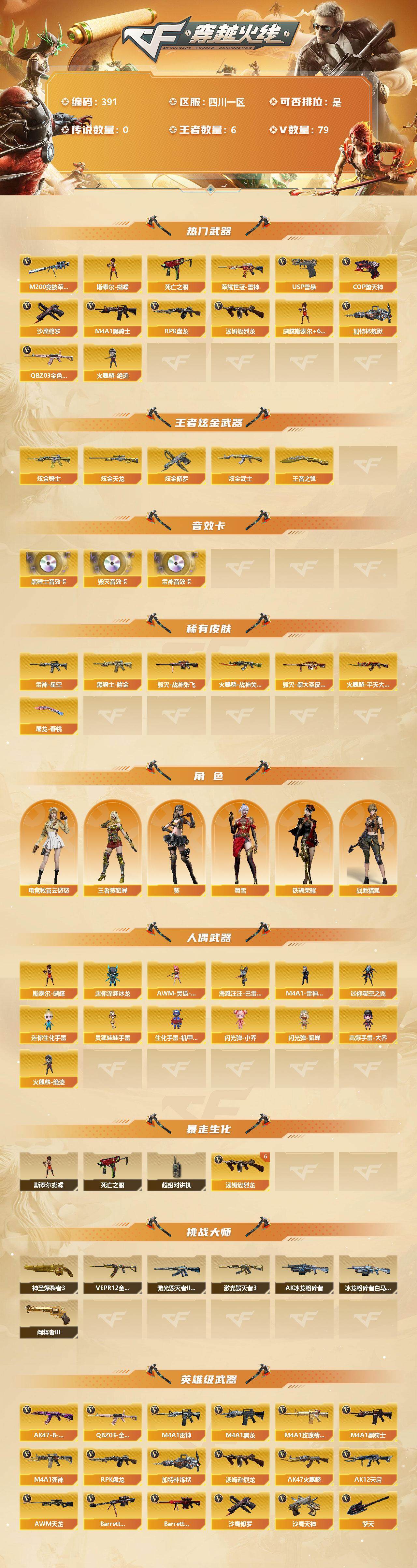 [13036952]【391】76V/102级/荣耀元首/6王者/4炫金/3英雄/QBZ03-金色蔷薇/M200-竞技荣光/死亡之眼/雷神-荣耀世冠/M4A1-黑骑士/汤姆逊-烈龙/RPK-盘龙/加特林-炼狱/斯泰尔蝴蝶/火麒麟-绝迹/USP雷暴/COP-堕天神/沙鹰-修罗/蝴蝶斯泰尔+6烈龙/王者之锋/炫金黑骑士/炫金天龙/炫金修罗/炫金黑武士/M4A1-雷神音效卡/M4A1-黑骑士音效卡/Barrett-毁灭音效卡/裁决-羽掣 皮肤/雷神-暗月/雷神-星空/火麒麟-雷神/火麒麟-战神关羽/火麒麟-平天大圣/毁灭-战神张飞/毁灭-黑大圣皮肤/黑龙-能量核心/黑骑士-耀金皮肤/战神-粉色甜心皮肤/战神-流金岁月皮肤/AK47-B-常胜将军-曹操/AK47-B-常胜将军-刘备/AK47-B-常胜将军-孙权/屠龙-春桃/葵/电竞教官-云悠悠/战地猎狐/王者-葵-貂蝉/蜀雪/铁骑荣耀/M4A1-雷神-精英刀锋/AWM-灵狐-15周年嘉年华/海滩汪汪-巴雷特/迷你深渊冰龙/迷你裂空之翼/迷你生化手雷/灵狐娃娃手雷/生化手雷-机甲核心/闪光弹-小乔/闪光弹-貂蝉/高爆手雷-大乔/超级对讲机/6烈龙/AK47-冰龙粉碎者/神圣爆裂者/冰龙粉碎者-白马银枪/激光毁灭者III-白马银枪/VEPR-12-金魔/激光毁灭者/阐释者/AK47-火麒麟/M4A1-黑龙/M4A1-雷神/M4A1-死神/AK12-天启/QBZ03-云龙/AK47-黑武士-锦绣游龙/M4A1-玫瑰精灵/M4A1-猎神/王者之影-觉醒版/王者之戮-觉醒版/AK47-B-战神/黑骑士-海王/AK47-B-常胜将军/AWM-天龙/Barrett-毁灭/Barrett-极光/AWM-裁决/Barrett-朱雀/沙鹰-天神/屠龙/龙啸/擎天/麒麟刺/斩神刀-雷暴/王者之锋-觉醒版/王者之击-觉醒版/高爆手雷-雷暴/高爆手雷-竞技荣光/闪光弹-雷暴/闪光弹-幻灵/闪光弹-竞技荣光/烟雾弹-雷暴/烟雾弹-竞技荣光/M4A1-赤狱骑士