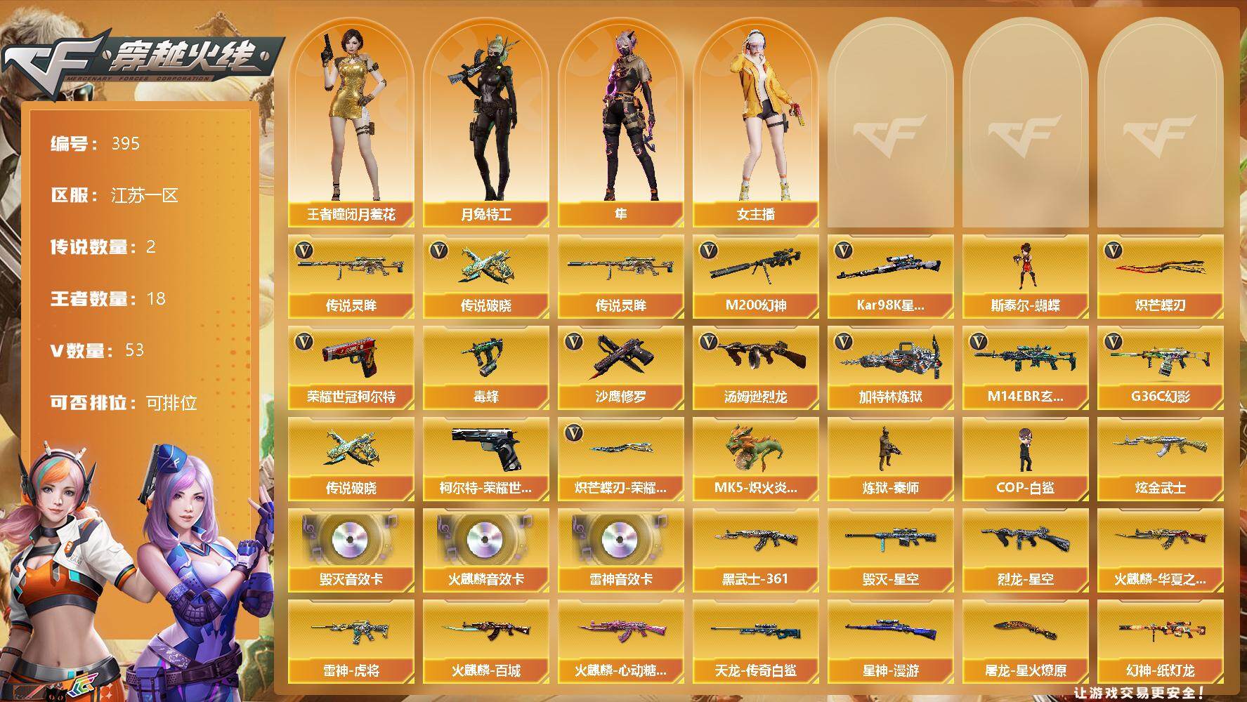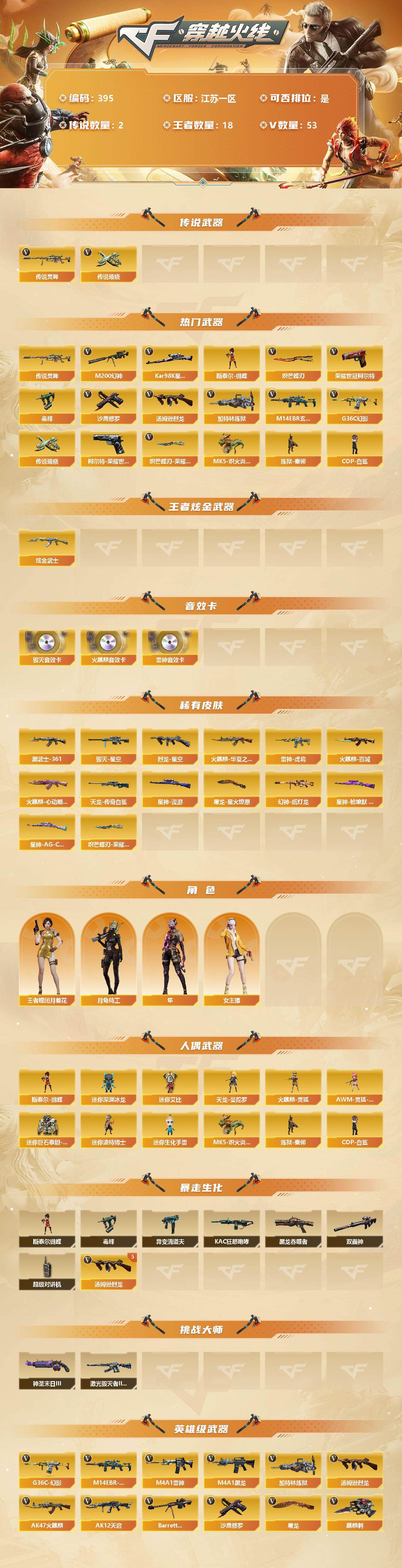 [13037056]【395】51V/95级/将帅/2传说/18王者/1炫金/2英雄/传说灵眸/传说破晓/G36C-幻影/M14EBR-玄武/M200-幻神/柯尔特-荣耀世冠白鲨2023/柯尔特-荣耀世冠/Kar98k-星神/毒蜂/汤姆逊-烈龙/加特林-炼狱/斯泰尔蝴蝶/MK5-炽火炎龙/炼狱-秦师/COP-白鲨/沙鹰-修罗/炽芒蝶刃/炽芒蝶刃- 荣耀世冠白鲨2023/炫金黑武士/AK47-火麒麟音效卡/M4A1-雷神音效卡/Barrett-毁灭音效卡/幻神-纸灯龙皮肤/裁决-流光秘银/星神-枪娘默/星神-漫游/星神-AG-CFPLS21冠军皮肤/烈龙-星空/雷神-暗月/雷神-虎将/火麒麟-华夏之心/火麒麟-百城/火麒麟-心动糖果/毁灭-星空/黑龙-能量核心/黑龙-暗月/AK47-黑武士-361/AWM-天龙-传奇白鲨/屠龙-星火燎原/麒麟刺-萌杀皮肤/月兔特工/隼/王者-瞳-闭月羞花/女主播/天龙-曼陀罗/火麒麟-灵狐/AWM-灵狐-15周年嘉年华/迷你艾比/迷你巨石泰坦-魔花研究所/迷你深渊冰龙/迷你波特博士/迷你生化手雷/异变清道夫/KAC-狂怒咆哮/黑龙吞噬者/双面神/超级对讲机/5烈龙/激光毁灭者III-白马银枪/神圣爆裂者-末日/AK47-火麒麟/M4A1-黑龙/M4A1-雷神/AK12-天启/M4A1-武圣/AK47-机械迷城/QBZ03-天罚/无影-神兵利器/QBZ03-云龙/AK47-黑武士-锦绣游龙/烈火-动感闪耀/王者之烈-觉醒版/QBZ-03-王者蔷薇-觉醒版/Barrett-毁灭/AWM-裁决/王者之力-觉醒版/烈龙-云海游龙/荣耀世冠-柯尔特/Glock18-武圣/天神-动感闪耀/屠龙/麒麟刺/幻灵之锋/屠龙-动感闪耀/擎天-云海游龙/龙啸-热带奇洋/王者之啸-觉醒版/雷霆王者之锋-觉醒版/高爆手雷-幻灵/手雷-动感闪耀/高爆手雷-云龙/手雷-云海游龙/手雷-热带奇洋/高爆手雷-雷霆王者/闪光弹-幻灵/烟雾弹-幻灵