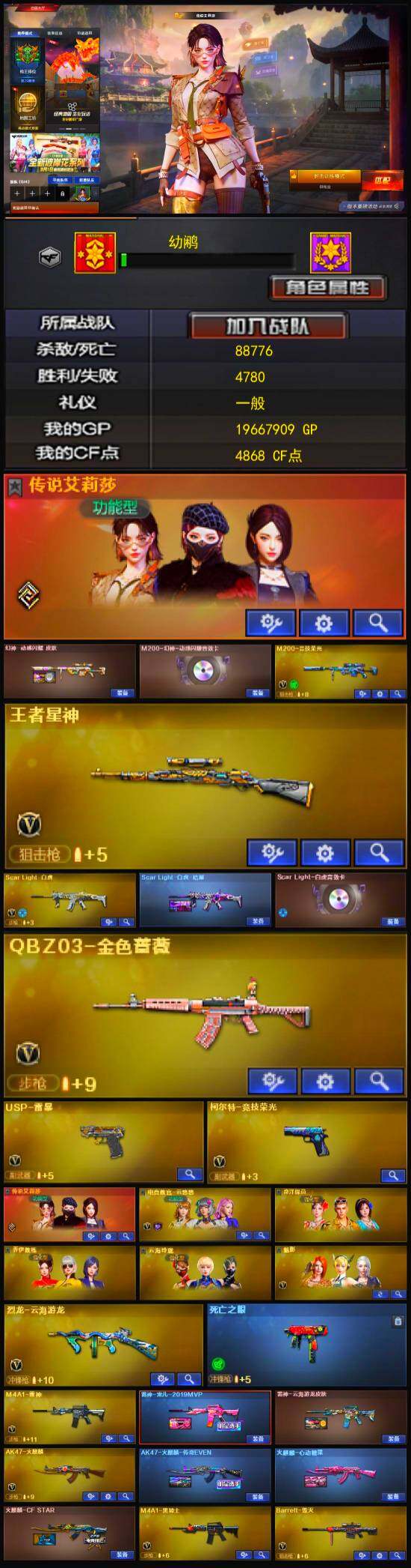 - [10463826]【商品标题】:陕西一区-34V-15王者-3炫金 【角色】:王者-葵-貂蝉,王者-零 【热门武器】:传说辉光,M200-幻神,沙鹰-修罗,M4A1-黑骑士,汤姆逊-烈龙,汤姆逊-烈龙,加特林-炼狱 【王者炫金武器】:炫金天神,炫金毁灭,炫金雷神,王者之怒,王者之刺,王者之心 【稀有皮肤】:雷神-荣耀之魄,毁灭-星空,烈龙-星空,屠龙-荣耀之锋,火麒麟-华夏之心,毁灭-荣耀之怒,幻神-巅峰荣耀 【其他皮肤】:QBZ03-烛龙,AK47-苍龙,98K-冰雪霸主 【人偶武器】:迷你超能女侍,M4A1-雷神-精英刀锋 【音效卡】:火麒麟音效卡,黑骑士音效卡,幻神音效卡,雷神音效卡 【挑战大师】:征服者 【暴走生化】:超级对讲机 【英雄级武器】:M4A1-雷神,M4A1-玫瑰精灵,M4A1-黑骑士,M4A1-死神,加特林-炼狱,汤姆逊-烈龙,汤姆逊-烈龙,AK47-火麒麟,AK47-黑武士,AK12-天启,AK12-天启,AK12-天启,AK12-天启,AK12-天启,AN94-超新星,Barrett-毁灭,Barrett-极光,沙鹰-修罗,擎天,龙啸,龙啸,屠龙,屠龙,屠龙,麒麟刺,AWM-裁决,M4A1-武圣,AA-12-雷霆,Barrett-朱雀,M200-幻神,AK47-黑鲨,M4A1-猎神,QBZ03-金色蔷薇,M4A1-武圣 【特殊枪械】:0白虎,1黑骑士,2烈龙,0盘龙,1炼狱,0蝴蝶斯泰尔