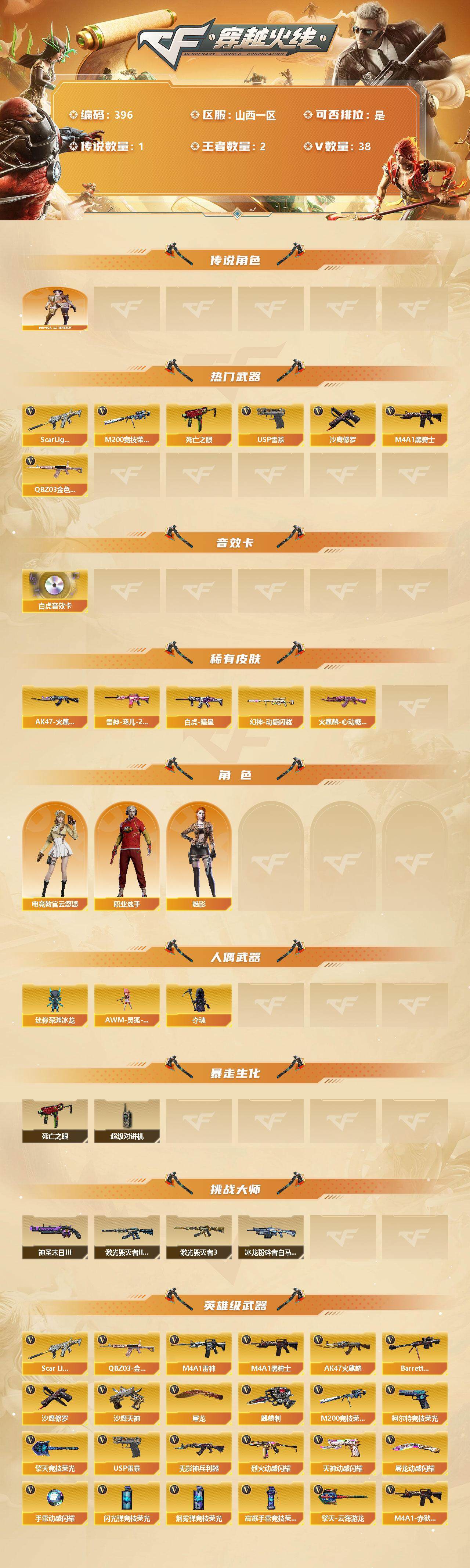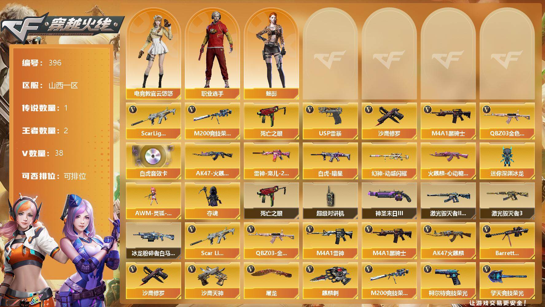 [13037082]【396】36V/100级/大元首/1传说/2王者/2英雄/传说艾莉莎/QBZ03-金色蔷薇/Scar Light-白虎/M200-竞技荣光/死亡之眼/M4A1-黑骑士/USP雷暴/沙鹰-修罗/白虎音效卡/幻神动感闪耀/SCARLight-白虎-暗星/雷神-宠儿-2019MVP/雷神-云海游龙皮肤/雷神-诺拉 皮肤/火麒麟-雷神/AK47-火麒麟-传奇EVEN/火麒麟-心动糖果/无影-能量核心/屠龙-惊鸿 皮肤/麒麟刺-月皮肤/魅影/电竞教官-云悠悠/职业选手/AWM-灵狐-15周年嘉年华/迷你深渊冰龙/夺魂/超级对讲机/冰龙粉碎者-白马银枪/激光毁灭者III-白马银枪/激光毁灭者/神圣爆裂者-末日/AK47-火麒麟/M4A1-雷神/无影-神兵利器/烈火-动感闪耀/王者之武-觉醒版/Barrett-毁灭/王者星神-觉醒版/烈龙-云海游龙/沙鹰-天神/柯尔特-竞技荣光/天神-动感闪耀/屠龙/麒麟刺/擎天-竞技荣光/屠龙-动感闪耀/擎天-云海游龙/高爆手雷-竞技荣光/手雷-动感闪耀/手雷-云海游龙/闪光弹-竞技荣光/烟雾弹-竞技荣光/M4A1-赤狱骑士