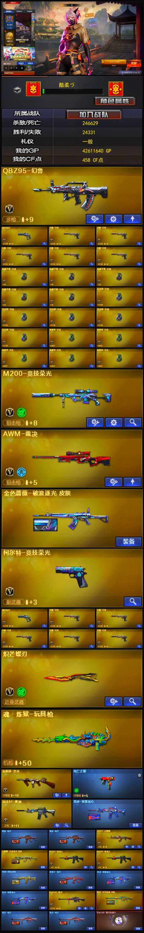 【热门武器】:金色蔷薇-古蛇迷踪,修罗-古蛇迷踪,M200-竞技荣光,死亡之眼,QBZ03-街机,M4A1-黑骑士*2,汤姆逊-烈龙,USP-钞能力灵狐,沙鹰-修罗,炽芒蝶刃,高爆手雷-幻兽*5