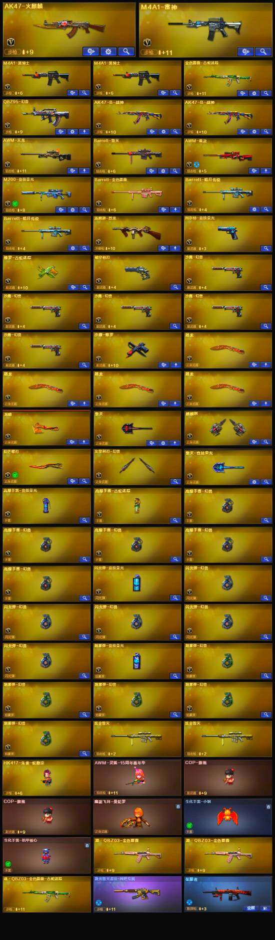 【英雄级武器】:AK47-火麒麟,M4A1-雷神,M4A1-黑骑士*2,金色蔷薇-古蛇迷踪,QBZ95-幻兽,AK-47-猩红传说*3,AK47-B-战神*2,AWM-天龙,Barrett-毁灭,AWM-裁决,M200-竞技荣光,汤姆逊-烈龙,沙鹰-修罗,柯尔特-竞技荣光,破空枪刃,沙鹰-幻兽*5,修罗-古蛇迷踪,屠龙*4,龙啸,擎天,麒麟刺,擎天-竞技荣光,炽芒蝶刃,女皇利刃-幻兽,高爆手雷-幻兽*5,高爆手雷-竞技荣光,高爆手雷-古蛇迷踪,闪光弹-竞技荣光,烟雾弹-竞技荣光,烟雾弹-古蛇迷踪,M4A1-赤狱骑士