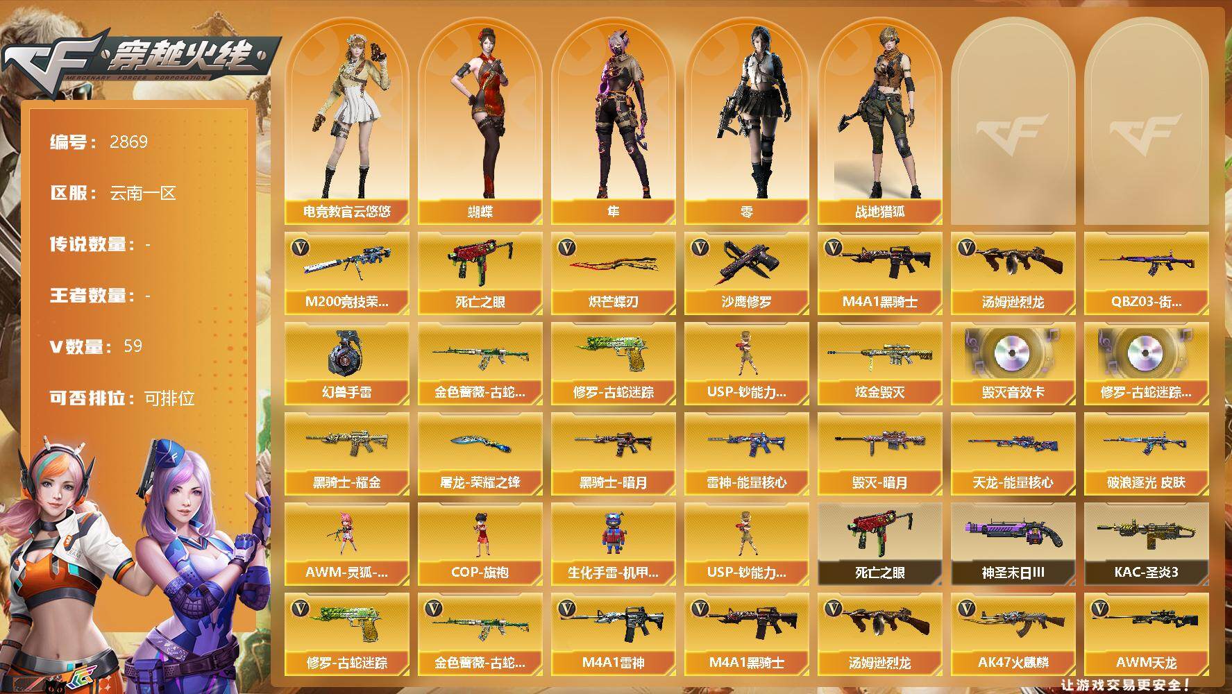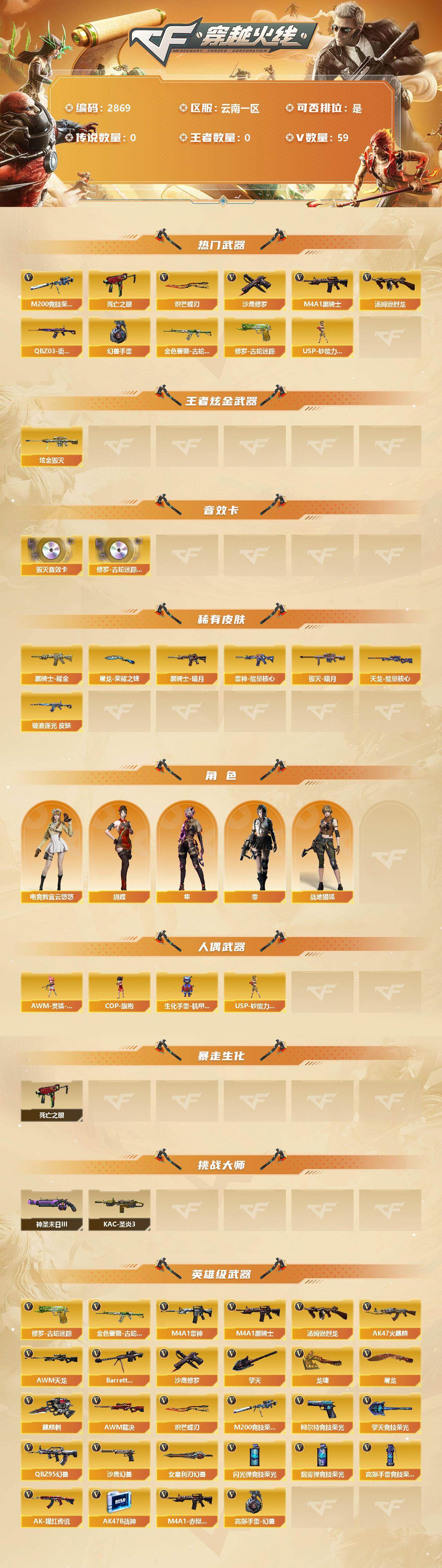 [13038881]云南一区-59V-0王者-2炫金 【热门武器】:金色蔷薇-古蛇迷踪,修罗-古蛇迷踪,M200-竞技荣光,死亡之眼,QBZ03-街机,M4A1-黑骑士*2,汤姆逊-烈龙,USP-钞能力灵狐,沙鹰-修罗,炽芒蝶刃,高爆手雷-幻兽*5 【王者炫金武器】:炫金毁灭*2 【音效卡】:修罗-古蛇迷踪音效卡,Barrett-毁灭音效卡,AWM-昌龙-怀旧音效卡 【皮肤】:金色蔷薇-破浪逐光 皮肤,雷神-暗月*2,雷神-能量核心,火麒麟-玉面羞花 皮肤,毁灭-暗月*2,毁灭-定军扬威 皮肤,黑龙-能量核心*2,黑骑士-暗月,黑骑士耀金皮肤,无影-暗月,死神-秘银,战神-流金岁月皮肤,天龙-能量核心,极光-能量核心*2,修罗-能量核心,屠龙-荣耀之锋,屠龙-破浪逐光 皮肤 【角色】:零,蝴蝶,电竞教官-云悠悠,隼,战地猎狐 【人偶武器】:USP-钞能力灵狐,AWM-灵狐-15周年嘉年华,COP-旗袍*2,生化手雷-机甲核心 【暴走生化】:死亡之眼 【挑战大师】:KAC-圣炎切割者III,神圣爆裂者-末日III 【英雄级武器】:AK47-火麒麟,M4A1-雷神,M4A1-黑骑士*2,金色蔷薇-古蛇迷踪,QBZ95-幻兽,AK-47-猩红传说*3,AK47-B-战神*2,AWM-天龙,Barrett-毁灭,AWM-裁决,M200-竞技荣光,汤姆逊-烈龙,沙鹰-修罗,柯尔特-竞技荣光,破空枪刃,沙鹰-幻兽*5,修罗-古蛇迷踪,屠龙*4,龙啸,擎天,麒麟刺,擎天-竞技荣光,炽芒蝶刃,女皇利刃-幻兽,高爆手雷-幻兽*5,高爆手雷-竞技荣光,高爆手雷-古蛇迷踪,闪光弹-竞技荣光,烟雾弹-竞技荣光,烟雾弹-古蛇迷踪,M4A1-赤狱骑士 【特殊枪械】:2黑骑士,1烈龙