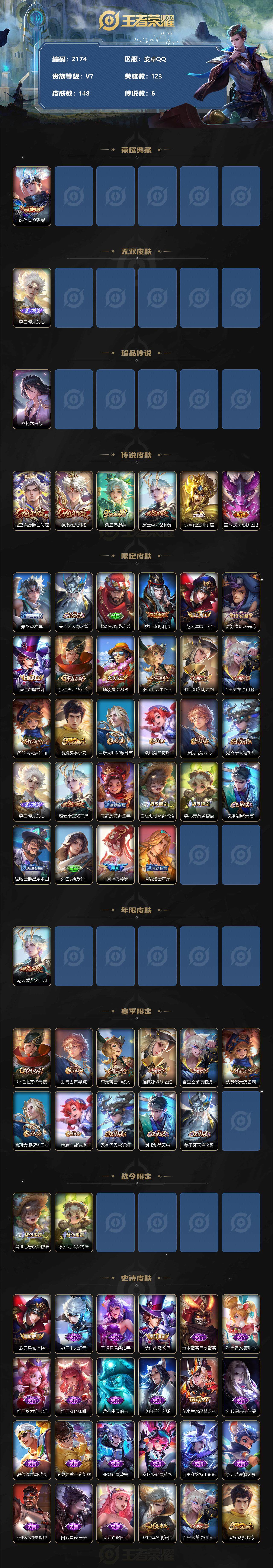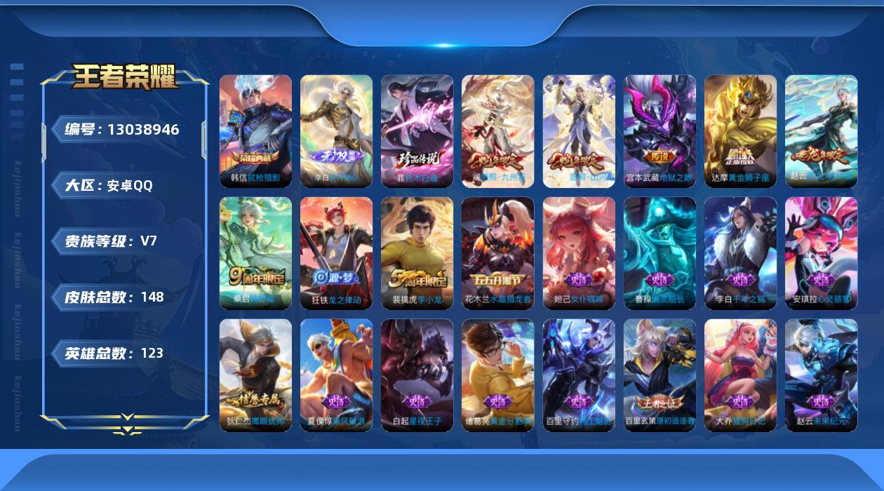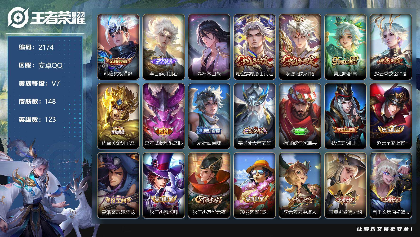 [13038946]安卓Q-V6-最强王者段位-123英雄-148皮肤-1典藏-0珍品无双-1无双-1珍品传说-6传说-33史诗