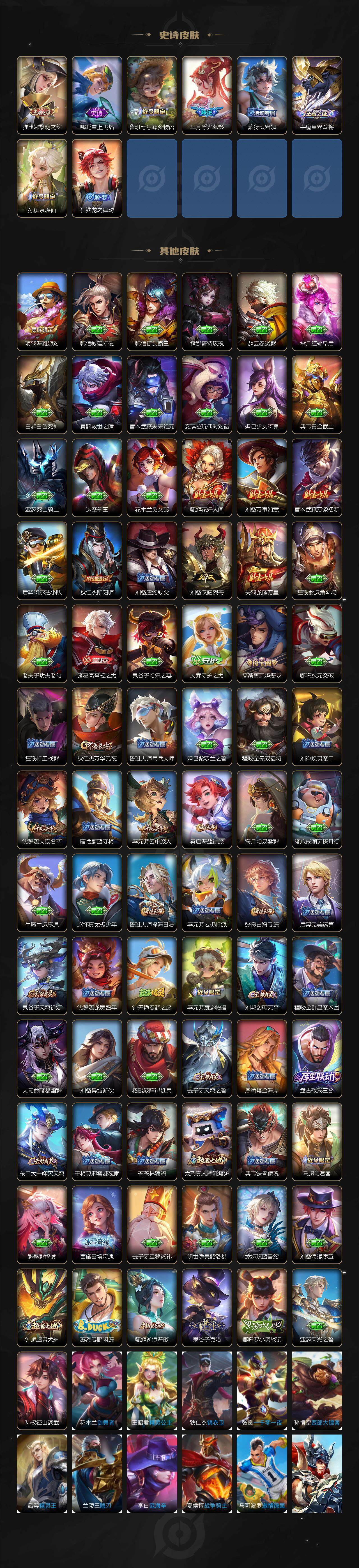 【史诗皮肤】:赵云皇家上将,赵云未来纪元,王昭君偶像歌手,狄仁杰魔术师,宫本武藏鬼剑武藏,孙尚香水果甜心,妲己魅力维加斯,妲己女仆咖啡,曹操幽灵船长,李白千年之狐,花木兰水晶猎龙者,刘邦德古拉伯爵,夏侯惇乘风破浪,诸葛亮黄金分割率,亚瑟心灵战警,安琪拉心灵骇客,百里守约特工魅影,李元芳逐浪之夏,程咬金功夫厨神,白起星夜王子,大乔猫狗日记,狄仁杰鹰眼统帅,百里玄策原初追逐者,裴擒虎李小龙,雅典娜黎明之约,哪吒雪上飞焰,鲁班七号蔬乡物语,芈月浮光幕影,蒙犽顽岩魄,牛魔星界战将,孙膑茶境仙,狂铁龙之律动