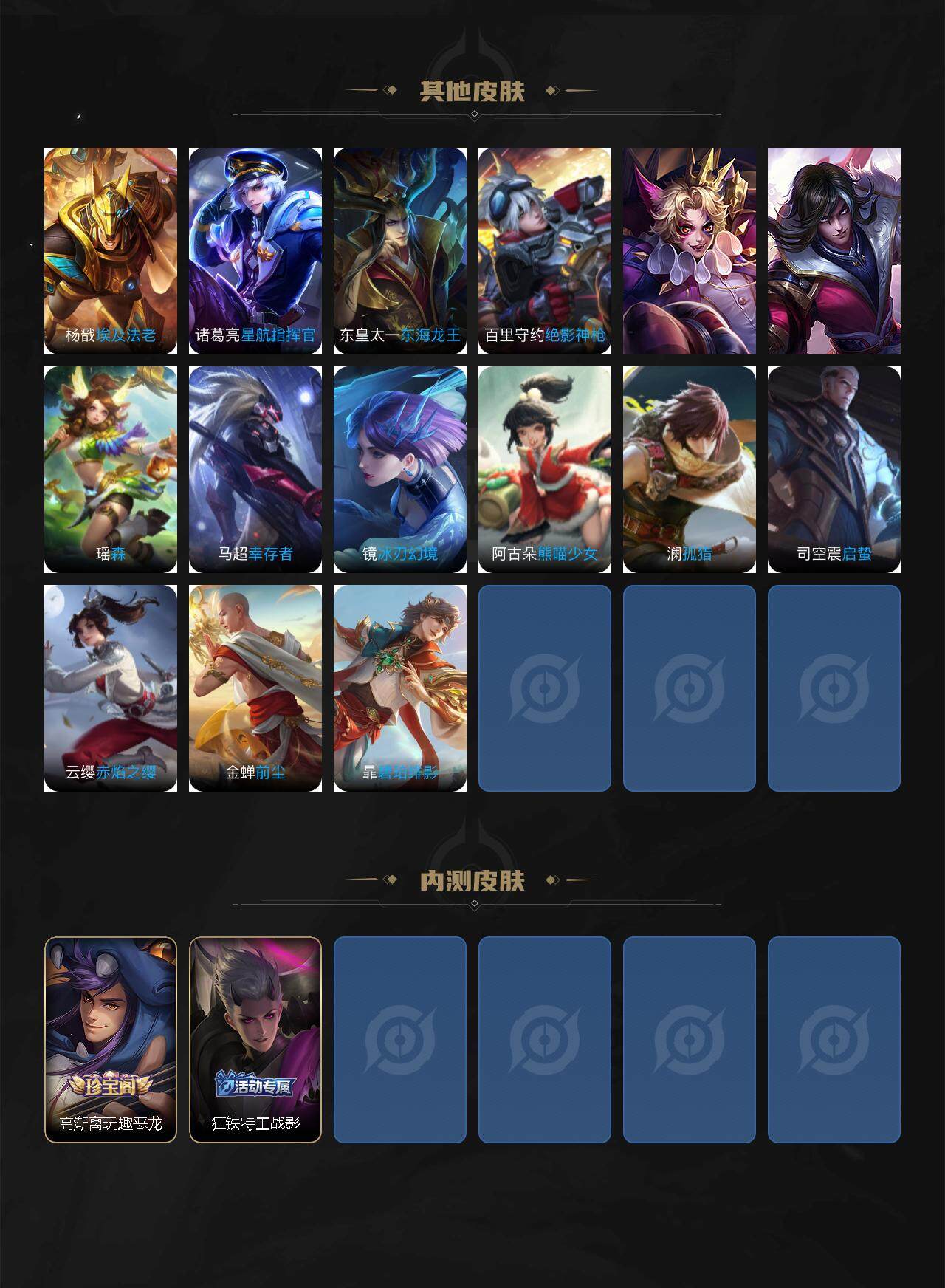 【其他皮肤】:项羽海滩派对,韩信教廷特使,韩信街头霸王,露娜哥特玫瑰,赵云忍炎影,芈月红桃皇后,白起白色死神,扁鹊救世之瞳,宫本武藏未来纪元,安琪拉玩偶对对碰,妲己少女阿狸,典韦黄金武士,亚瑟死亡骑士,达摩拳王,花木兰兔女郎,甄姬花好人间,刘备万事如意,宫本武藏万象初新,后羿阿尔法小队,狄仁杰阴阳师,刘备纽约教父,刘备汉昭烈帝,关羽龙腾万里,狂铁命运角斗场,老夫子功夫老勺,诸葛亮掌控之力,鬼谷子幻乐之宴,大乔守护之力,高渐离玩趣恶龙,哪吒次元突破
