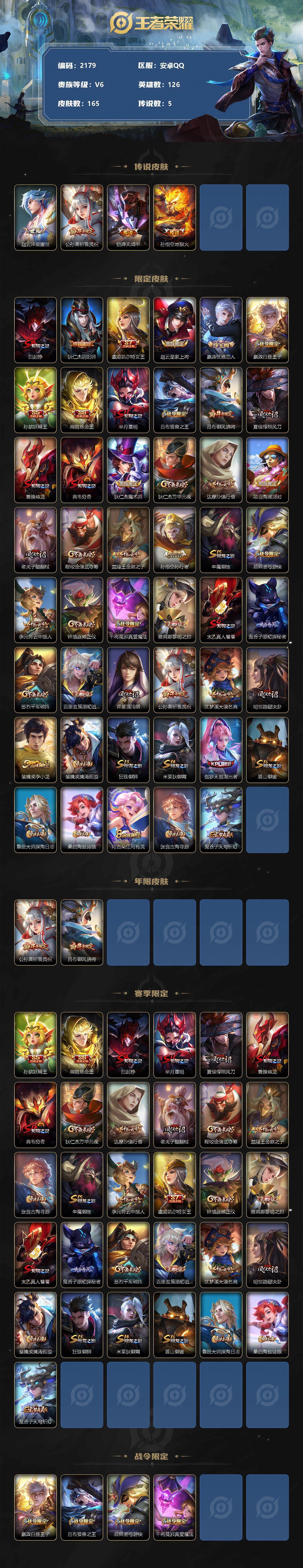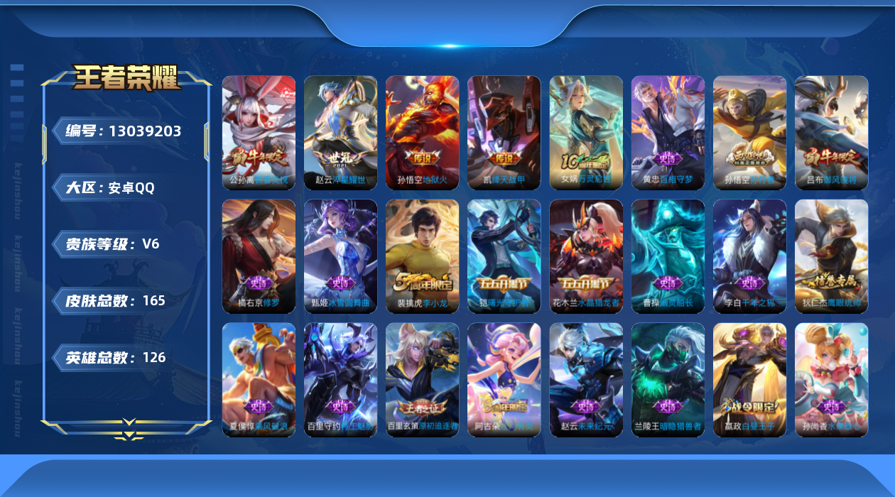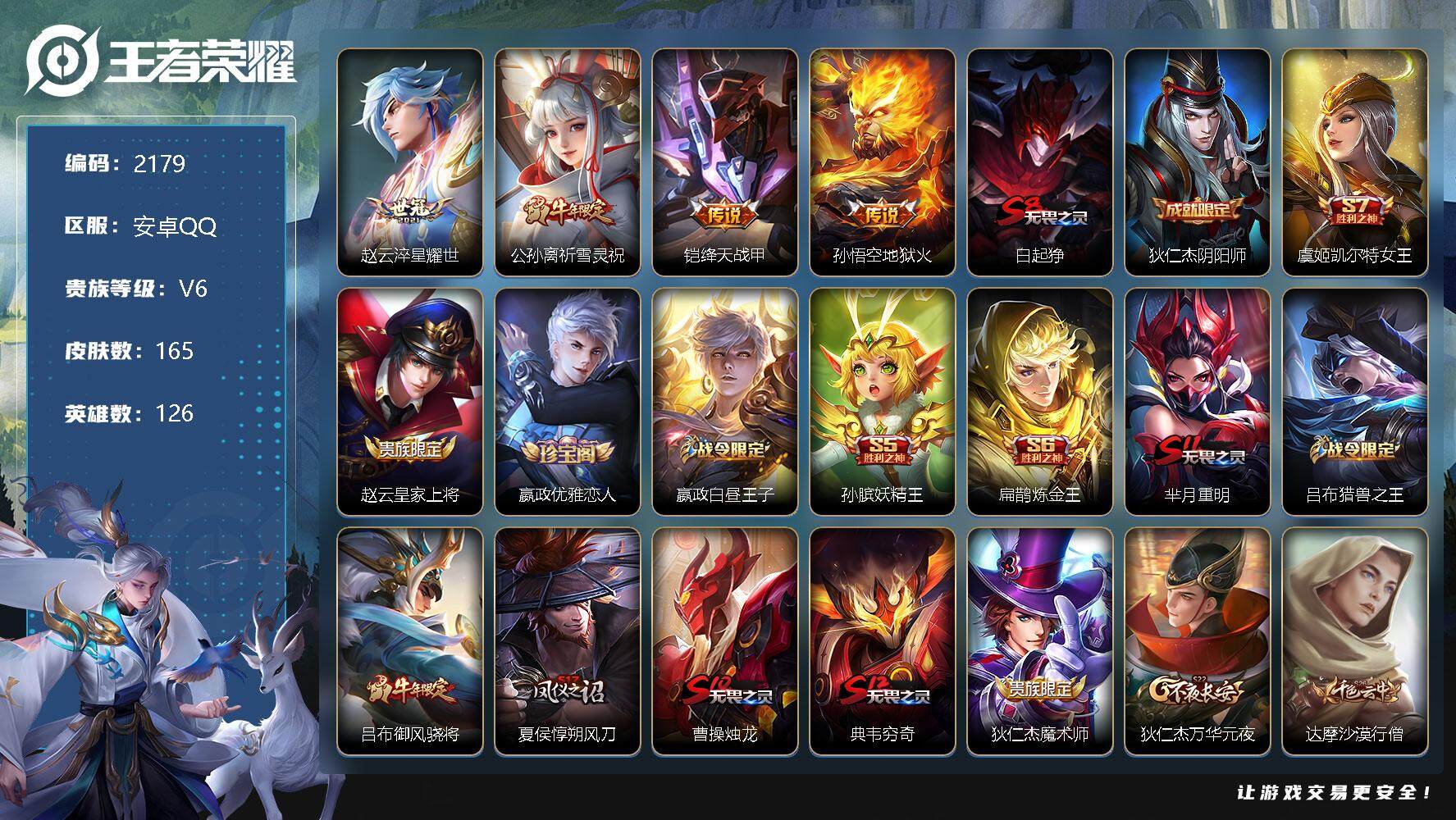 [13039203]安卓Q-V6-最强王者段位-126英雄-165皮肤-0典藏-0珍品无双-0无双-0珍品传说-5传说-38史诗